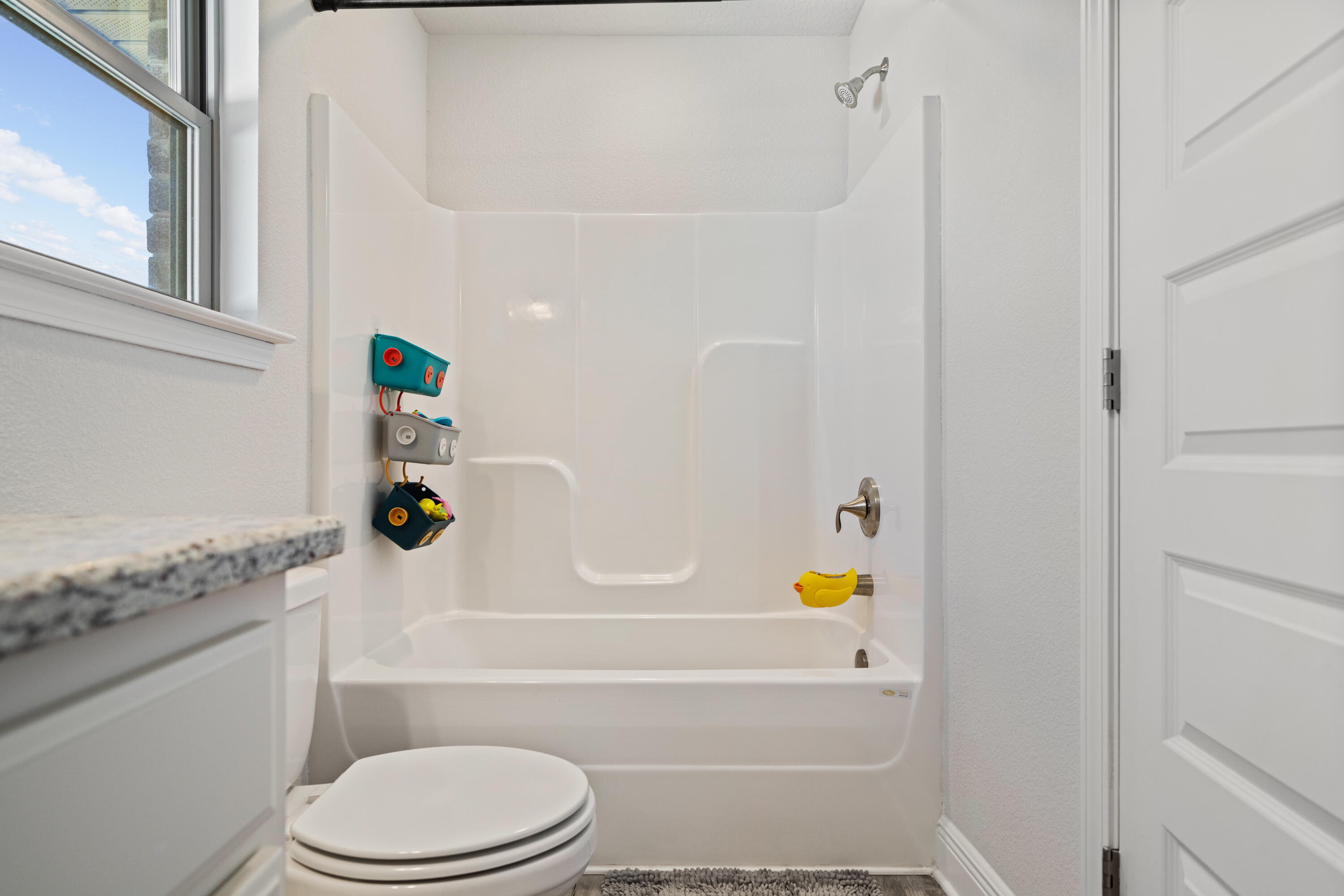 Step outside to a 14' × 16' covered rear porch overlooking a fully sodded and landscaped yard with automatic timed irrigation. The spacious primary suite offers a garden tub, separate tiled shower, double vanities, and a large walk-in closet. Bedrooms 3 and 4 share a convenient Jack-and-Jill bath, providing privacy and functionality for family or guests.