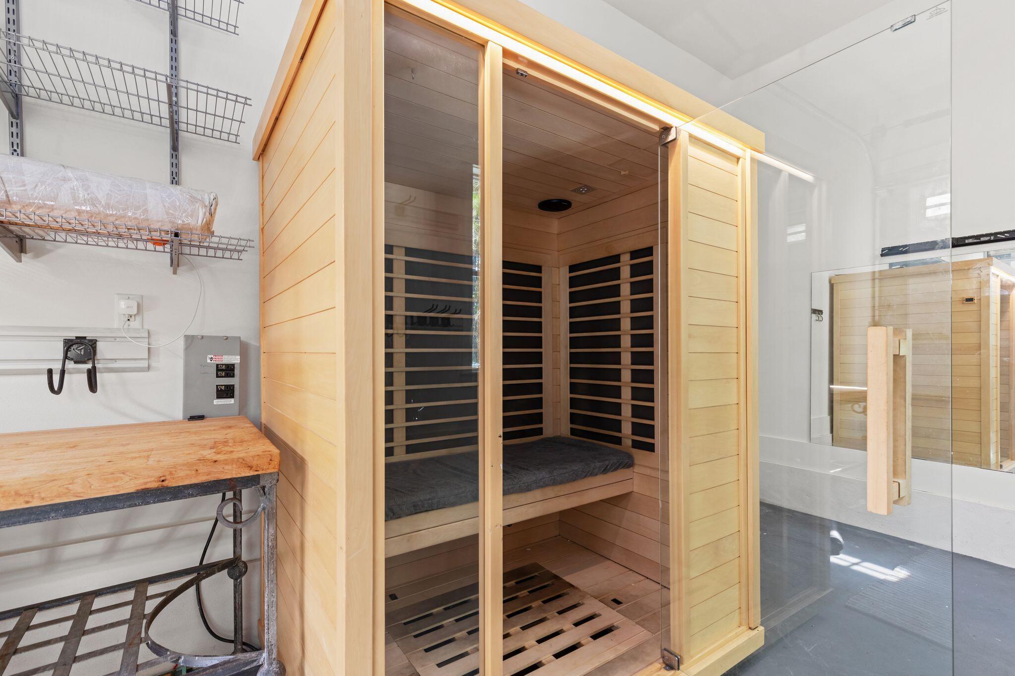 A notable highlight of the home is its extensive wellness package. Whole-home air filtration, UV purification, water filtration, built-in dehumidifiers, and a private sauna create a clean, refreshing indoor environment year-round an uncommon upgrade in the community.
