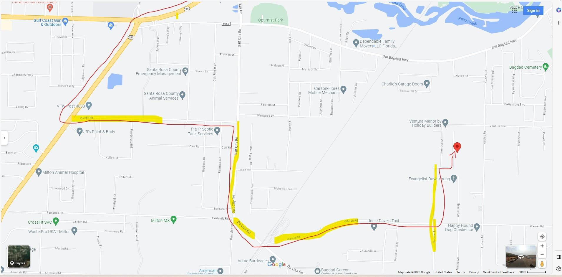 ''From I-10 East'', to Garcon Point Rd (Santa Rosa Co.) Take exit 26 from I-10 follow Garcon Point Rd to left on Warren Rd. to right on Scooter Lane to right on June Bug Dr. ...OR, if coming from Pace Hwy 90 area: Take Avalon to left on Carroll Rd., to right on Galt City Rd which curves left into DaLisa Rd. Turn left on Warren Rd to left on Scooter Ln. and right on June Bug Drive.