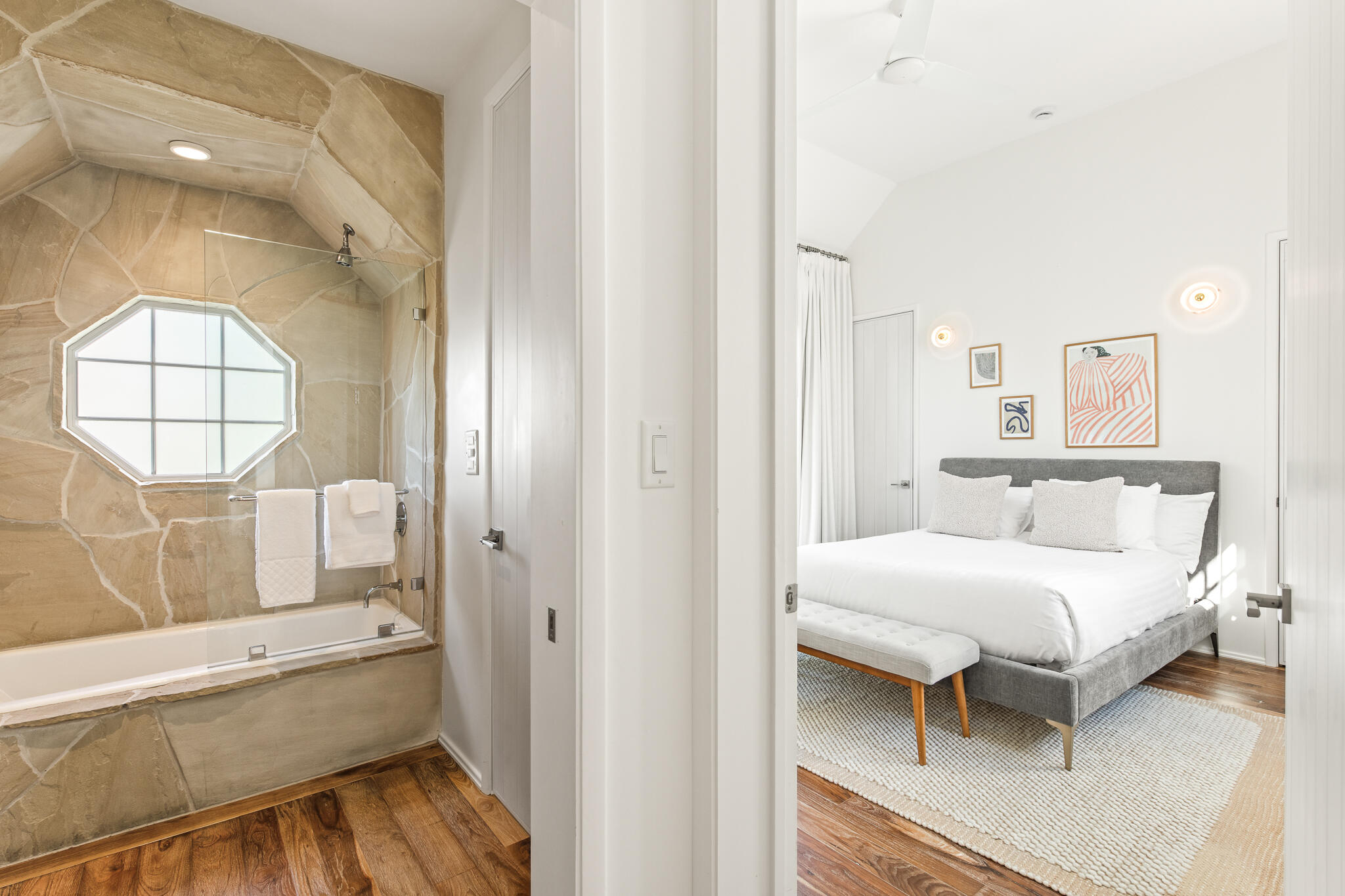 Custom-designed by Khoury Vogt Architects, this Alys Beach home overlooks the quiet greenspace of Arboleda Park and combines architectural detail with everyday livability. A two-story vaulted loggia with a wood-burning fireplace connects the private courtyard directly to the park, while bi-folding doors create a seamless indoor-outdoor flow through the main living, dining, and kitchen areas. The second floor offers three bedrooms, a bunk alcove, and multiple rooftop terraces with views of the park and the signature white rooftops of Alys Beach. Designed for both privacy and connection, the home includes a two-car garage and is ideally located between Caliza Pool, Zuma Wellness Center, and the Town Center, with convenient access to the beach via Castle Harbour Drive. Elegant design, thoughtful layout, and a rare combination of space and setting define this exceptional Alys Beach property.
