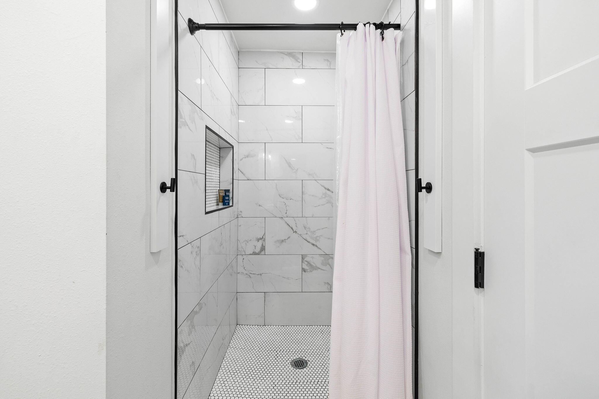 Unit 3 reflects the same level of thoughtful craftsmanship with a bright, modernized layout curated for both comfort and coastal style. The entry corridor is anchored by a beautifully redesigned kitchen featuring contrasting custom cabinetry, quartz countertops, a striking backsplash, and a new stainless-steel appliance package. A first-floor guest suite provides exceptional convenience with a queen and full bed, floating vanity, and private ensuite. Upstairs, the primary suite offers a king bed, a dedicated workspace tucked into a quiet nook, and a private terrace ideal for morning coffee or evening cocktails.