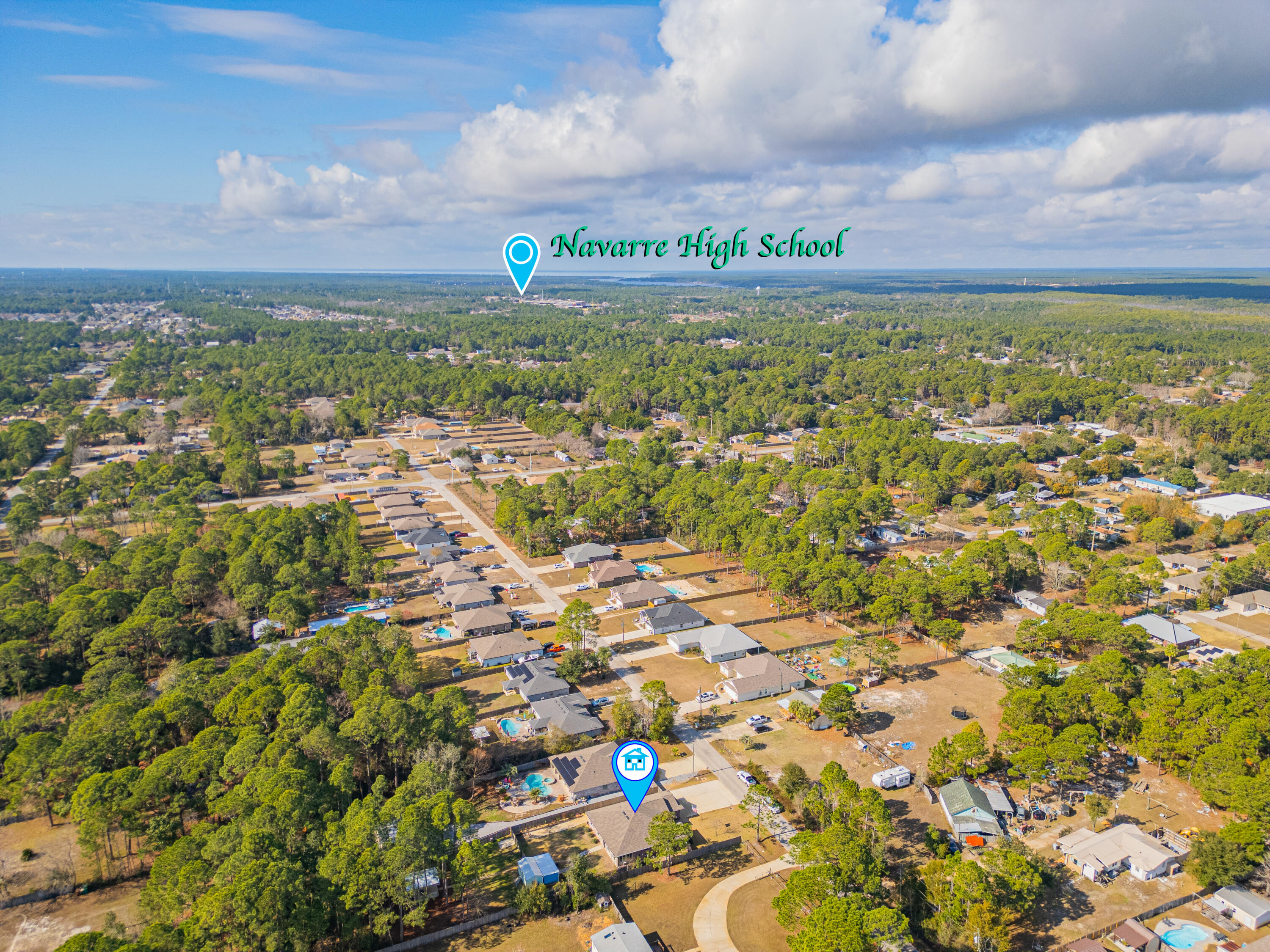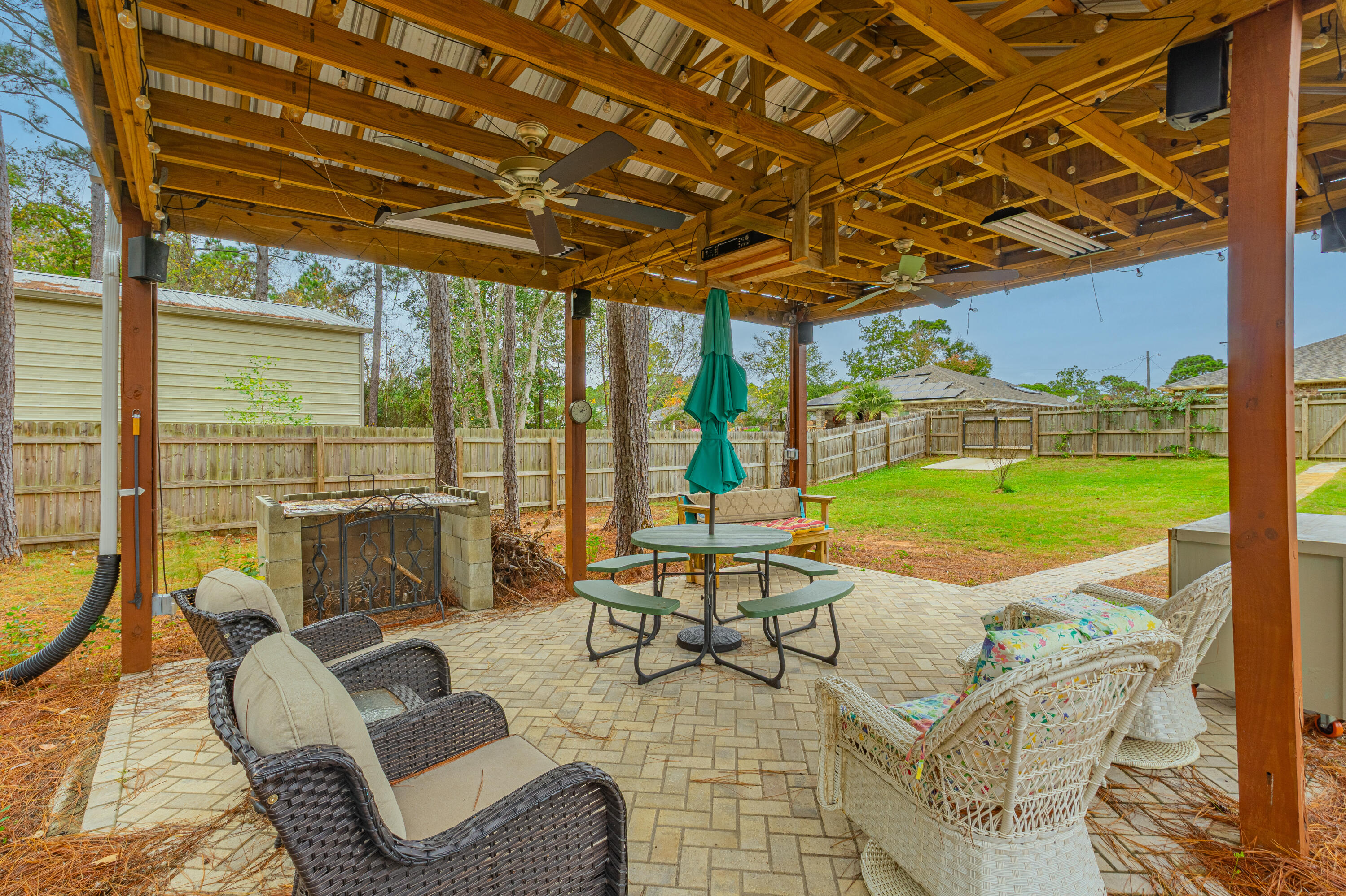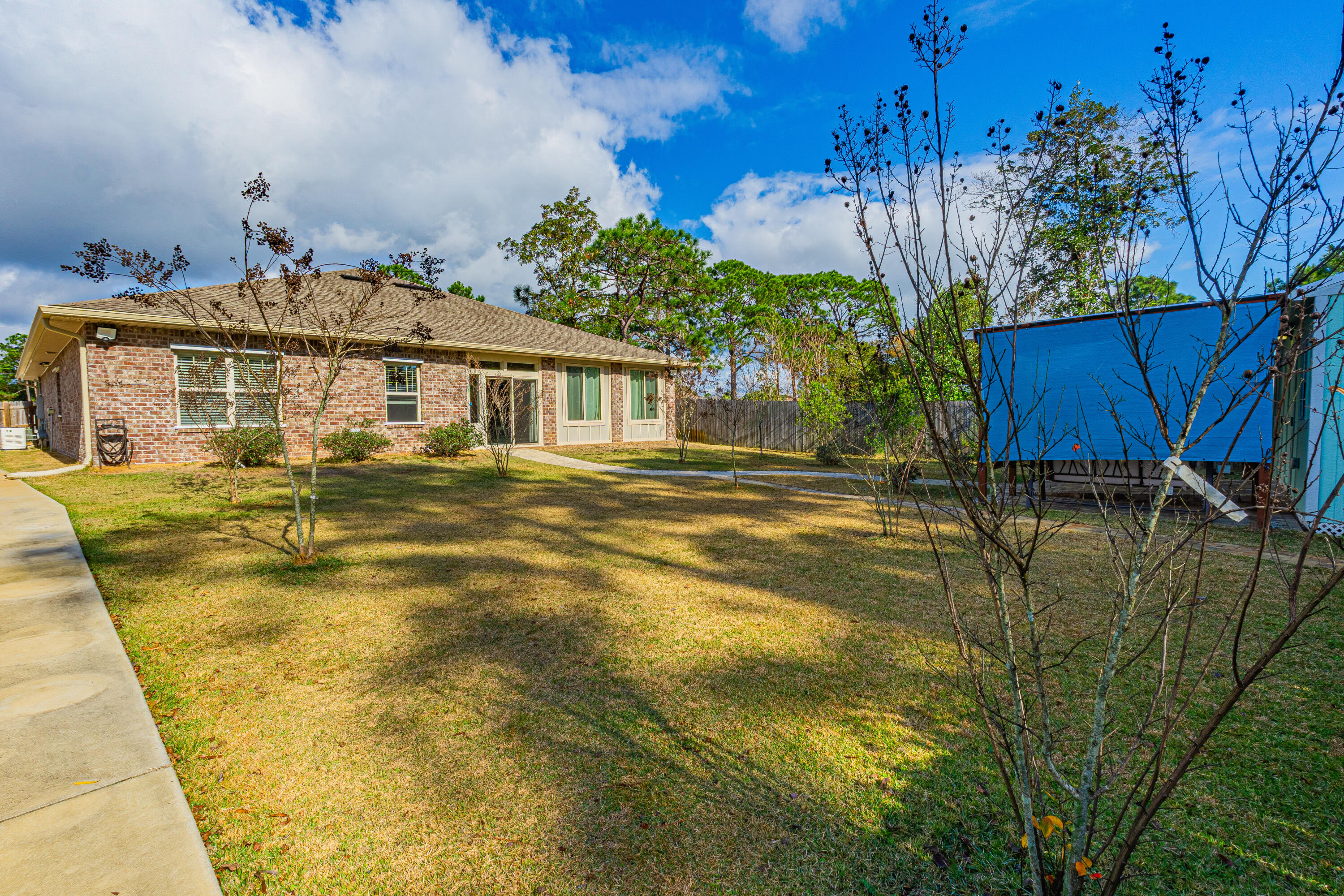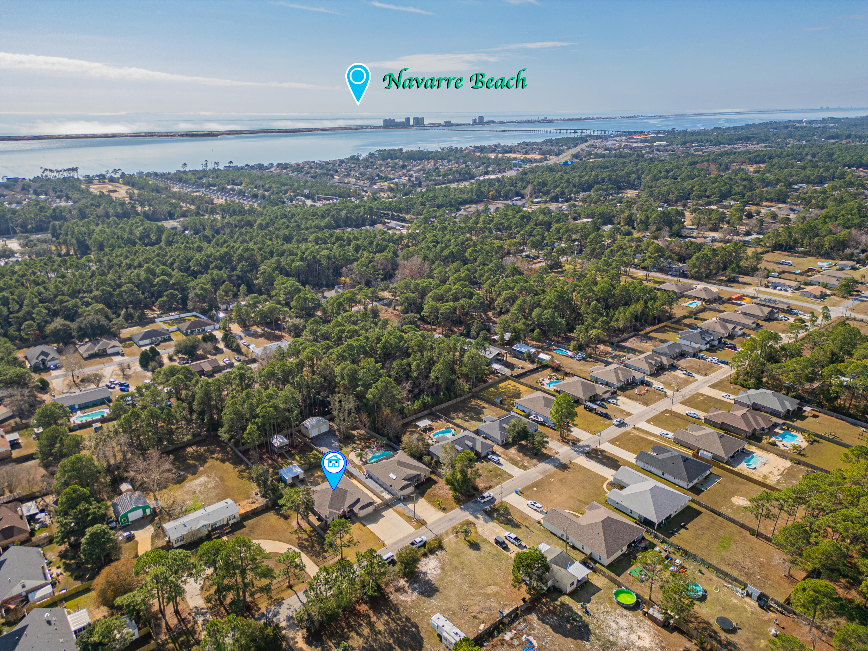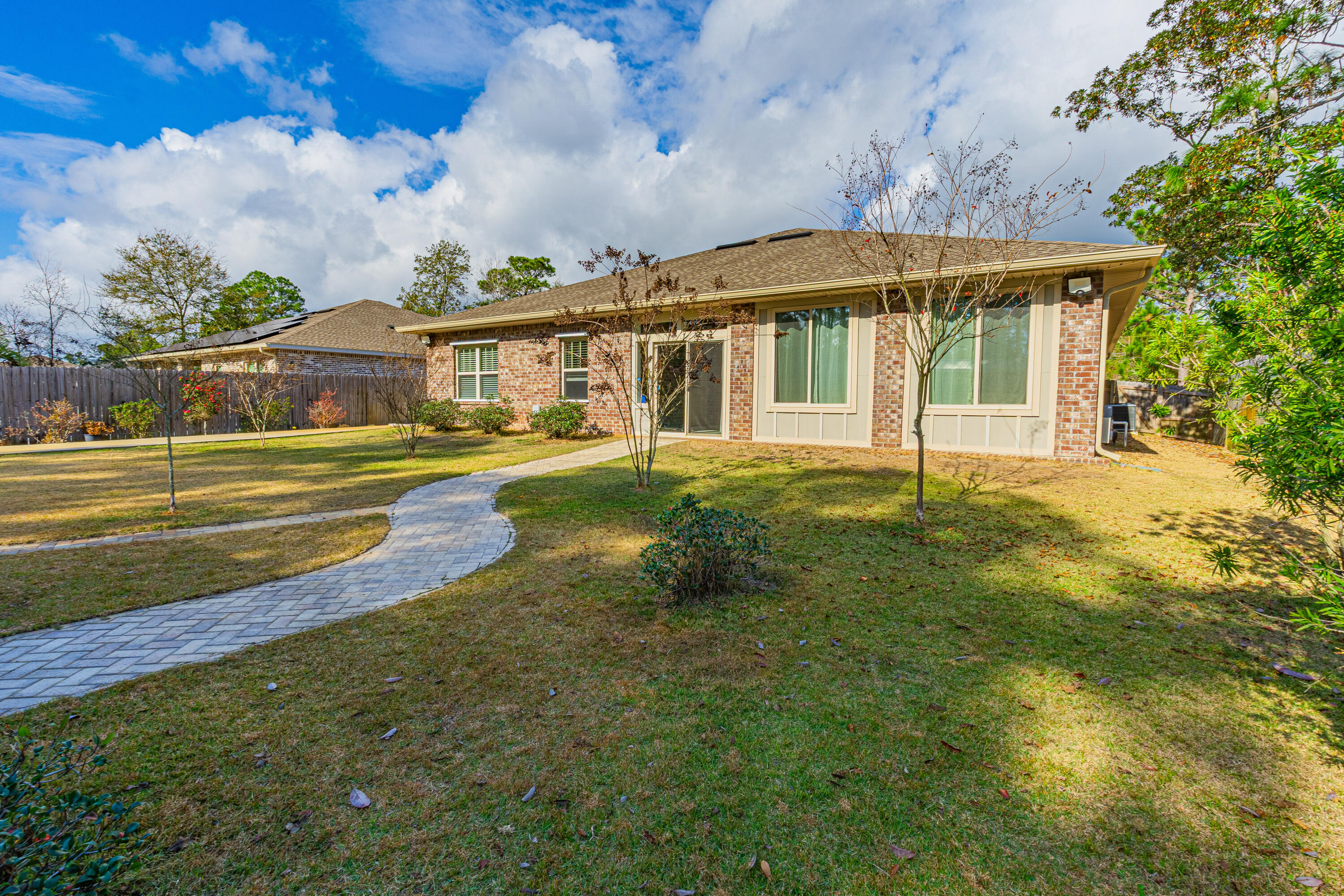 Exceptional home located in prime East Navarre. The home offers an open split floor plan and has been updated inside and out. The Shaker style cabinet's in the kitchen and baths have been professionally painted along with new granite in Kitchen. The sellers enclosed the covered patio to make it a large Florida room, with tile floors, ceiling fan and a plug in Air/Heat system. The interior offers LVP flooring in the common areas, bedrooms, tile in the bathrooms and laundry room. Wide baseboard, crown molding, and tray ceiling with crown molding accents in the primary bedroom, dining, and foyer. They also added a tankless hot water heater. The exterior has the timeless durability of brick, cement fiber board accents, and an architectural shingled roof. Complete with a lawn pump/sprinkler system, fenced backyard. They also added extra driveway that go all the way to the back fence for RV parking with electrical hookup, an EV plug in the garage, a Generac generator, a whole house water filtration system, a workshop with electric, brick pavers that lead to the workshop with a seating area, and leads beyond the fence to a cover Pergola with electric and a fireplace area. The lot goes beyond the Pergola area.