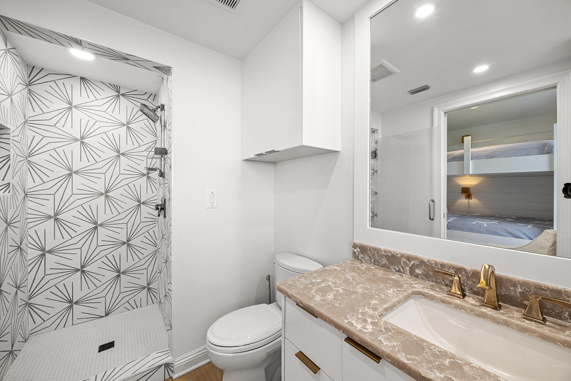 Two additional guest suites overlook the bay, each with a renovated ensuite. Bedroom #2 includes custom built-in queen bunk beds with cubbies, lighting, drawers, and floor-to-ceiling cabinetry. The powder room has also been thoughtfully updated with a quartz vanity, under-cabinet lighting, and designer wallpaper.