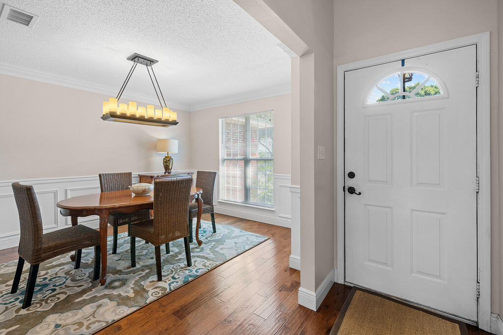 For more formal occasions, the elegant dining room offers a refined setting with wainscoting, crown molding, and a contemporary chandelier. The large window brings in plenty of daylight, highlighting the hardwood floors and creating a warm, welcoming atmosphere.