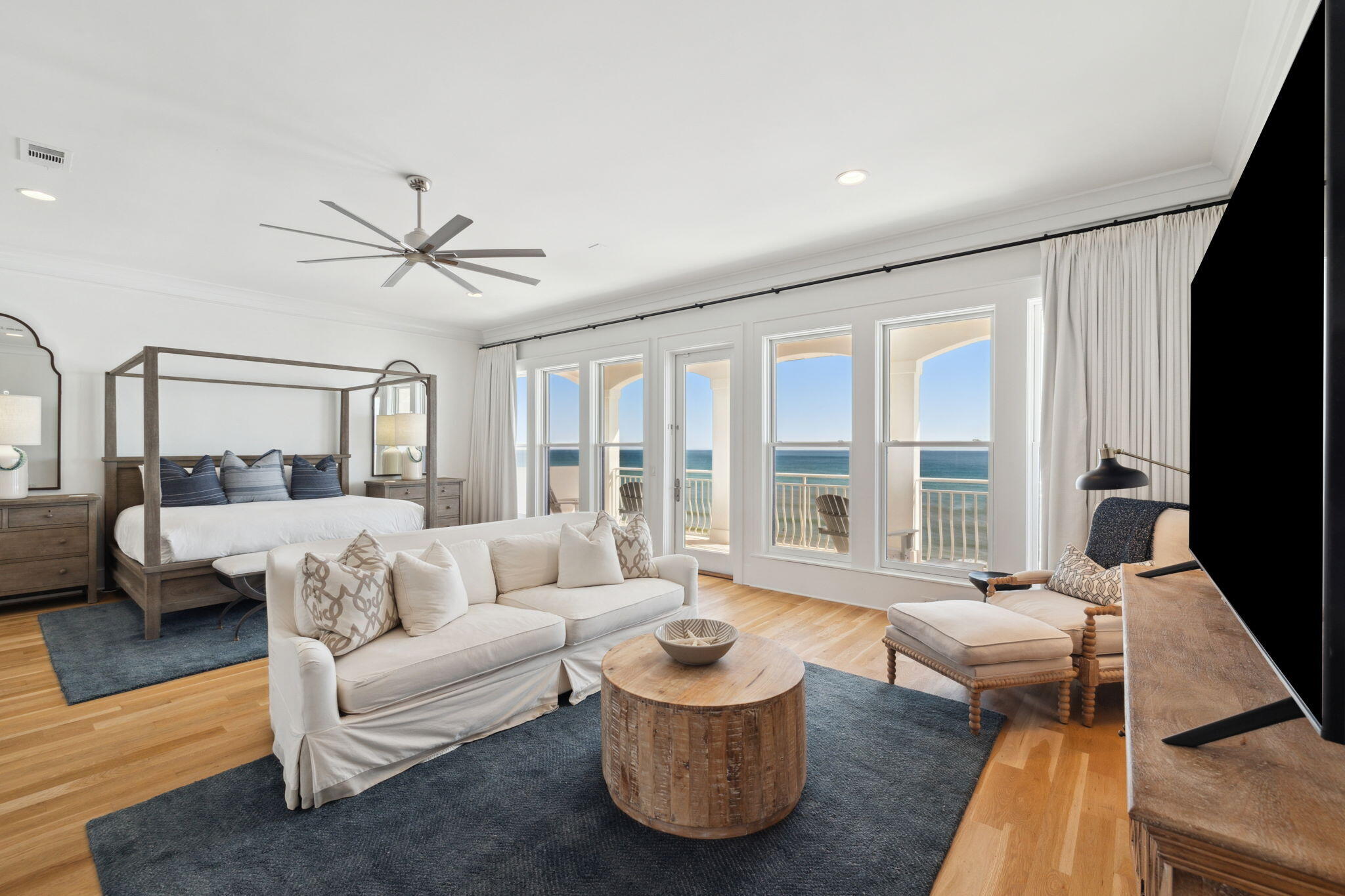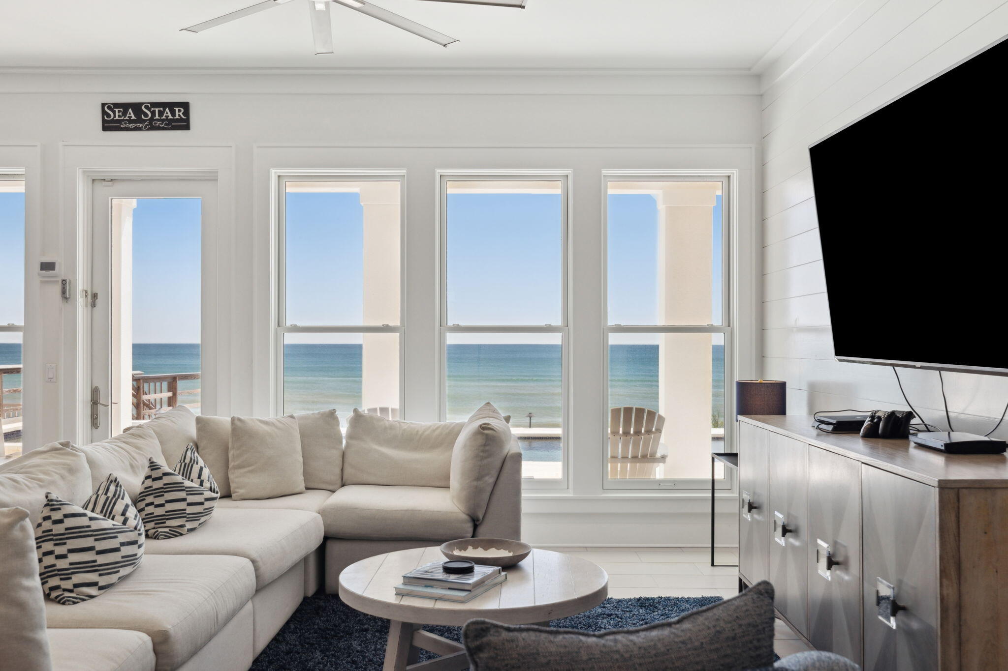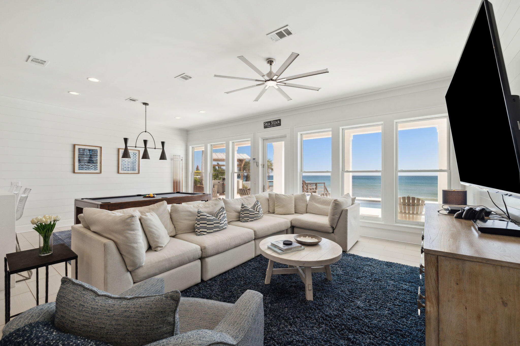 Perched along one of the most exclusive stretches of Scenic Highway 30A, 8266 E Co Hwy 30A is a masterfully curated Gulf-front estate offering 80 feet of pristine beach frontage and nearly half an acre of seclusion on the coveted east end. A rare legacy offering, this impeccably appointed residence marries timeless coastal design with the serene cadence of the Emerald Coast.With panoramic Gulf views from nearly every vantage point and a proven track record of strong rental income -- over $729K in peak year performance -- this property offers a compelling blend of investment and lifestyle. Designed for elevated entertaining and effortless relaxation, the first floor welcomes with a bespoke entertainment lounge, complete with arcade games, billiards, and a plush cinema-style seating area. Two luxurious guest suites, a fully stocked kitchenette featuring a Miele coffee station, and direct access to the private pool and spa create a five-star guest experience.