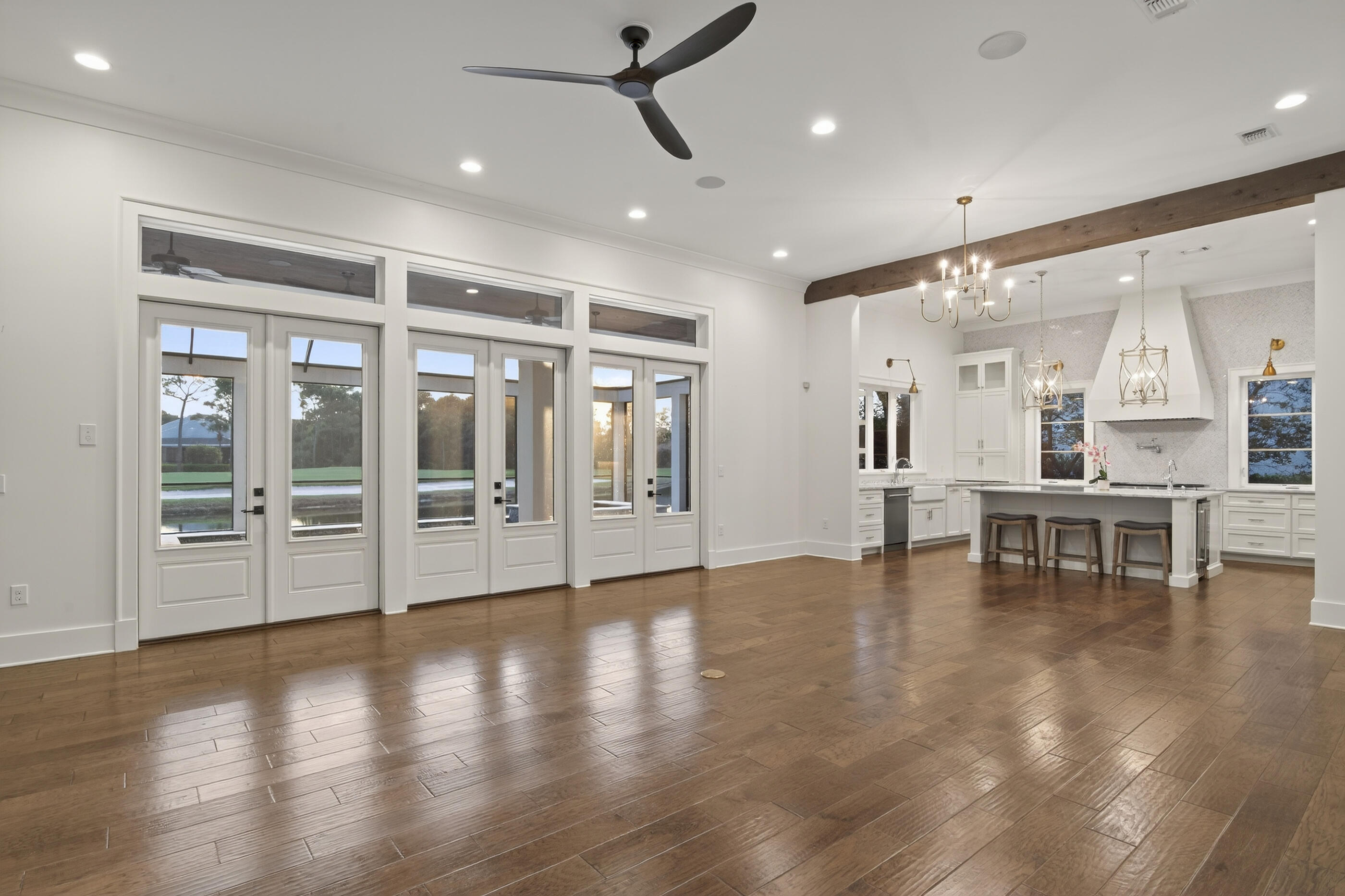 Discover the perfect fusion of modern elegance and artistic coastal contemporary design in this remarkable lakefront residence. This newly built home sits on one of the premier lots in Regatta Bay and offers both lake and golf course views. The home is located within the prestigious gated golf and boating community of Regatta Bay. Completed in 2016, this meticulously designed home showcases an open floor plan with the majority of the home located on the main level. The thoughtfully arranged layout features four bedrooms and four and a half bathrooms, enhanced by clean lines and exquisite designer finishes throughout. This designer finished property boasts remarkable features, including soaring 12-foot ceilings on the main level and an oversized three-car garage with ample parking. The interior showcases elegant hardwood flooring throughout, leading to a spacious living room that is anchored by a contemporary gas stone fireplace. This inviting space offers seamless access to an expansive screened lanai, showcasing 650 square feet of outdoor living space adorned with pecky cypress ceilings and beautiful views. The outdoor area is further complemented by a secondary gas fireplace, pool and hot tub, perfectly positioned to capture breathtaking western sunsets and picturesque views of the lake and multi award winning golf course. The designer kitchen is a culinary dream, with custom built cabinetry, Calcutta marble countertops, 60-inch Wolf gas range and a built-in Sub-Zero refrigerator. The kitchen flows effortlessly into the open dining room and includes an oversized pantry with premium storage options. The master suite radiates coastal charm with and a spa-like master bathroom complete with a luxurious soaking tub, dual vanities, chevron-pattern marble flooring, and an oversized walk-in shower adorned with hand-hewn beam accents and dual shower heads. The 13x16 master closet is a standout feature, offering direct access from the master suite and showcasing custom-built shelving along with a center island for optimal storage. Additionally, the laundry room conveniently connects to the master closet for enhanced functionality. On the second floor, you will find two additional bedrooms each with en-suite bathrooms, as well as a flex space. Regatta Bay is a serene, gated community that seamlessly blends golf and boating, offering a lifestyle that is truly unparalleled! The essence of the Regatta Bay Lifestyle revolves around convenience, allowing residents to easily access numerous enjoyable destinations within minutes via golf cart, including the beach! Within the community, residents can indulge in golf, swimming, tennis, pickleball, parks, playgrounds, the Regatta Bay Clubhouse, Legendary Marine, and Legendary Yacht Club. Furthermore, Regatta Bay features a private road that leads directly to the Destin Commons, where an array of popular retail stores for both men and women awaits, alongside a diverse selection of restaurants, Whole Foods, Bass Pro, Lowes, an AMC movie theater, and Uncle Buck's Bowling-all easily reachable by golf cart. Regatta Bay is centrally located offering easy access to the airport and only a few miles from Northwest Florida's finest hospital.