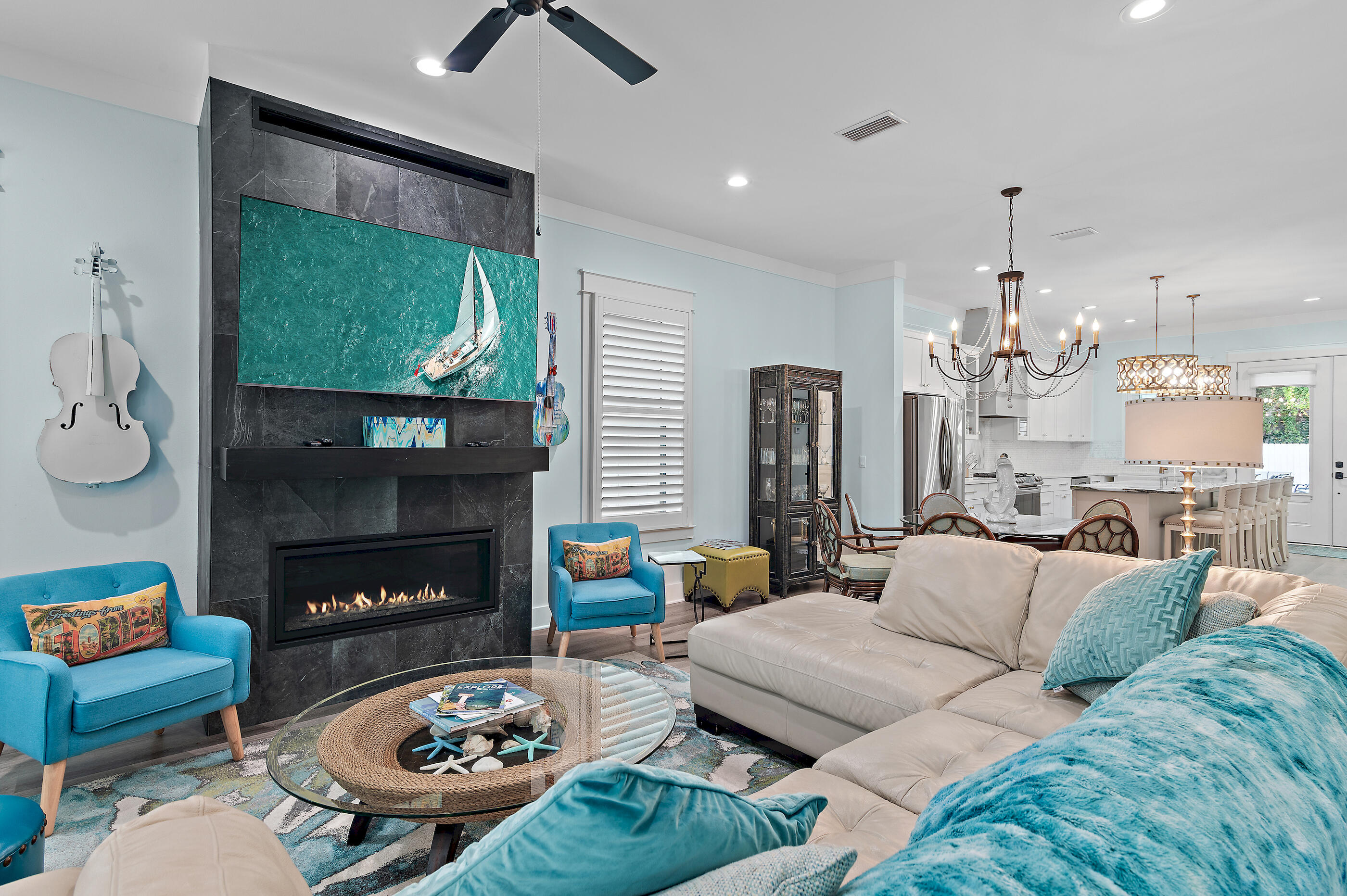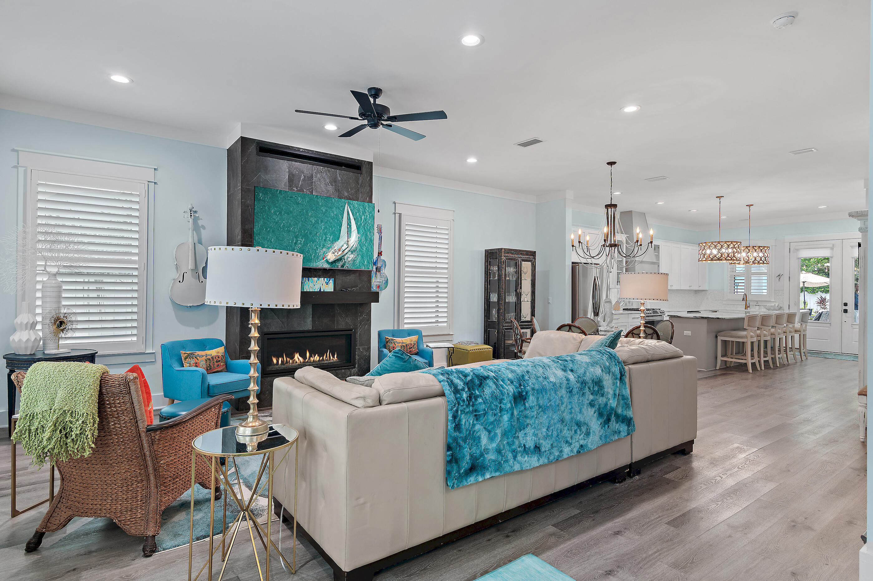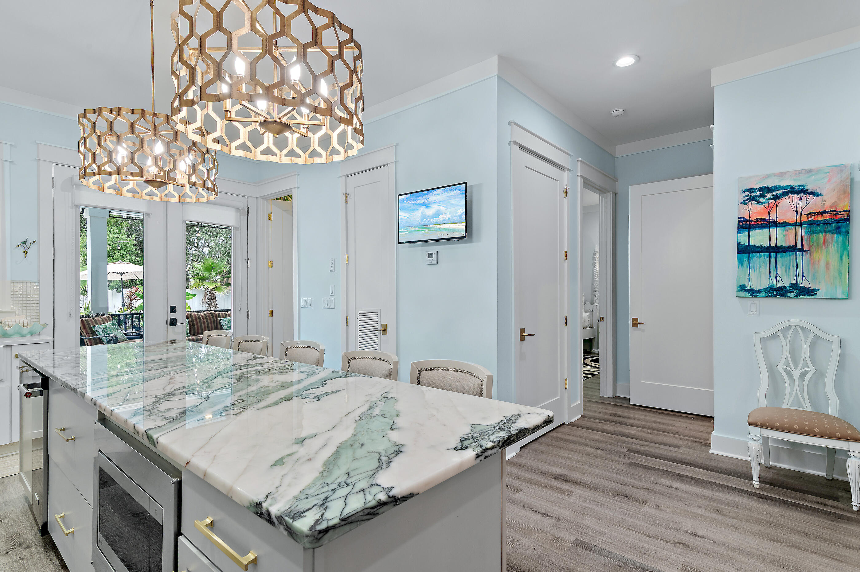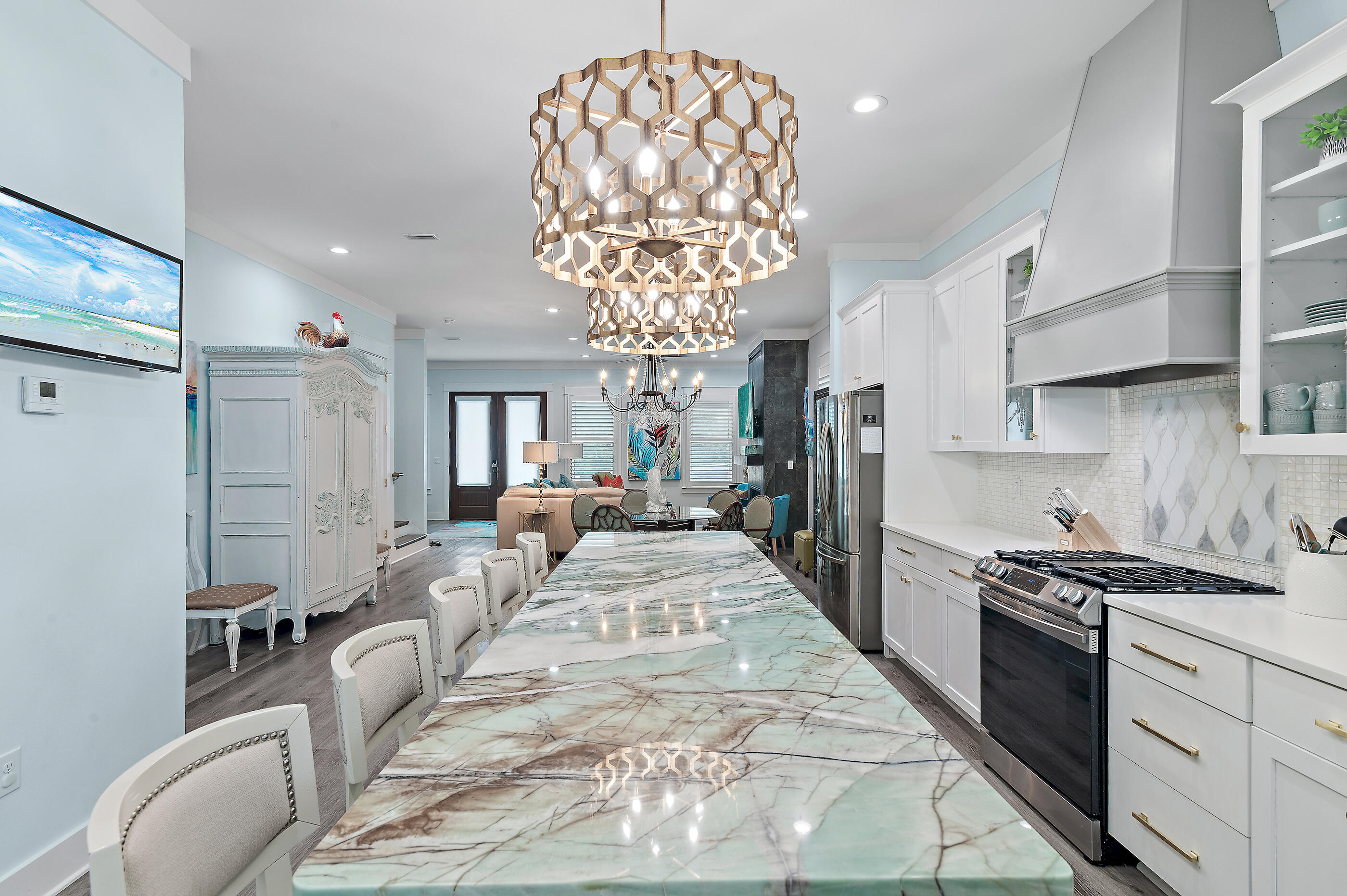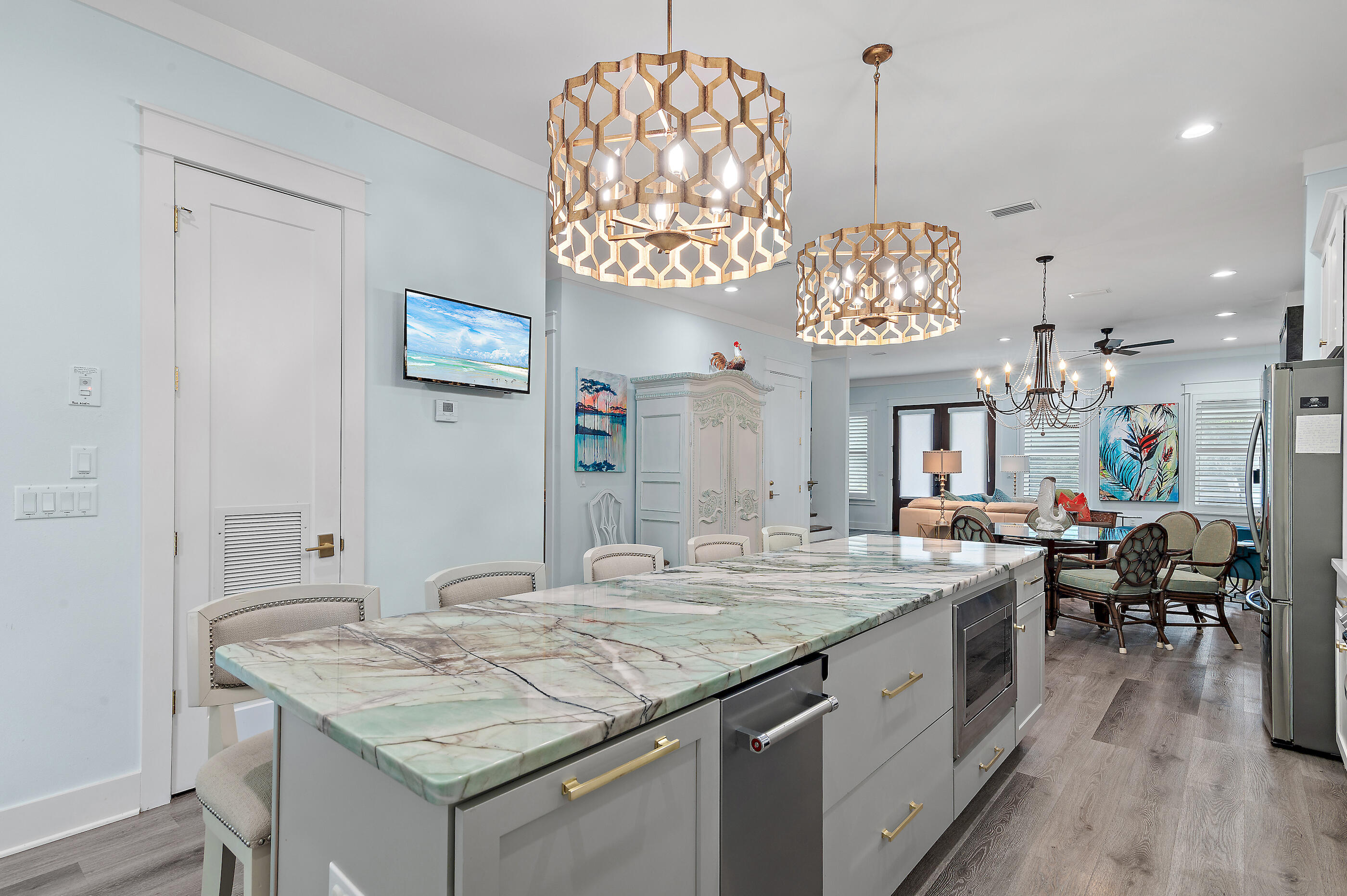 Welcome to Villa Dolce, a 3,074 sq ft luxury retreat in Seagrove, steps from Pelayo Public Beach Access. This custom-built 5-bed, 5.5-bath seamlessly blends modern elegance with coastal living. The 1st flr features an open-concept layout, including a chef's kitchen w/ top-of-the-line appl, quartz & granite c-tops, & gas range, spacious primary suite w/ walk-in closet, garden tub. The outdoor oasis offers a covered back porch & entertaining area, heated pool, spa, outdoor TV, firepit, grill, dining area, & outdoor shower, surrounded by lush landscaping & sprinkler irrigation system. Upstairs, 4 guest beds w/ensuite baths & 2nd living area provides space for family & guests. A large laundry room w/sink, 4x8 storage unit, hurricane-impact doors & windows. Close to restaurants & shopping