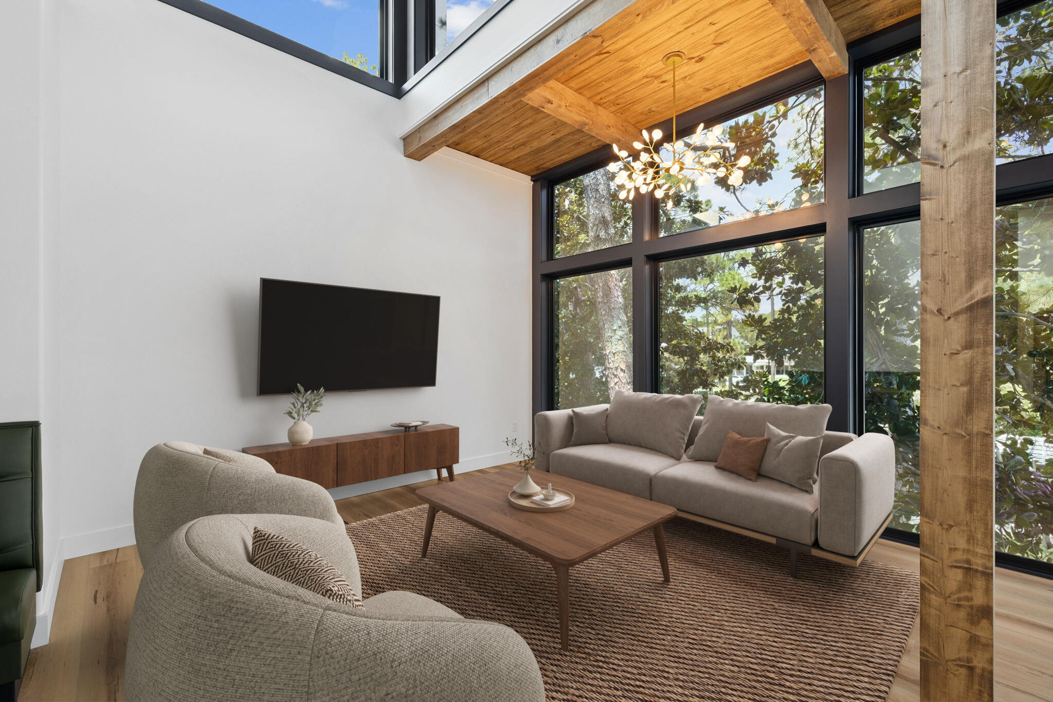 Set aside the Gulf of Mexico and one of 30A's rare coastal dune lakes, this newly constructed modern retreat offers a combination of water views and design details that's seldom found along 30A. Thoughtfully designed across three levels, this four-bedroom home features a private pool, expansive balconies with Ipe decking, and a first-floor lockout suite with its own kitchenette complete with an oven, dishwasher, microwave, and refrigerator, making it ideal for guests or short-term rental flexibility.Inside, the home showcases soaring ceilings, a beamed ceiling in the main living area, and an open-concept kitchen outfitted with quartz countertops, a large island, and premium appliances. Oversized Anderson windows flood the interior with natural light while framing the coastal surroundings. A Eurowall folding door on the first floor seamlessly opens the indoor living area to the outdoor pool deck, creating an exceptional entertaining space.