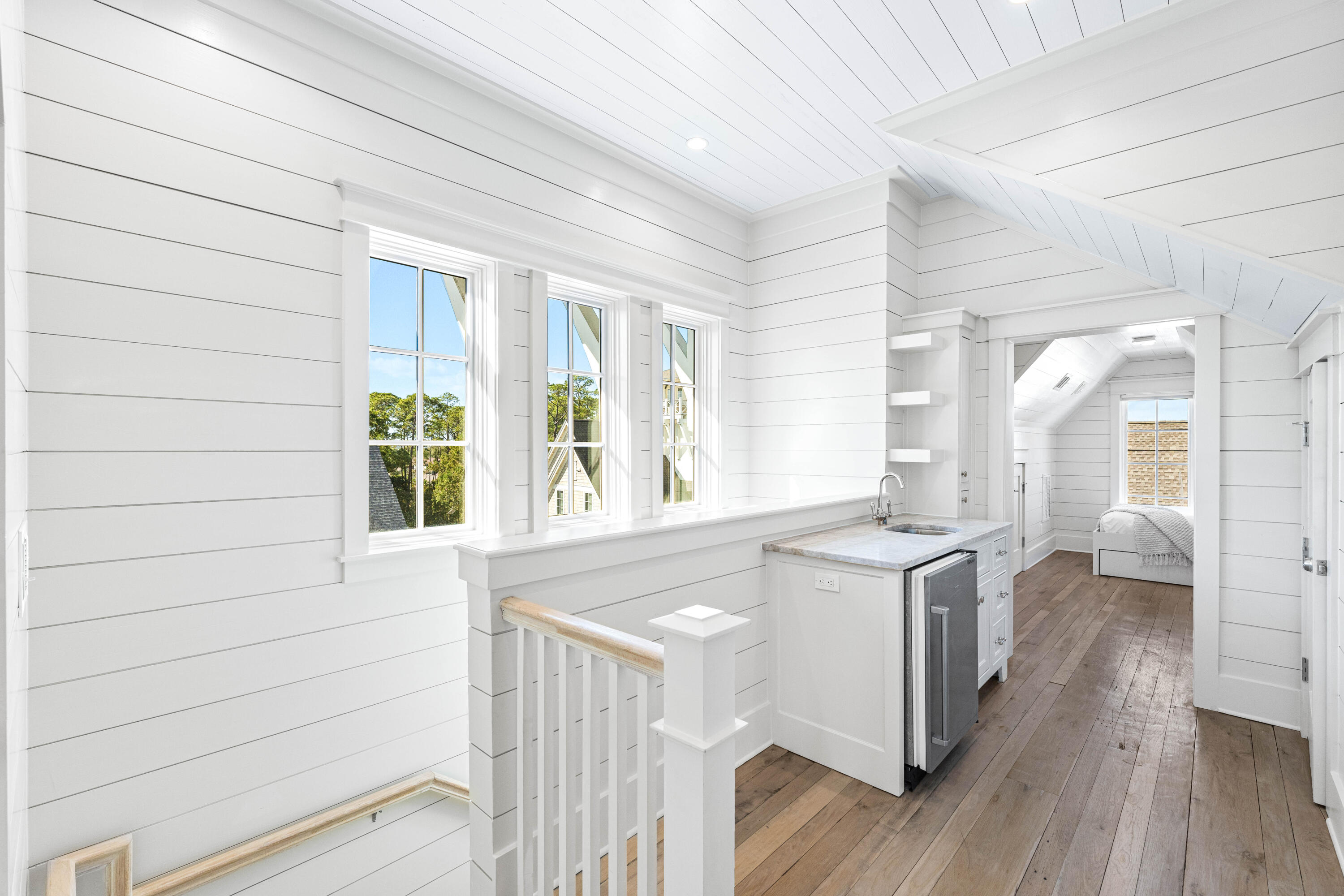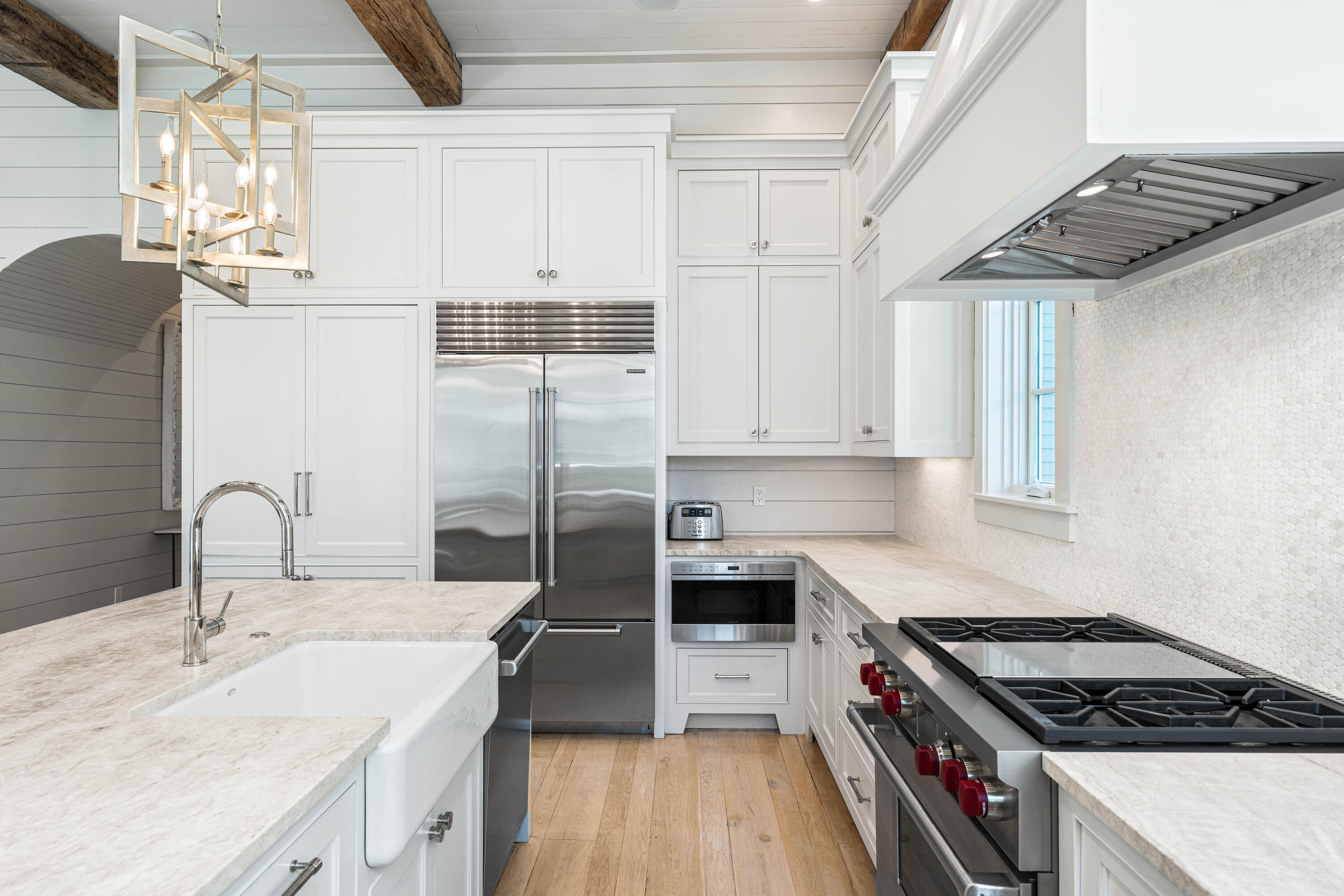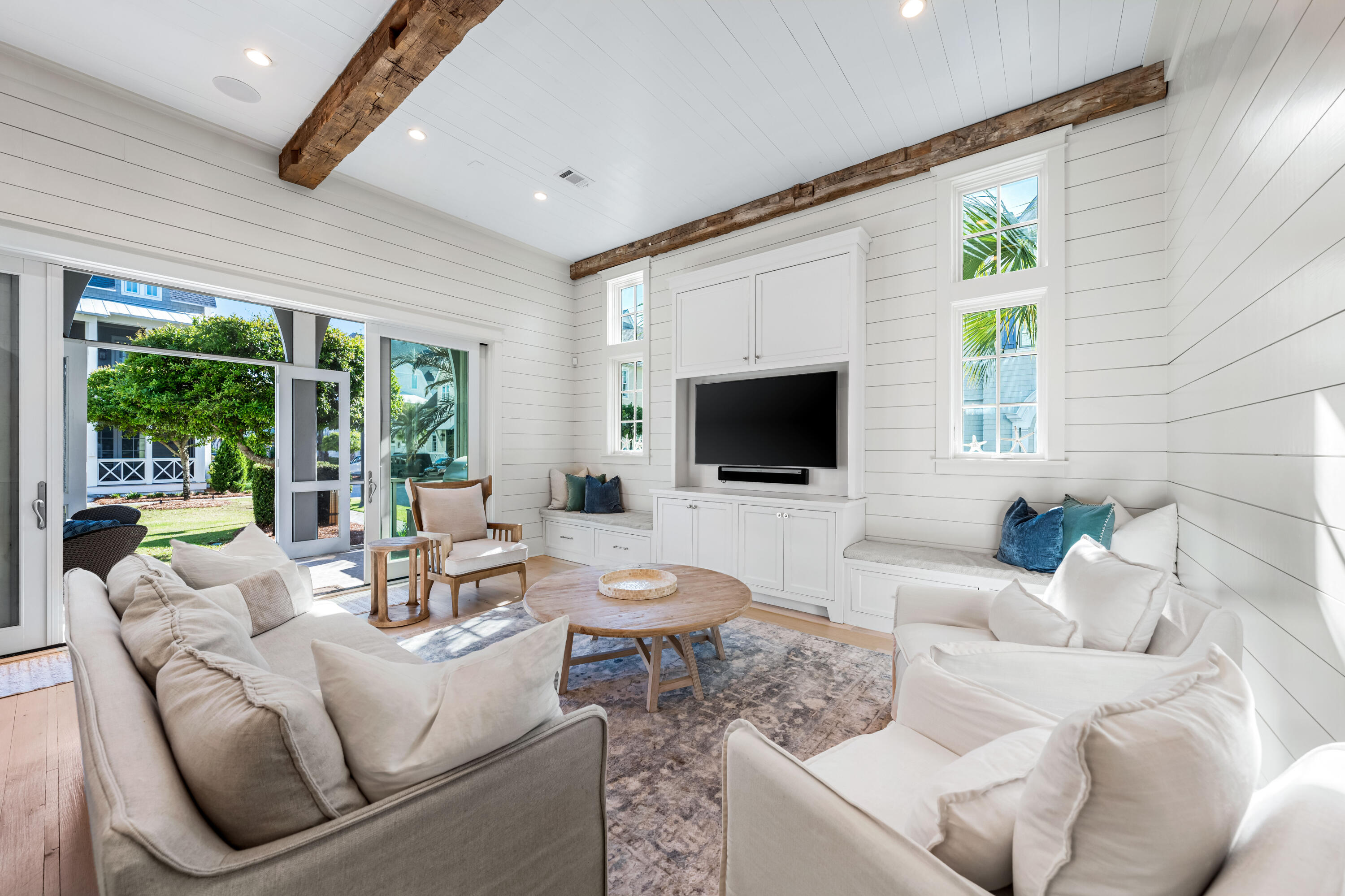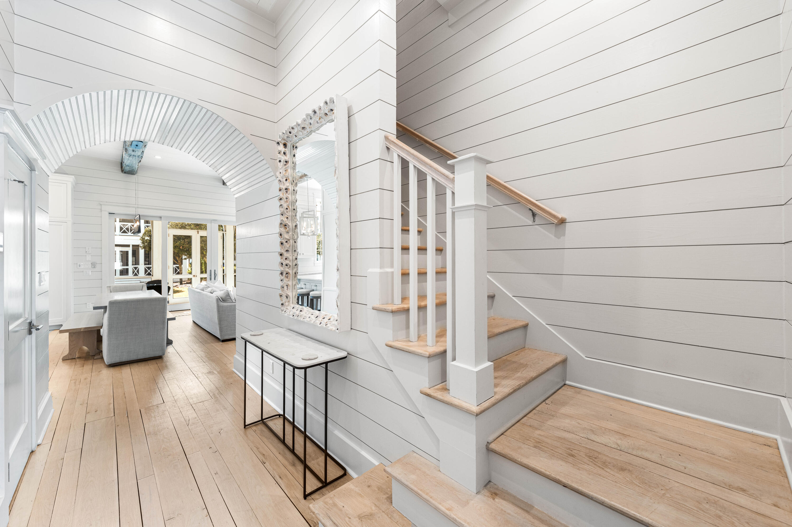 Welcome to 10 Rainer, an exceptional residence offering refined elegance, elevated design, and effortless access to the optional WaterSound Beach Club--just 600 feet away. Tucked behind the private gates of Grace Point and backing onto serene community green space, this home combines timeless coastal Nantucket architecture with sophisticated modern finishes. Upon entry, you're greeted by soaring 12-foot ceilings, shiplap walls, and rich hardwood flooring that flow seamlessly throughout. The main living space exudes warmth and comfort while offering ample room for entertaining. The gourmet kitchen is appointed with marble countertops, custom cabinetry, and high-end appliances--perfectly complemented by a summer kitchen on your screened-in porch with beverage cooler and ice maker for al fresco dining by your private heated pool.