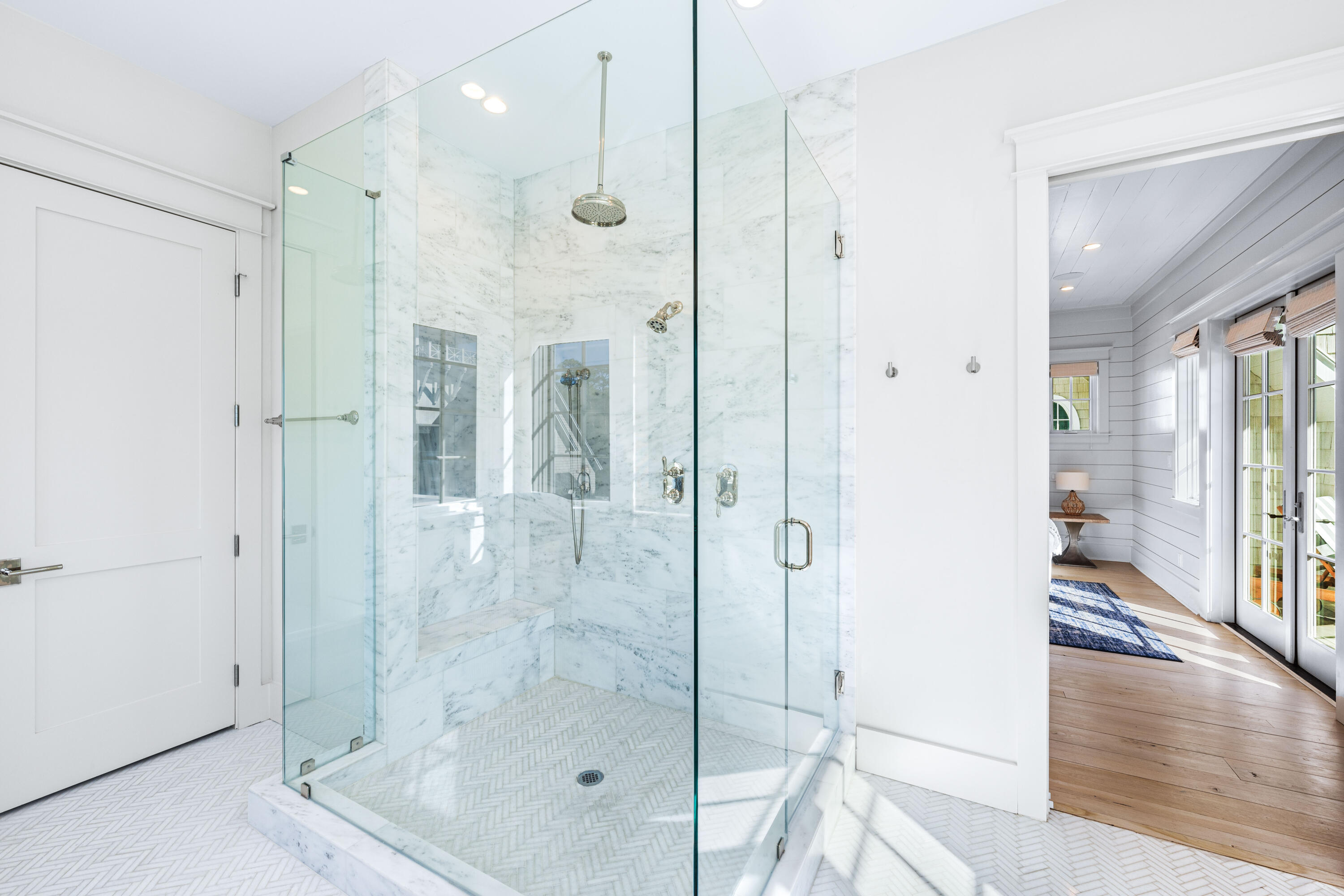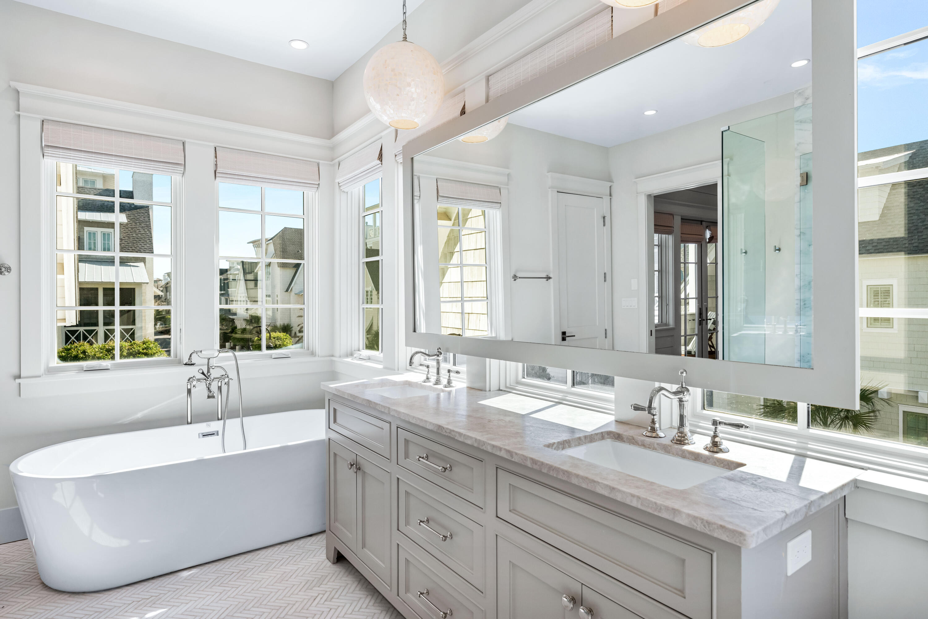 The primary suite, located on the second floor, is a sanctuary of its own with a private balcony, dual Carrera Marble vanities, a garden tub, and a generously sized walk-in showera spa-like escape after a day in the sun.