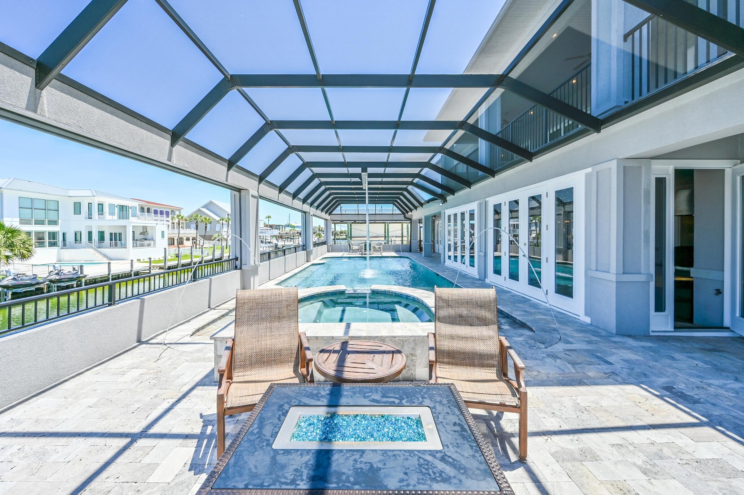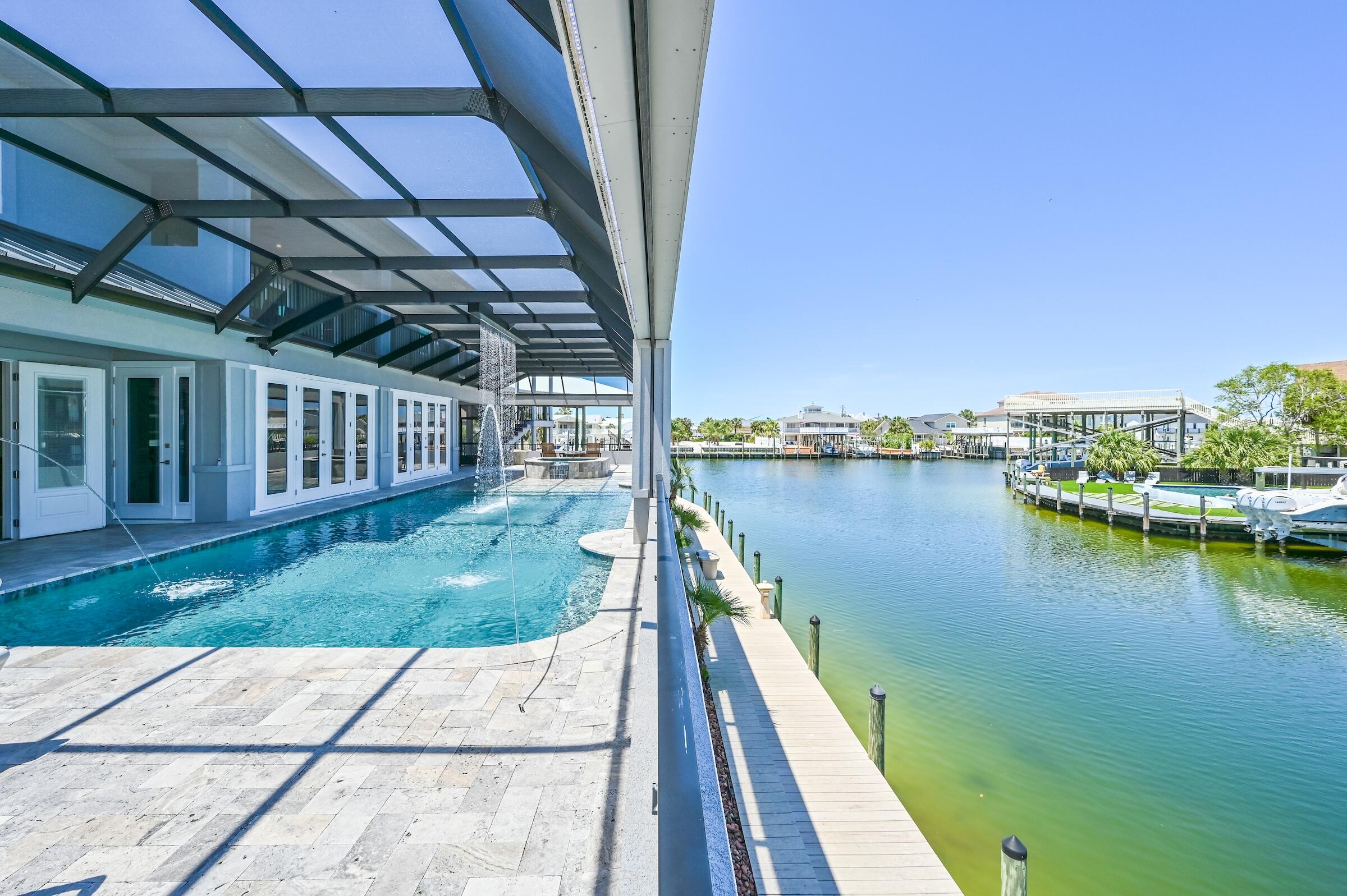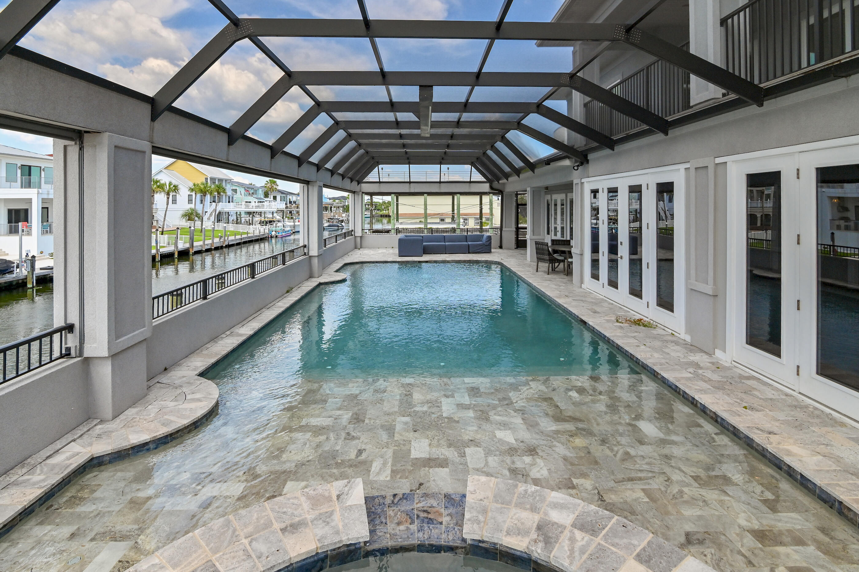 This canal-front home on Holiday Isle sits on a spacious corner lot and is a true boater's dream, featuring over 217 feet of waterfront--ample space for your fleet of vessels.The property offers two covered deep-water 40-foot slips, one equipped with a 25,000-pound boat lift. Additional features include three 30-amp power pedestals and a non-covered jet ski lift.The crown jewel of the estate is a 100-foot lay-to dock, current owner has been HOA-approved to accommodate a 90-foot sportfishing yacht with a 23'2'' beam. This dock includes two 100-amp single-phase power pedestals and ten newly installed 12-inch pilings, ensuring secure mooring.