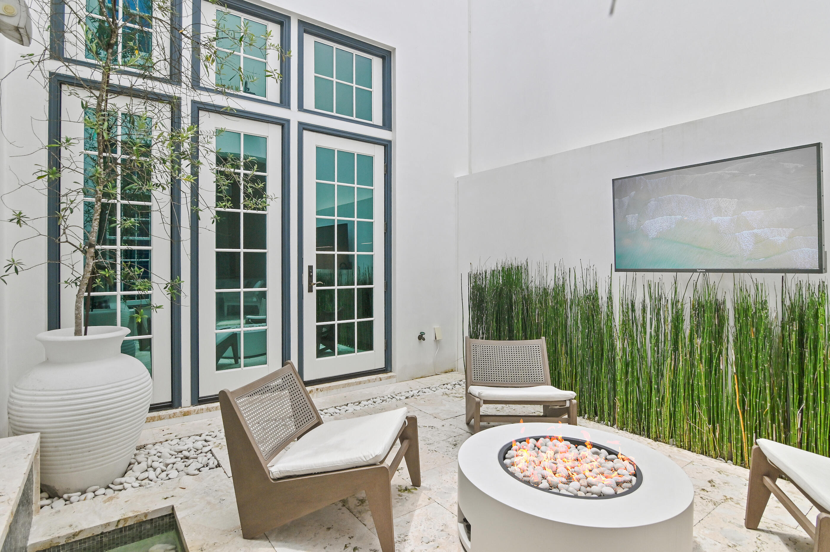 The sleek white kitchen is a study in refinement, anchored by a wall of French doors that open directly to the paved courtyard, blending indoor comfort with outdoor tranquility.