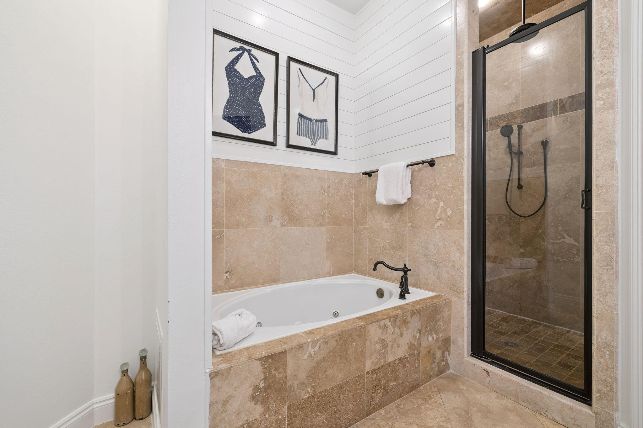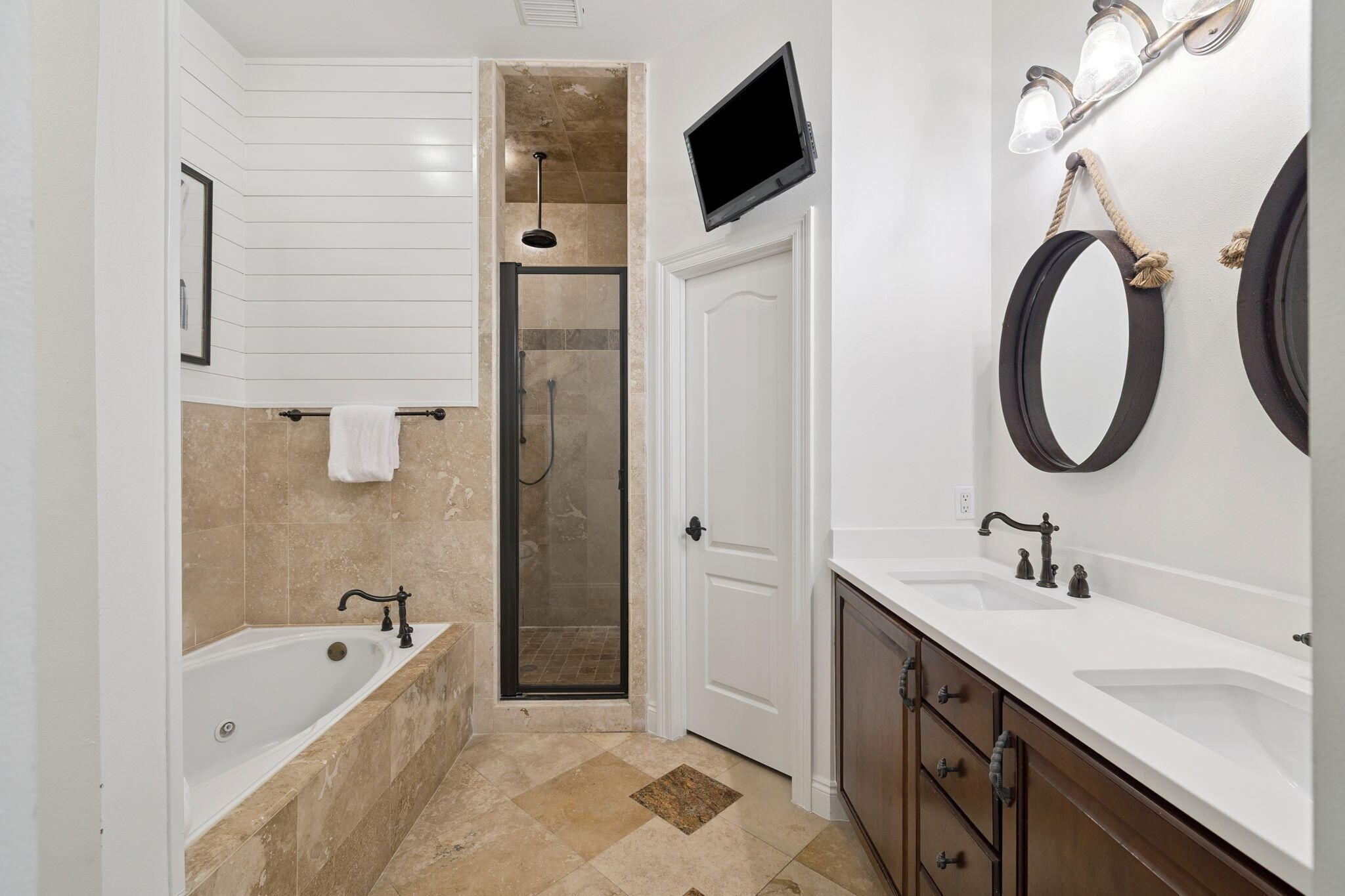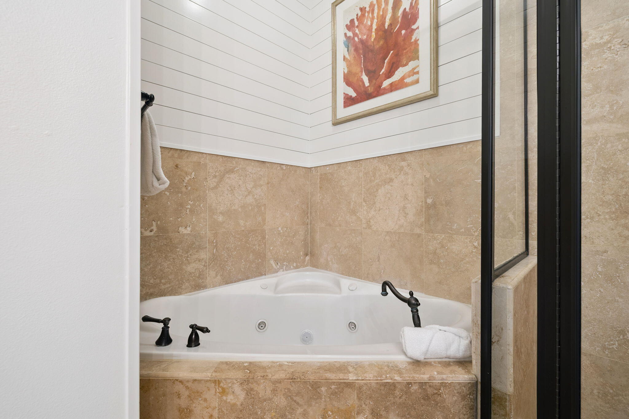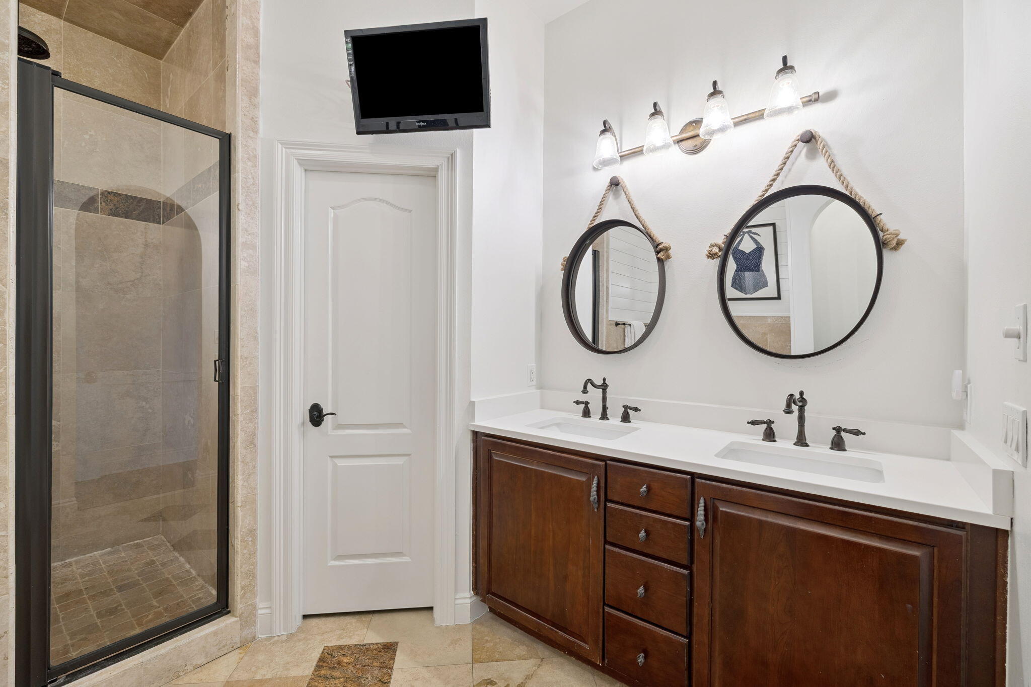Upstairs, the third floor boasts four large fully furnished bedrooms and access to a private balcony and covered porch. The bathrooms are designed with quartz countertops, glass-enclosed showers, and double vanities for a spa-like feel. A Jack and Jill bathroom connects two of the guest bedrooms, both of which are appointed with queen beds and flat-screen TVs.