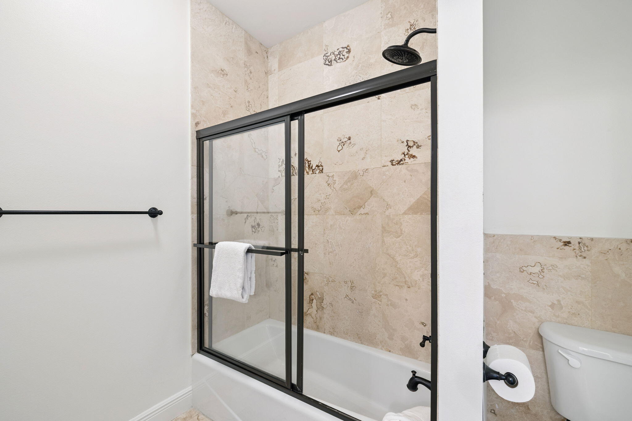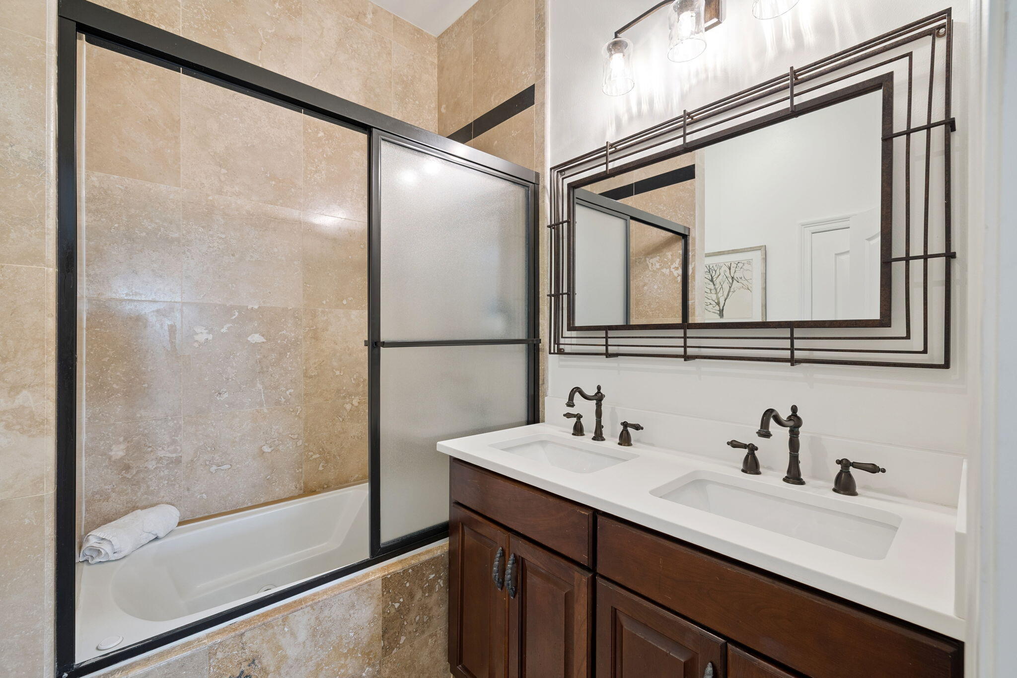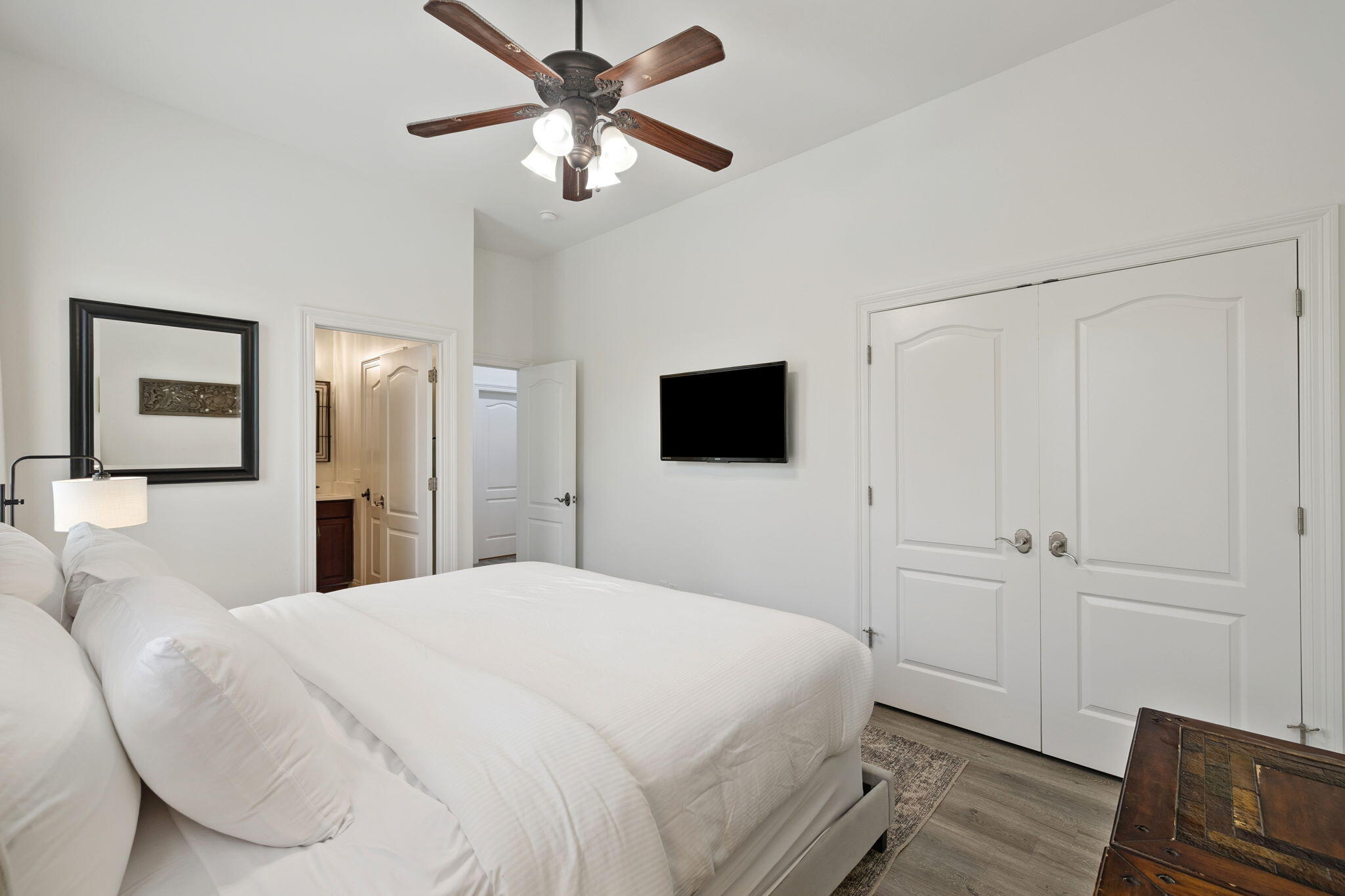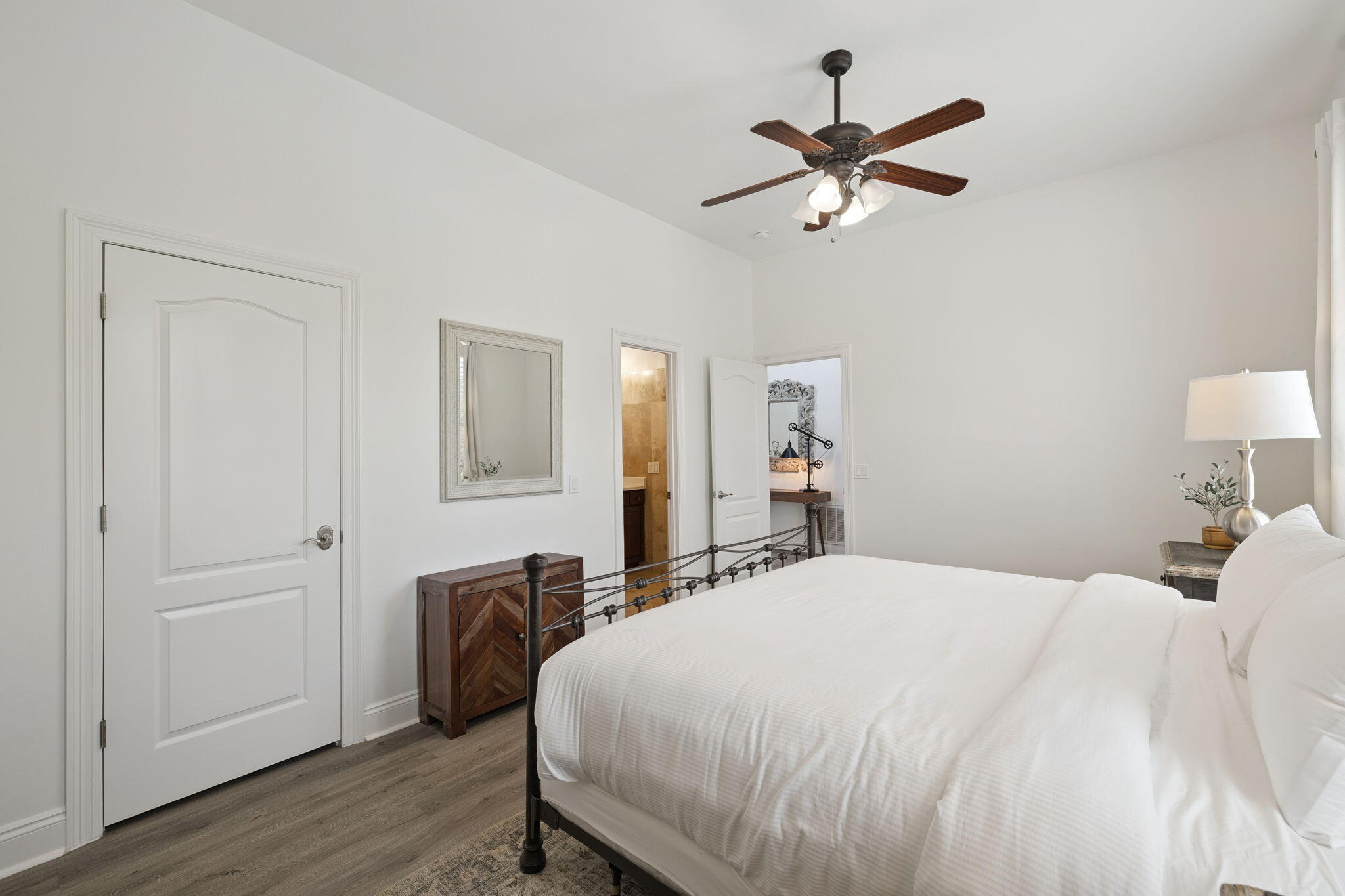 Upstairs, the third floor boasts four large fully furnished bedrooms and access to a private balcony and covered porch. The bathrooms are designed with quartz countertops, glass-enclosed showers, and double vanities for a spa-like feel. A Jack and Jill bathroom connects two of the guest bedrooms, both of which are appointed with queen beds and flat-screen TVs.