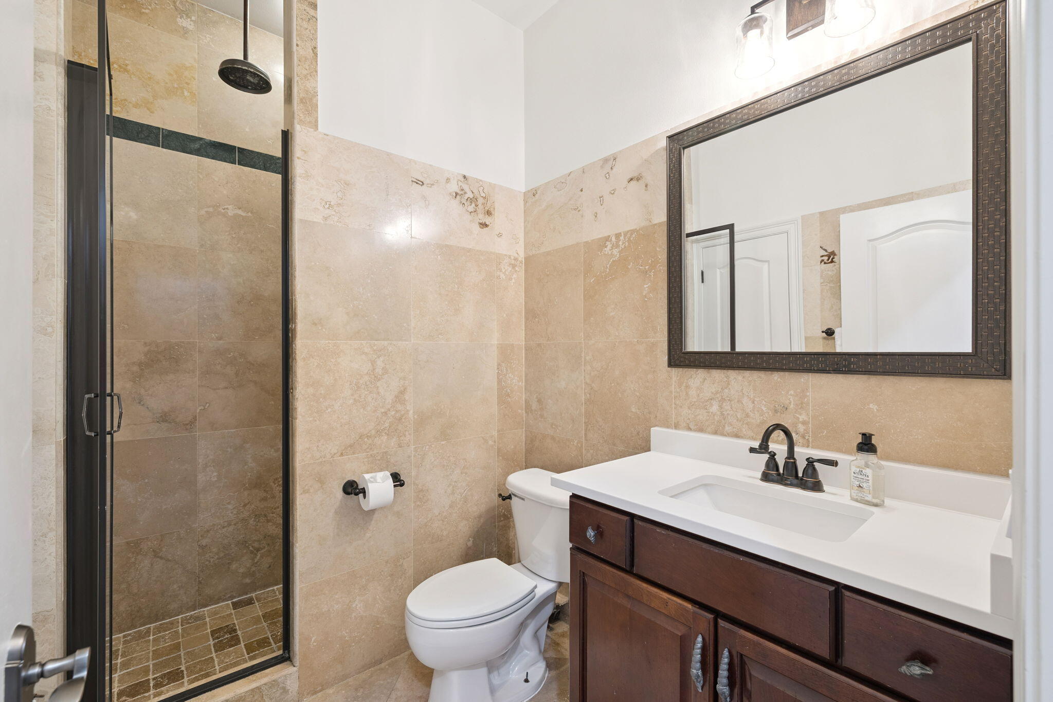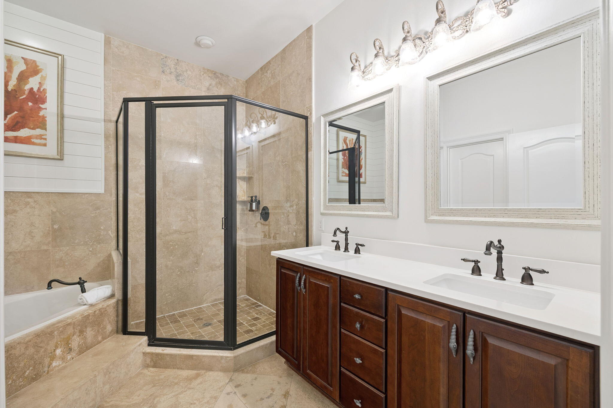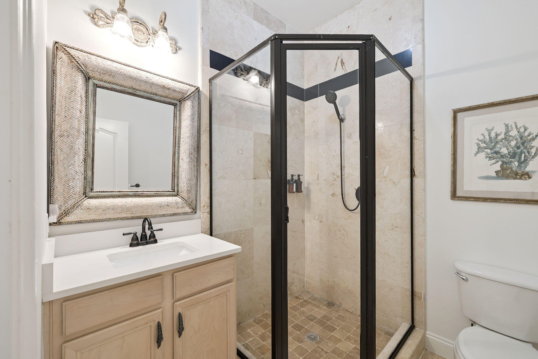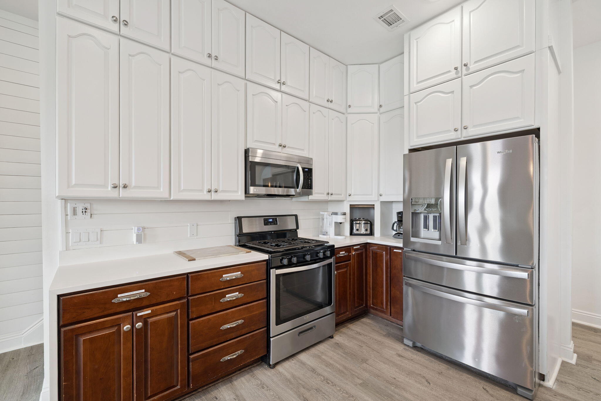 Upstairs, the third floor boasts four large fully furnished bedrooms and access to a private balcony and covered porch. The bathrooms are designed with quartz countertops, glass-enclosed showers, and double vanities for a spa-like feel. A Jack and Jill bathroom connects two of the guest bedrooms, both of which are appointed with queen beds and flat-screen TVs.