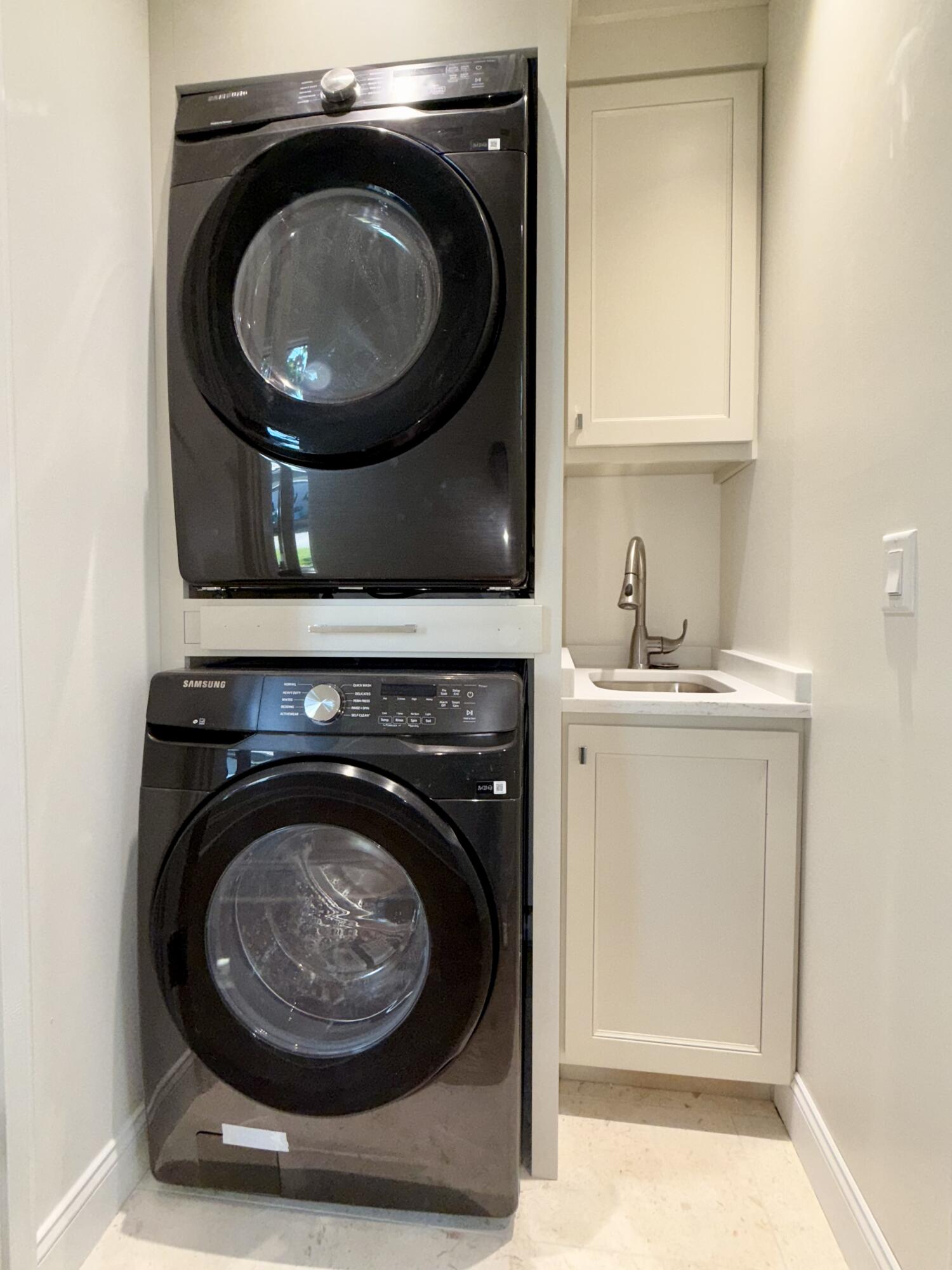 The delightful carriage house includes a 2-car garage with storage closet and a third laundry station - for the convenience of beach/pool towels and carriage house guests. Anyone will feel special in the accommodating second floor suite, featuring a bedroom-living room combination, French doors to its own covered porch overlooking the central courtyard/pool, plus kitchenette, full bath with double vanity, and walk-in shower.