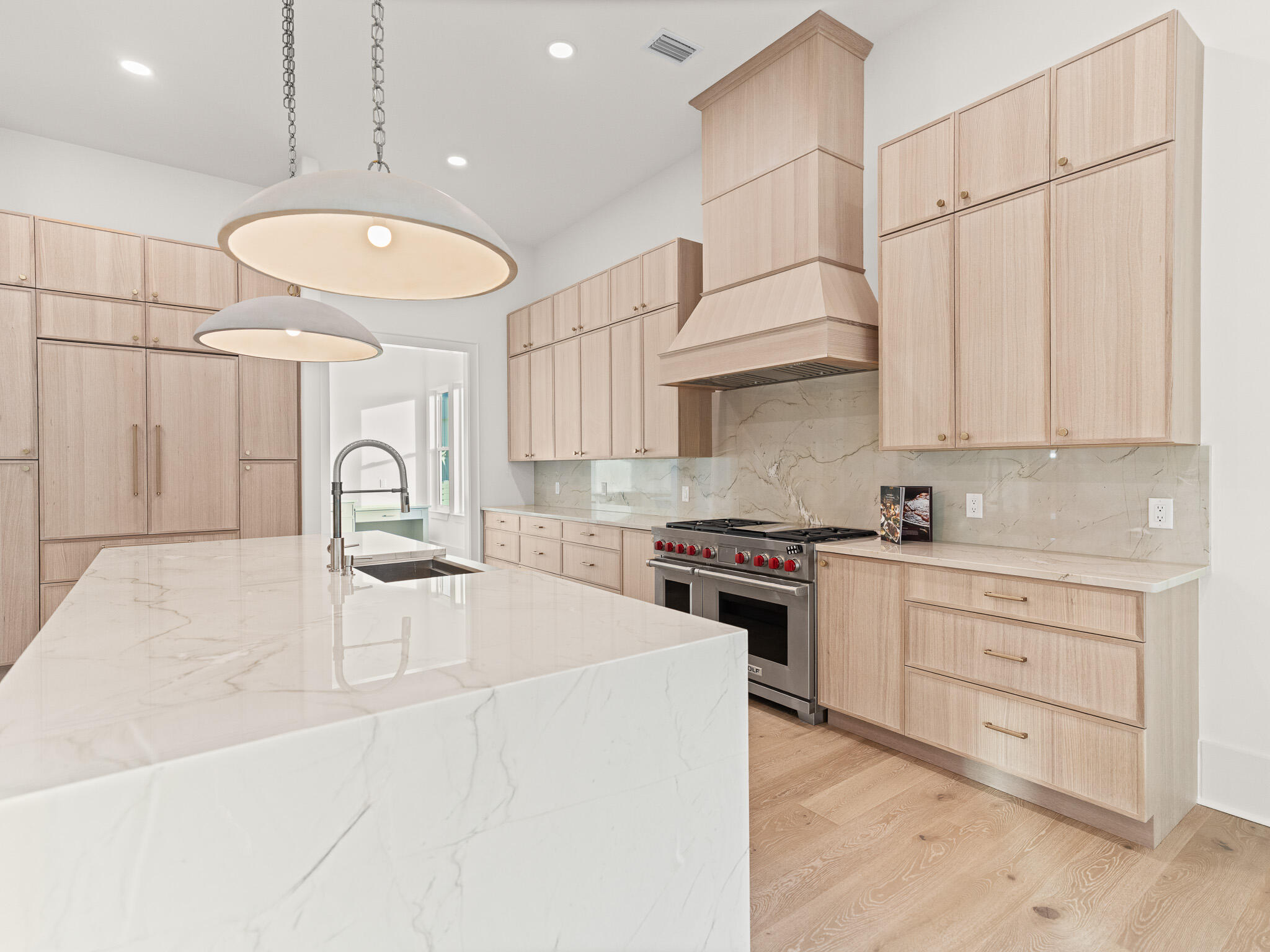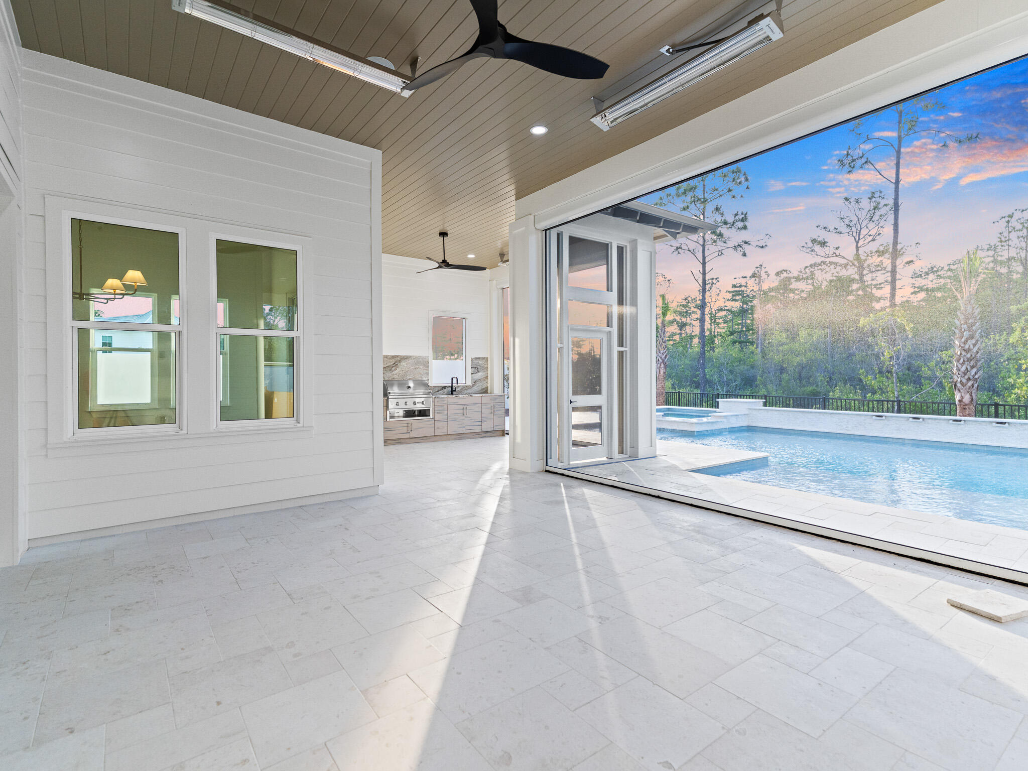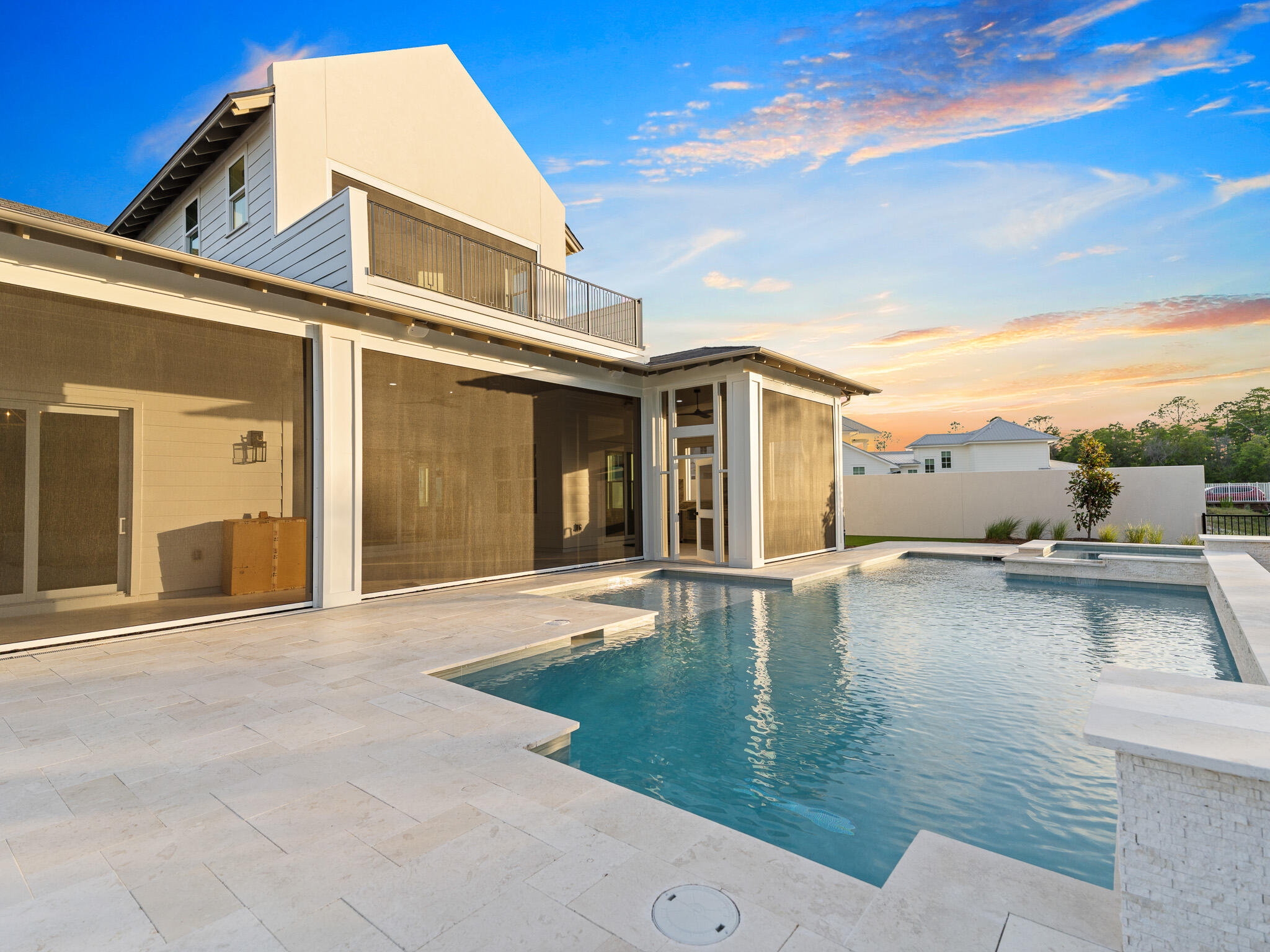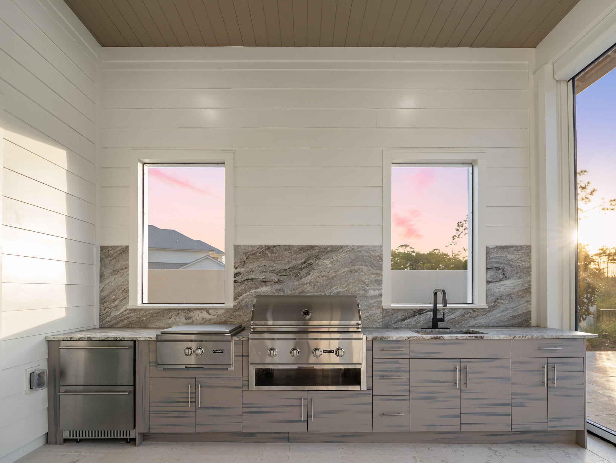 Designed by renowned architect John Williams, this elegant new construction nestled behind the private gates of Camp Creek features impressive craftsmanship with a tasteful coastal flair throughout. A chef's dream, the kitchen encompasses custom milled cabinetry, an oversized island, quartz countertops, and a luxury appliance package with gas range. The expansive living and dining areas are perfectly positioned off the kitchen with direct access to the covered porch with outdoor kitchen effectively blurring the lines between indoors and out while creating a true continuation of living and entertaining space.