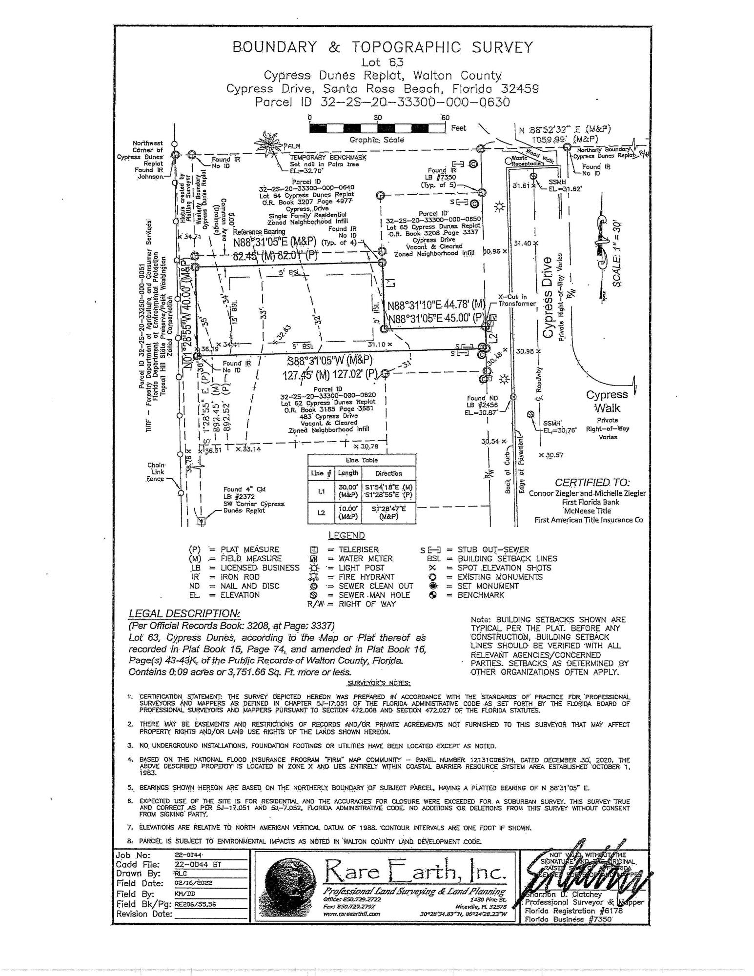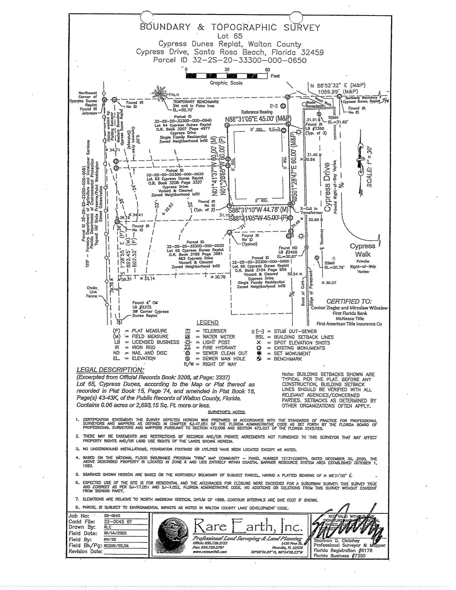 Purchase 1 or 2 lots within the gated community of Cypress Dunes on the desirable west end of 30A, this unique offering backs directly onto the stunning Topsail Hill Preserve State Park, ensuring forever unobstructed views of nature and the Gulf. Enjoy peace, privacy, and panoramic ocean views with no possibility of future development behind you. Whether you build one grand estate or two separate homes the flexibility is yours as the lots are situated together. Community highlights include: Resort-style infinity pool overlooking the Gulf of America, Tennis and Pickle ball Courts, State-of-the-art fitness center, Clubhouse with full kitchen and event space. Just steps from nature, a sort bike ride/walk to some of the best beaches beaches, and close to the best 30A dining and shopping, this is a must-see opportunity for anyone looking to build in one of the most beautiful and secure communities on the coast. Price for both lots 63 & 65 is 455,000. RARE DOUBLE LOT OPPORTUNITY IN COVETED CYPRESS DUNES OF 30A! This is your chance to own two prime lots- LOTS 63 and 65- perfect for building your dream home or even two custom residences! The other unique feature of these two lots is there is a 15 FOOT SEPARATION between lot 63 and lot 64. All other homes have 10 feet in between. There is a 5 foot additional drainage easement for more space between homes!