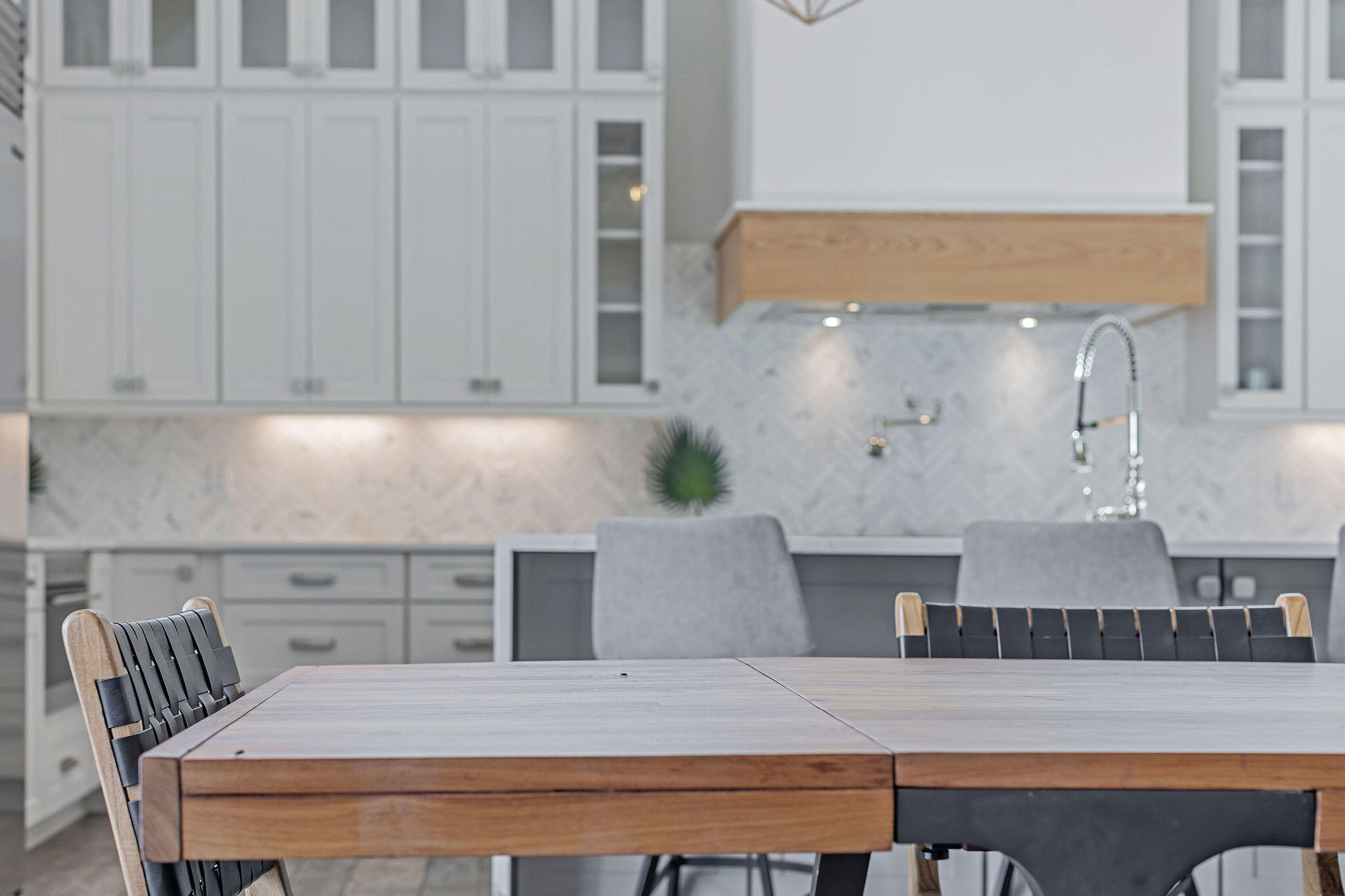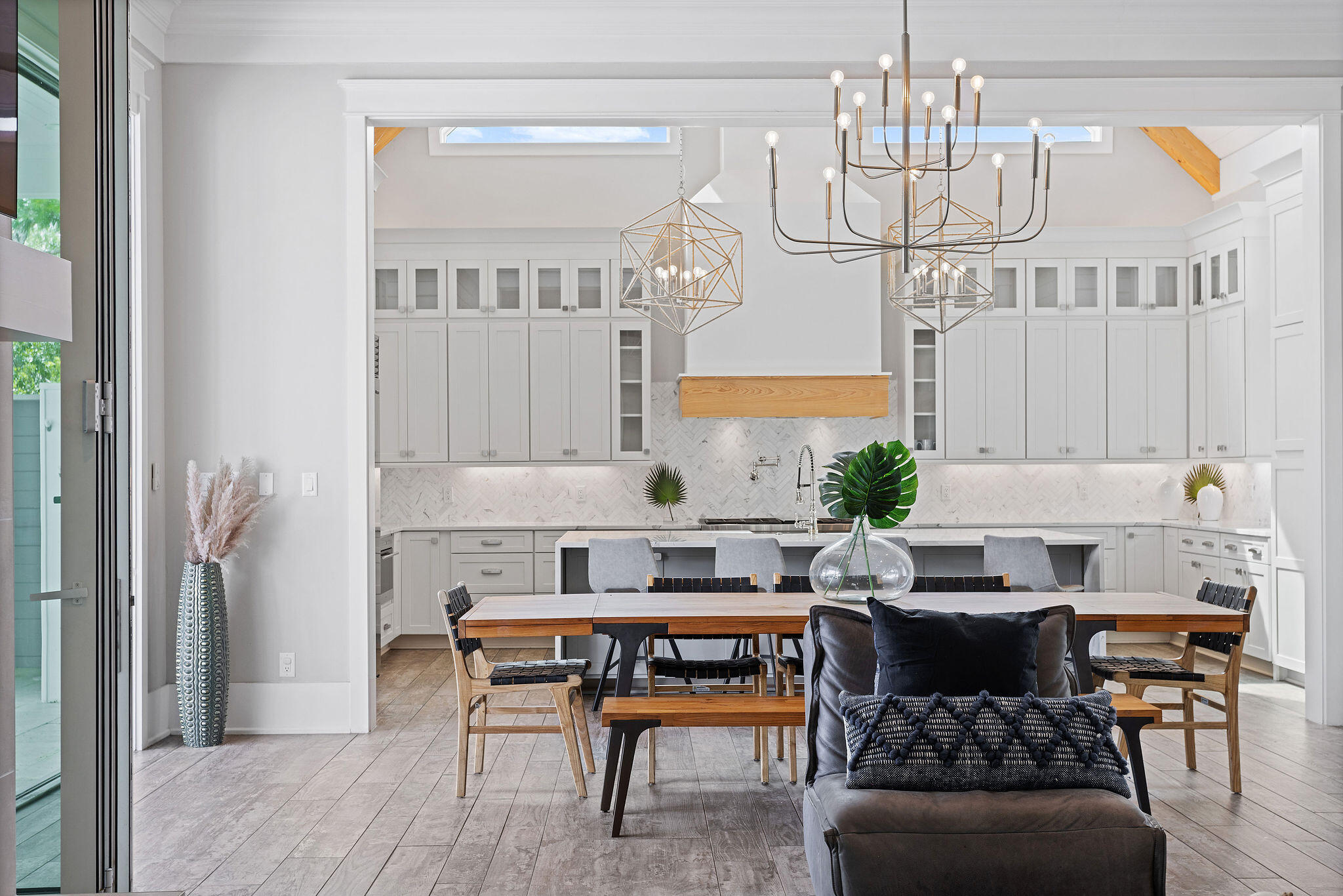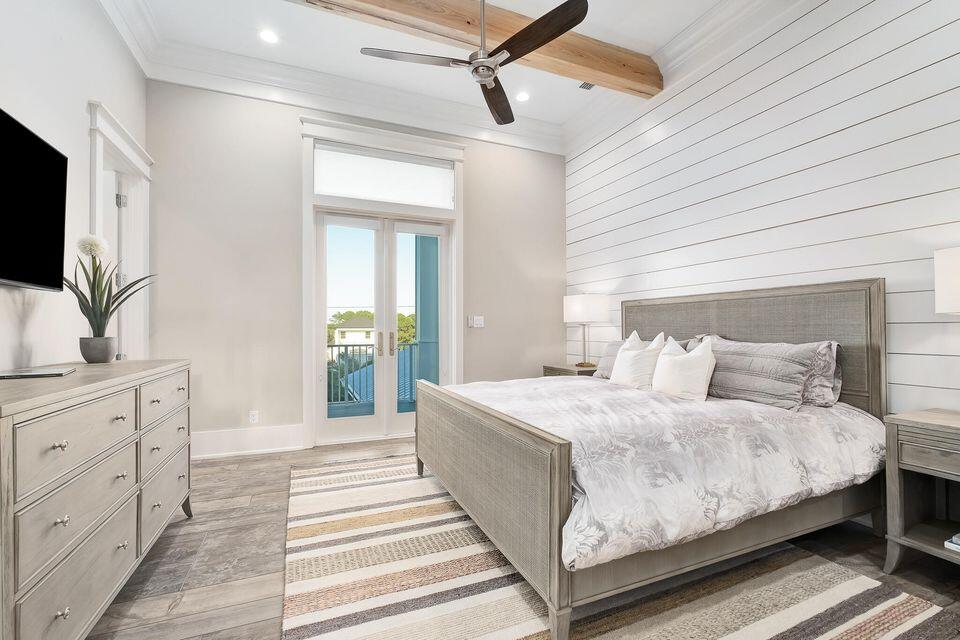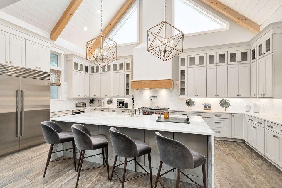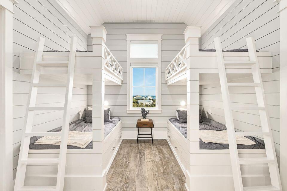 This floor also hosts an additional queen bedroom. Serene colors, calming textures, shiplap accents, designer lighting, and natural wood elements continue throughout the home. The second-floor wraps guests in luxury with three king bedrooms; each featuring its own private ensuite baths. One bedroom includes a small workout room with Peloton. The third and final level of the main house features a capacious family Room with a queen sleeper, covered porch access, and crisp white Bunk Room featuring two twin over twin Bunks with a shared bath/shower combination. The third level offers a private office suite with full kitchen and bath that could be converted to a seventh bedroom. Whole house GENERAC generator.
