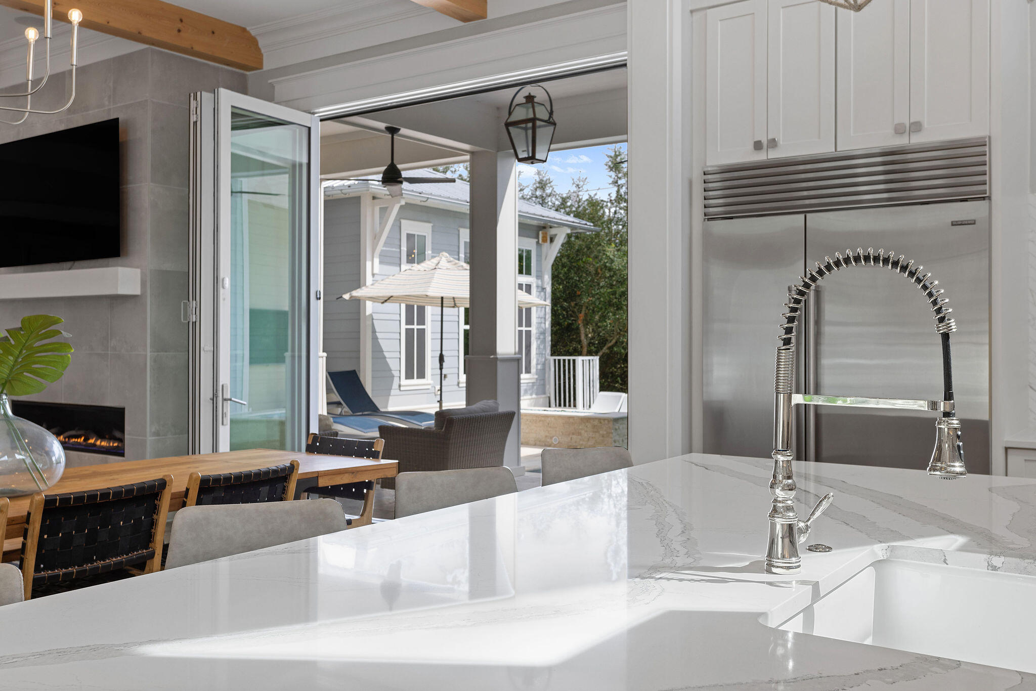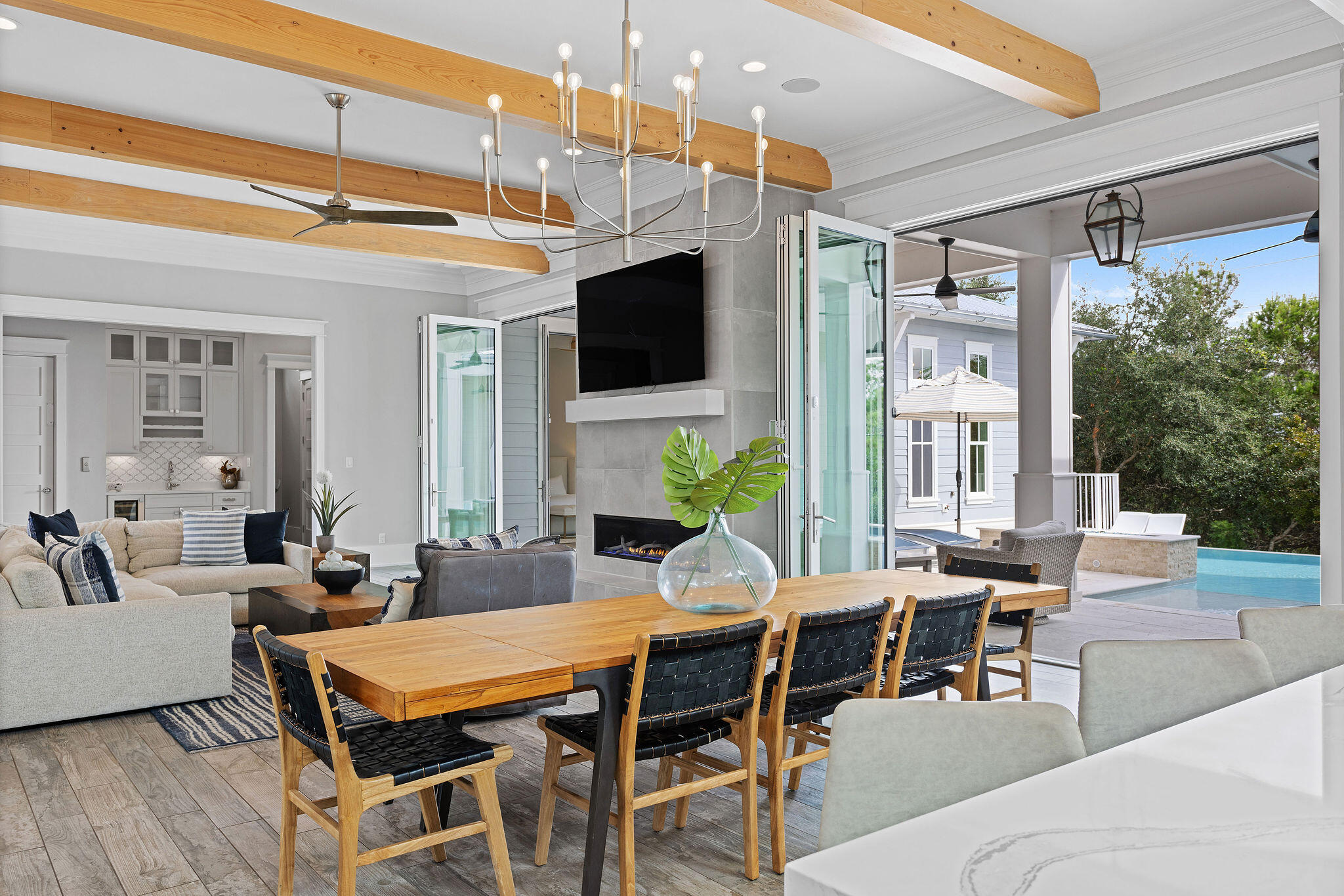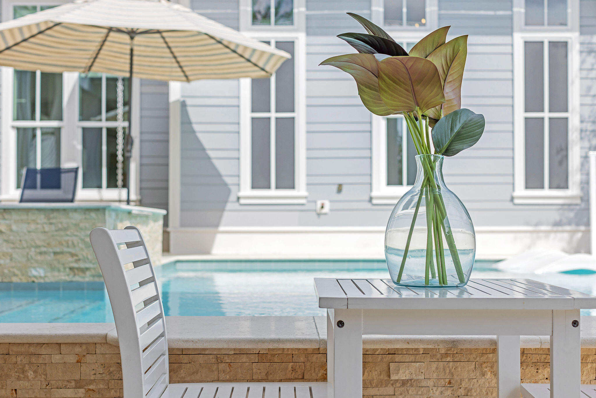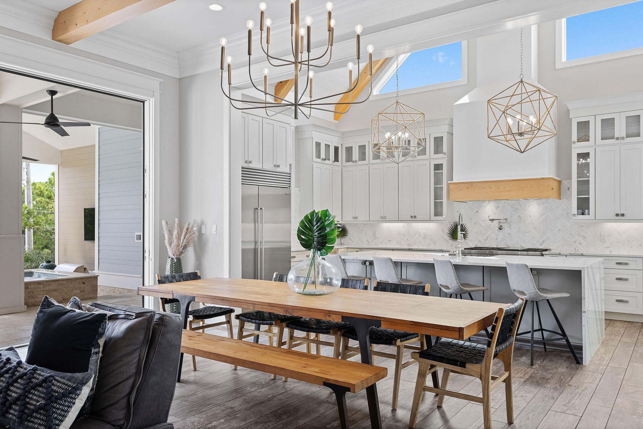 It's an easy stroll through the pool or swim up to the submerged bar seats that adjoin the bar and sunken outdoor kitchen. The stunning outdoor kitchen comes with a BBQ grill and Big Green Egg, soda cooler, ice maker and sink. After an evening swim, gather by the lovely, modern fire pit. Finally, retreat for relaxation in the primary king suite featuring french doors that open to the lanai and a sumptuous ensuite with a double spa shower and soaking tub.