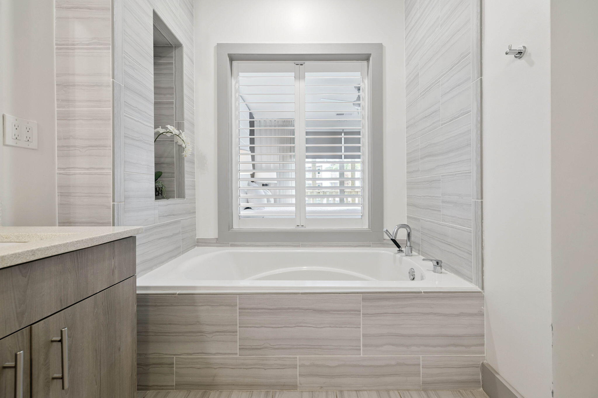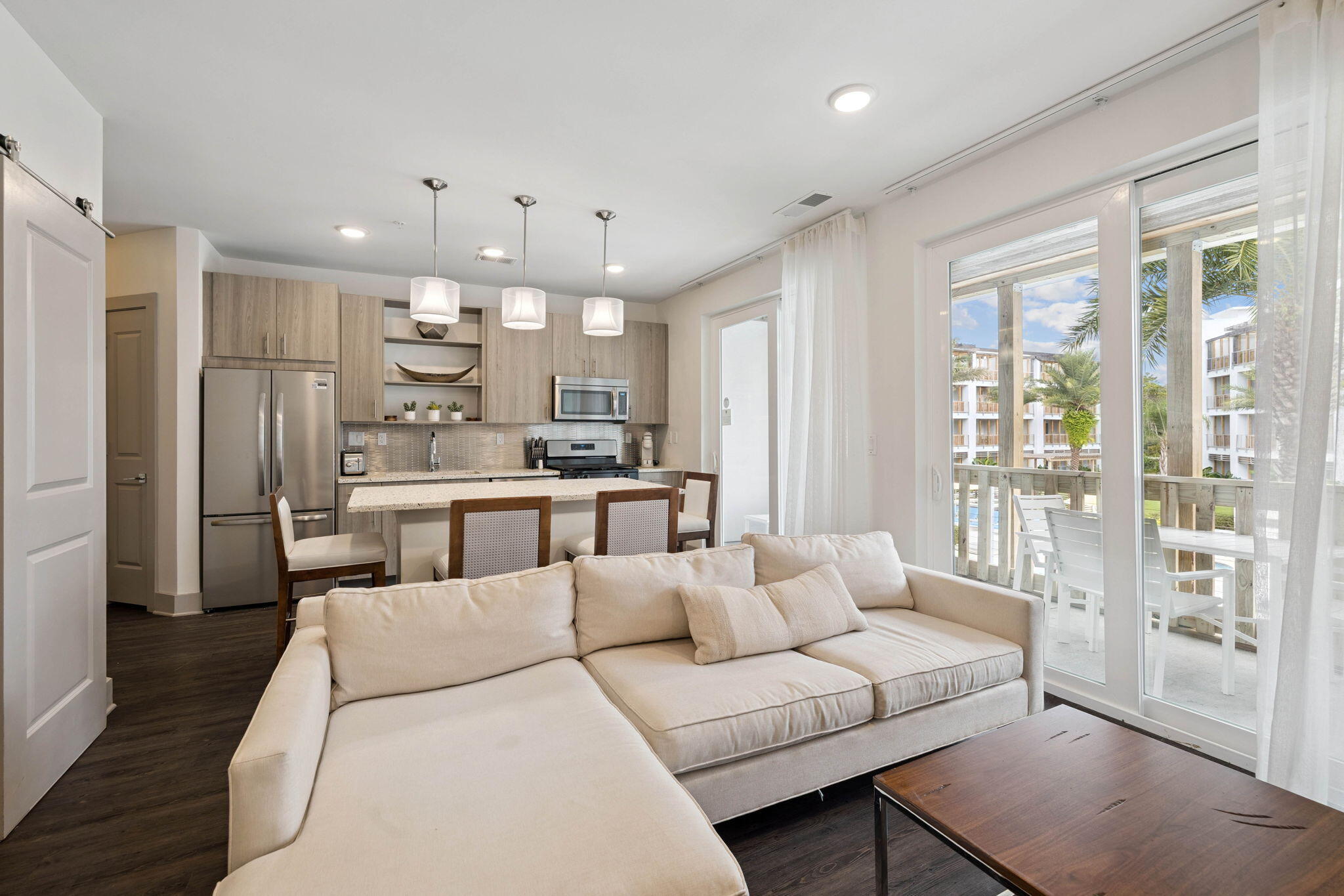 Welcome to Unit 125 at The Pointe on 30A -- your gateway to coastal luxury in the heart of Scenic Highway 30A. Perfectly situated in Building 1, this prime location places you just steps from the fitness center, resort-style pool, and amenity hub, offering unmatched convenience for both owners and guests.This beautifully designed 2-bedroom, 2-bathroom condo blends modern elegance with relaxed coastal charm. The open-concept living area is bathed in natural light and features high-end finishes, quartz countertops, premium stainless steel appliances, and a spacious kitchen island--ideal for entertaining or casual dining. The primary suite offers a serene retreat with a spa-inspired en-suite bathroom, complete with dual vanities, a soaking tub, and a walk-in shower. The second bedroom is equally inviting, with its own access to a full bathroom, making it perfect for family or guests.