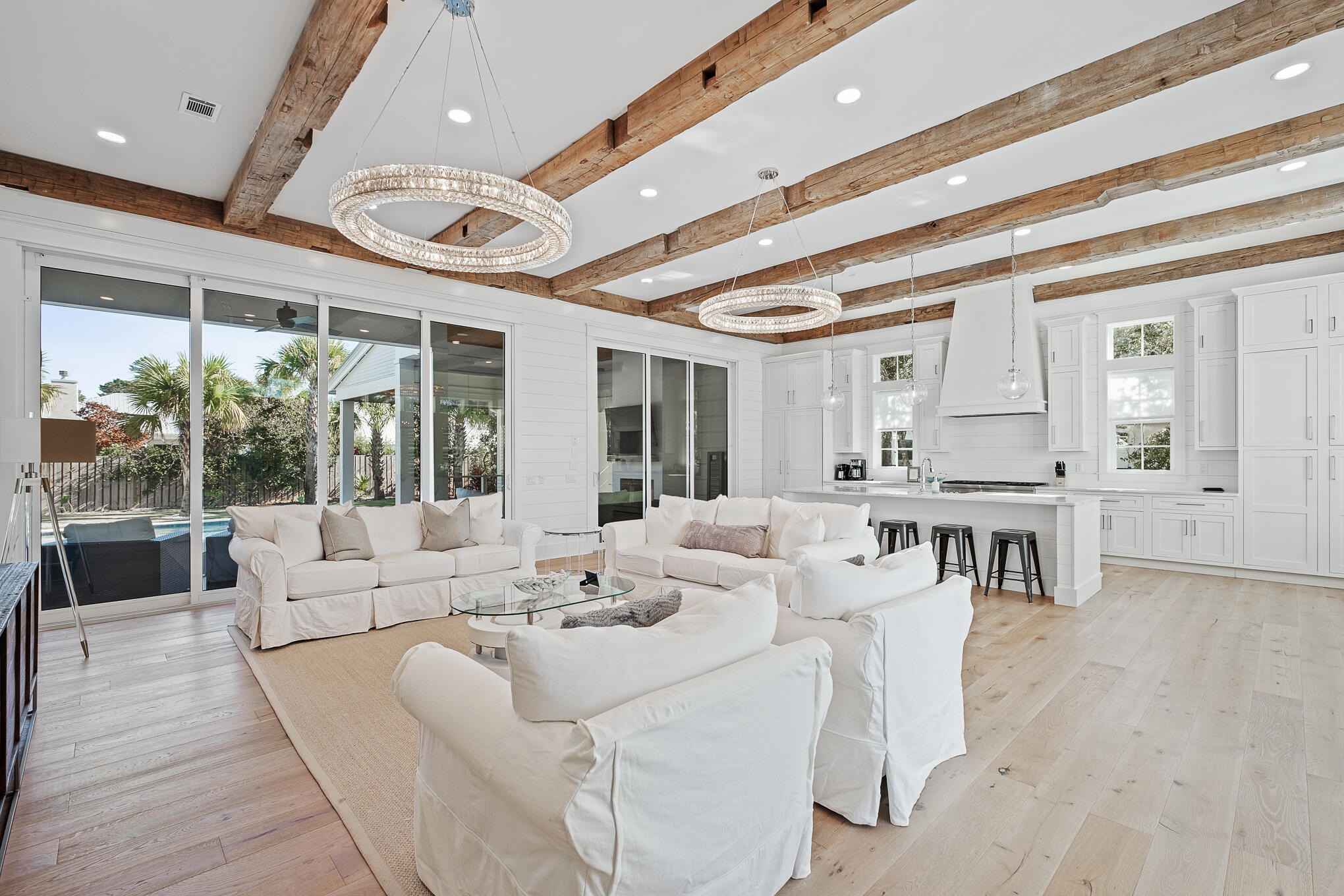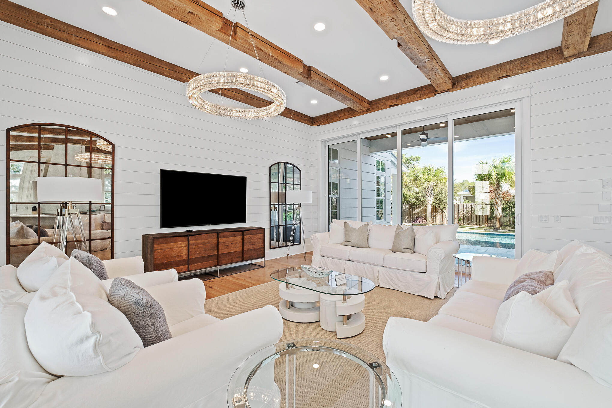 Located in the iconic Blue Mountain Beach, this over the top home is perfect for a residential home, 2nd home or vacation rental. The outdoor living is exemplified by an oversized, heated pool that features a swim up bar, sun shelf, cabana, and outdoor fireplace. Outdoors also includes a gas grill, ice maker, TV, and fridge. Inside, the main floor is highlighted by the gourmet kitchen and spacious living room, which features 12 foot ceilings, shiplap, and rustic beams. The spacious bedrooms each feature their own en suite bathrooms, as well as sizable closet space. The large built-in bunk room area is perfect for adults or kids. If that isn't enough, there is a mother-in-law suite above the garage with it's own kitchen, full bath and living area. This is definitely one to see.