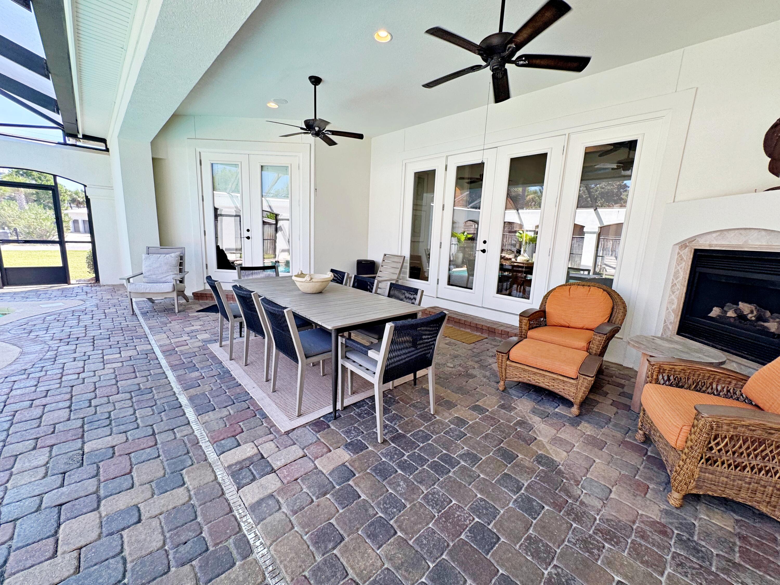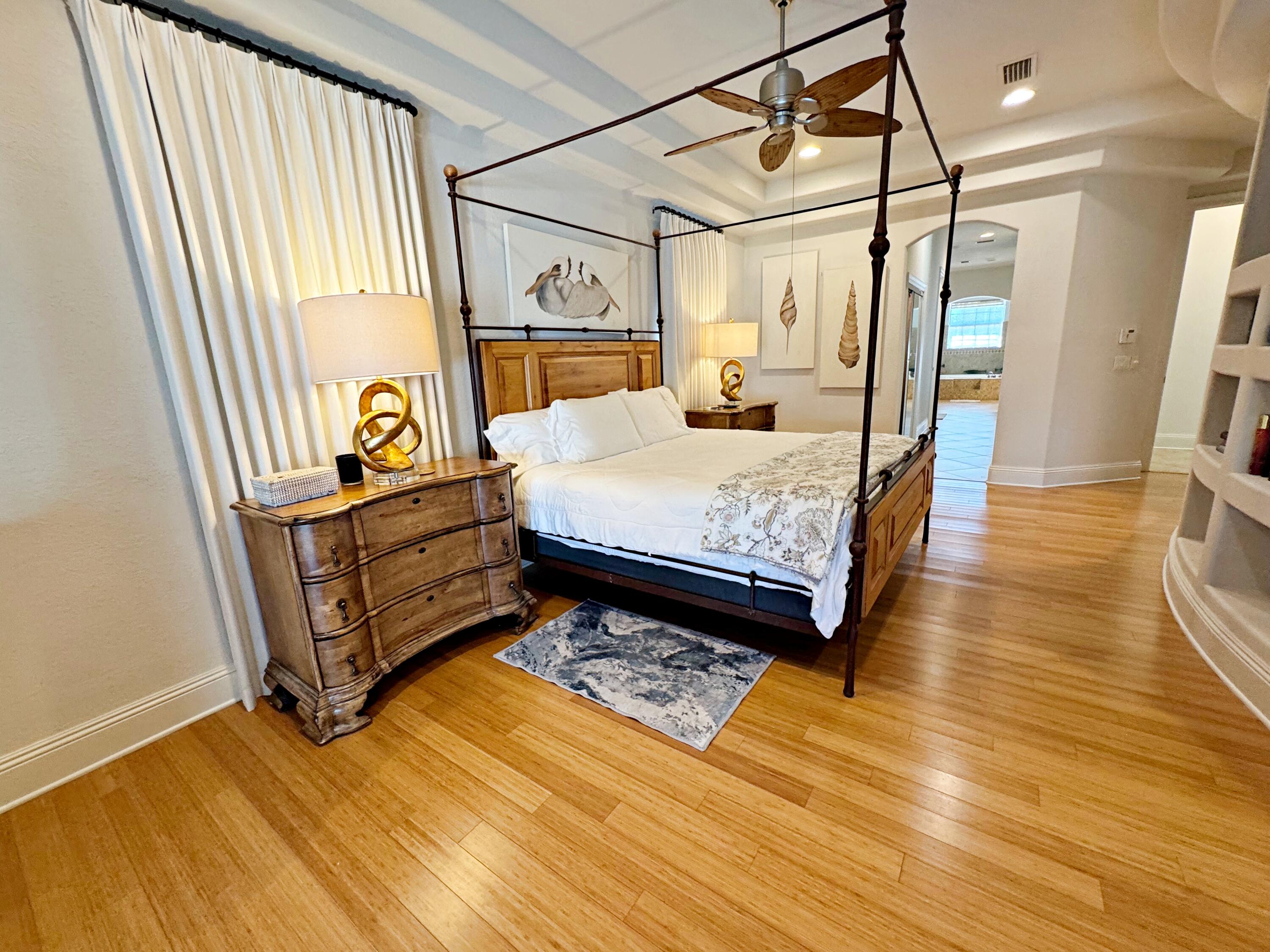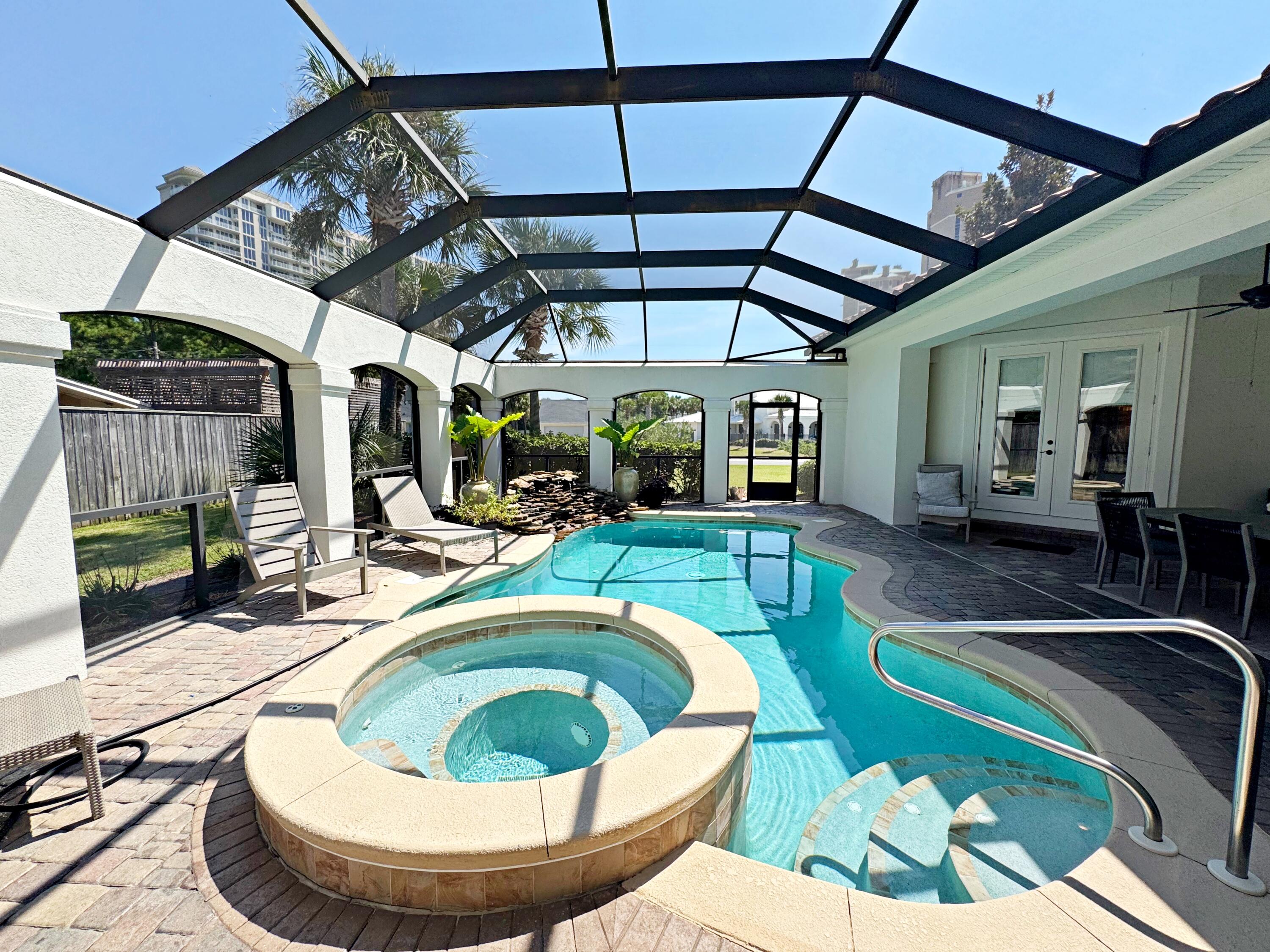 Presenting a One-Level Mediterranean Masterpiece in Gulf Pines, and only Steps away from the Gulf of America!This is a exquisite custom built estate in the heart of Gulf Pines, where luxury meets beach lifestyle. This single-story 4 bedrooms plus a bunk room/office, 3 full baths, and a breathtaking open floor plan with soaring ceilings that blend elegance with coastal charm.Enjoy indoor-outdoor living at its finest: dine or entertain under the expansive lanai overlooking your private enclosed heated gunite pool & hot tub, or cozy up beside one of three fireplaces. The gourmet kitchen is outfitted with dual wine coolers, premium appliances, and exquisite finishes. Every detail has been considered: hardwood & tile floors, tray ceilings, crown molding, and generous walk-in closet in the primary suite, which also includes a luxurious bath with separate shower.