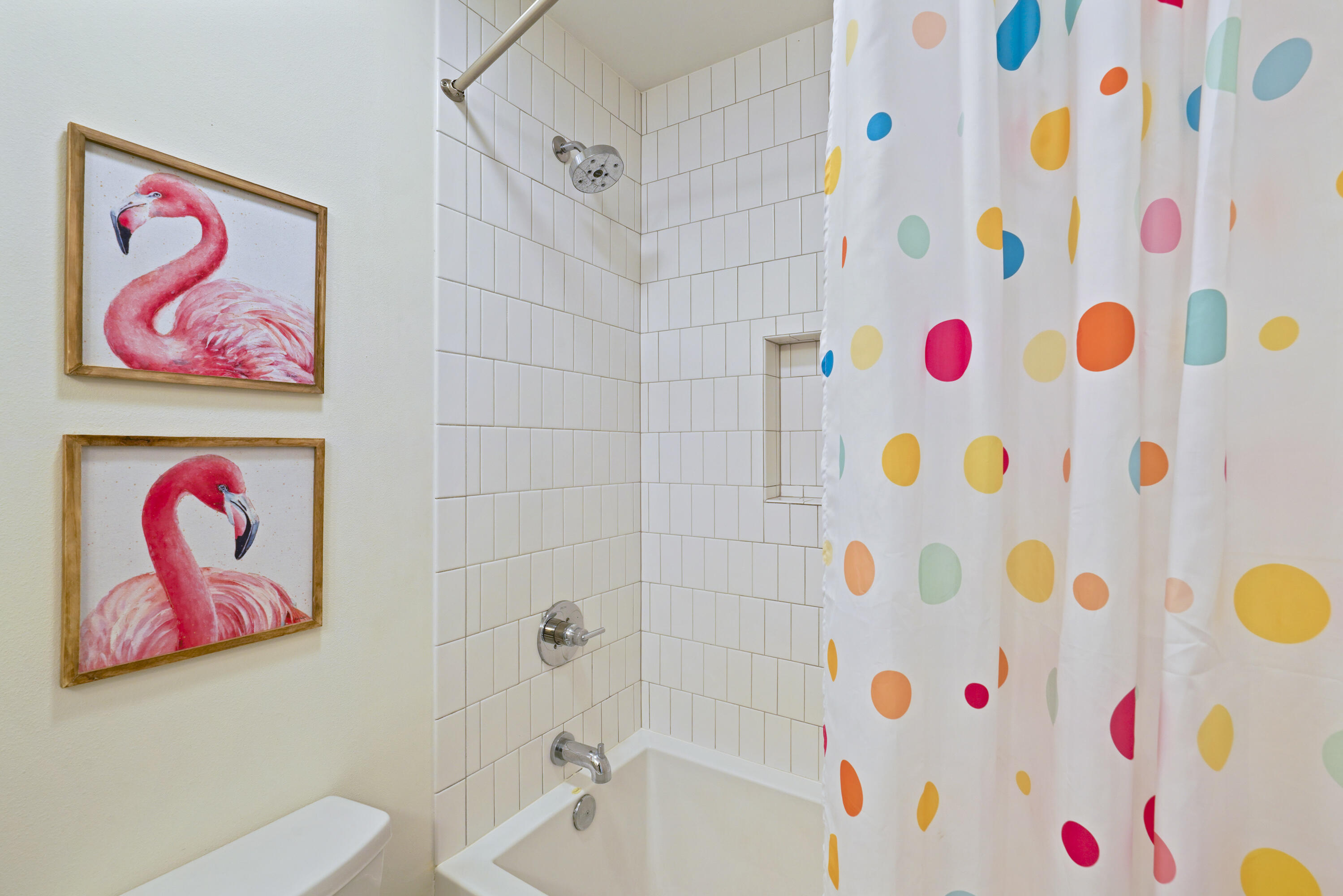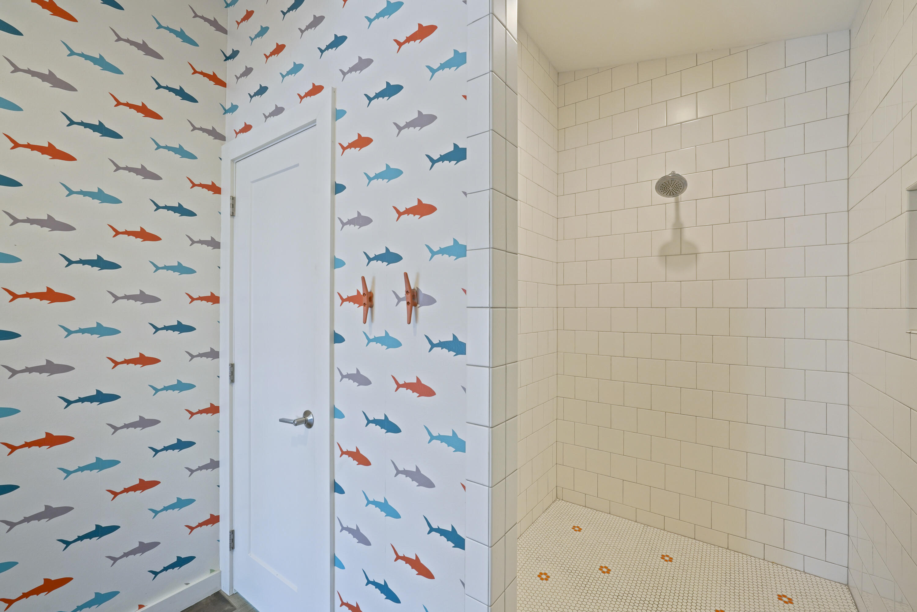 The home's layout was designed with guests in mind. Sleeps 12 comfortably! Three bedrooms on the main level include a cheerful queen room, a king suite with porch access, and a spacious master retreat with double vanity bath and direct access to the backyard. Upstairs, the custom bunk room is a true highlightfeaturing two sets of twin/full custom-built bunks, each with an additional twin trundle below, a wave accent wall, fun décor, and a private en-suite bath.