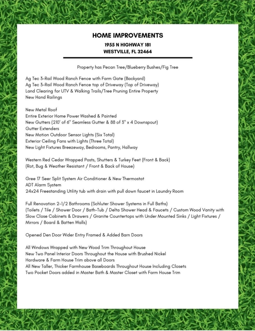 PRICED TO SELL at 25K BELOW appraised value!! Step into country charm with this beautifully renovated 3 bedroom/2.5 bath brick ranch on 15+ acres in Westville, FL! Nearly 3,000 sq. ft. of thoughtfully updated living spaces including a chef's dream gourmet kitchen with ample counter space, a walk-in pantry, breakfast nook and formal dining room. The expansive living room is a true centerpiece, offering both comfort and versatility. A stunning pine tongue-and-groove ceiling adds warmth and character, while rustic barn doors give the option to transform the room into an additional space--perfect for entertaining, a media room, or a cozy home office. The owner's suite offers a walk-in closet and a beautifully tiled shower, creating a comfortable haven. The expansive laundry/utility room provides exceptional space for storage and everyday convenience, while a glassed-in breezeway connects the home and garage, adding function and charm. Thoughtful updates include new flooring, fixtures, and energy-efficient Anderson windows, along with the durability of a metal roof and the security of a whole-house generator. Outdoors, you'll find a metal outbuilding, a 2-car garage, and a 2-car awning, offering abundant storage and workspace. With over 15 acres of cleared and wooded land, including trails for walking, horseback riding, or ATVs, this property is ideal for a hobby farm, gardening, or simply enjoying wide-open country views from the covered porches. Set back on a paved road close to town, that offers both privacy and convenience in a move-in-ready home. Endless possibilities await!