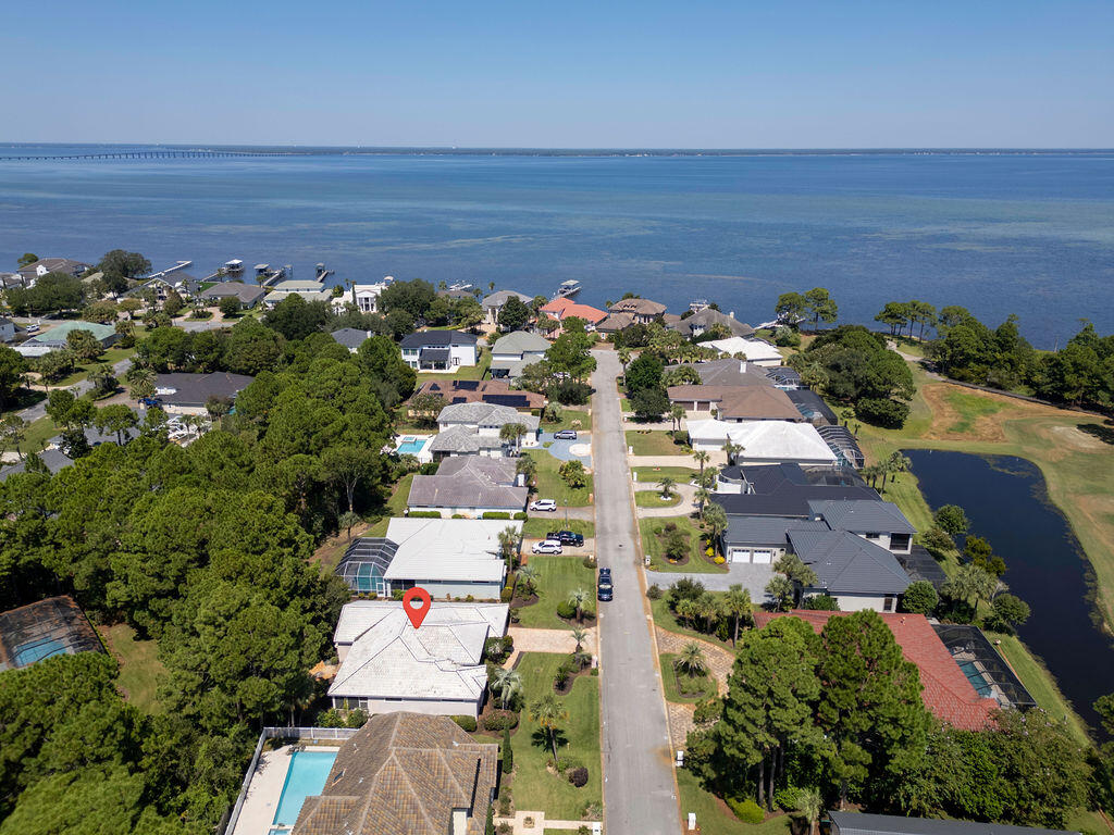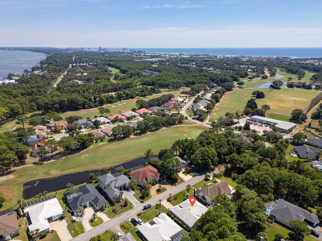 From the east or west on Emerald Coast Pkwy, enter Emerald Bay and go past the Guard Gate and drive straight 'north' on Emerald Bay Drive. Go past the 4-Way Stop near the Clubhouse and continue on. You will drive past the seventeenth green on your right and the tee box for the eighteenth hole on your left before the road bends to the right. Coming out of the bend, house will on the left.