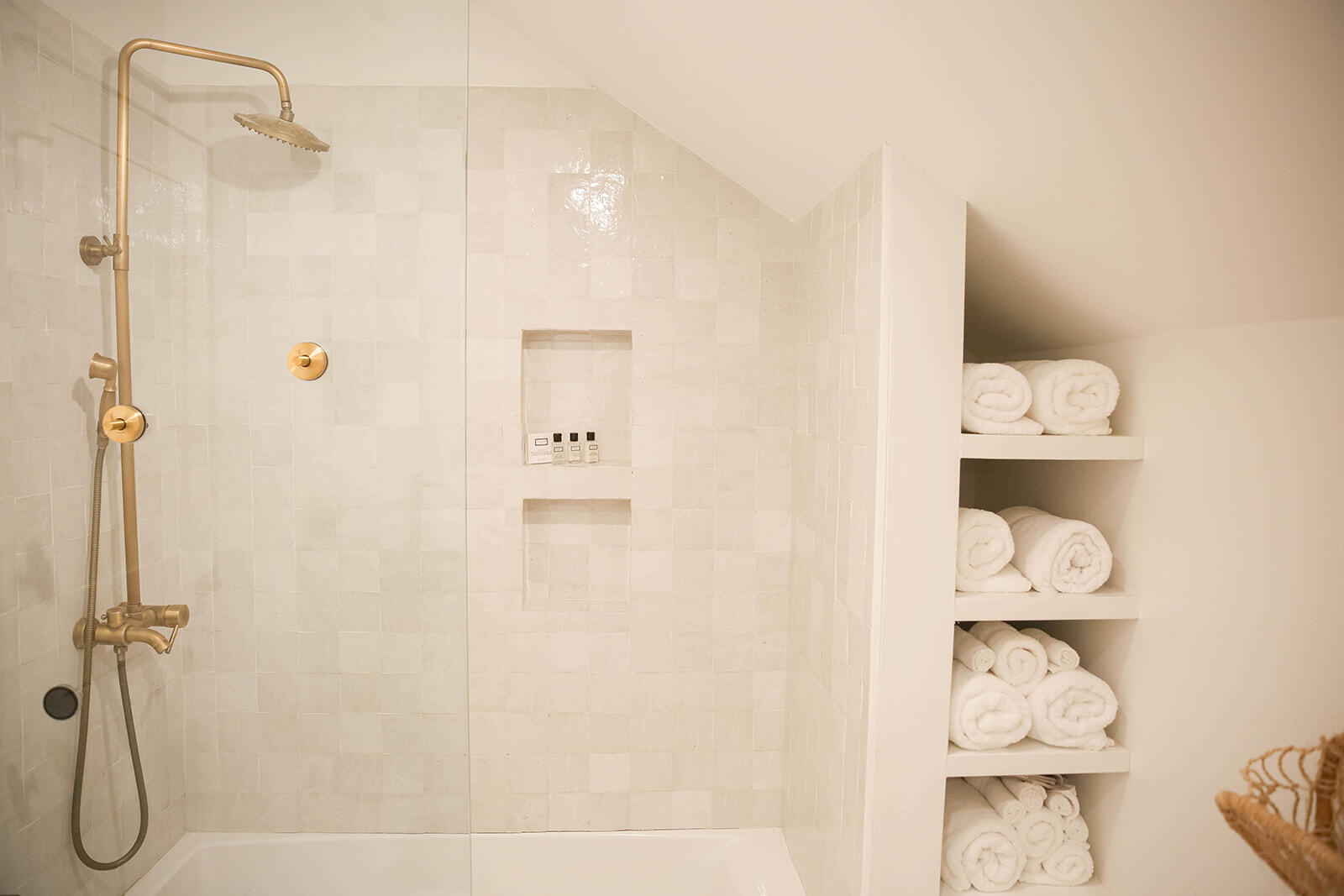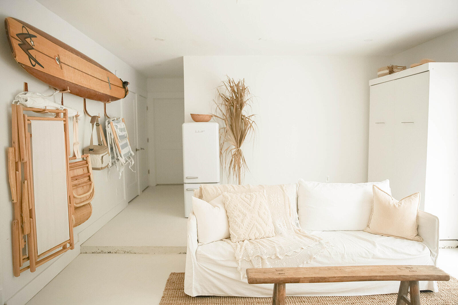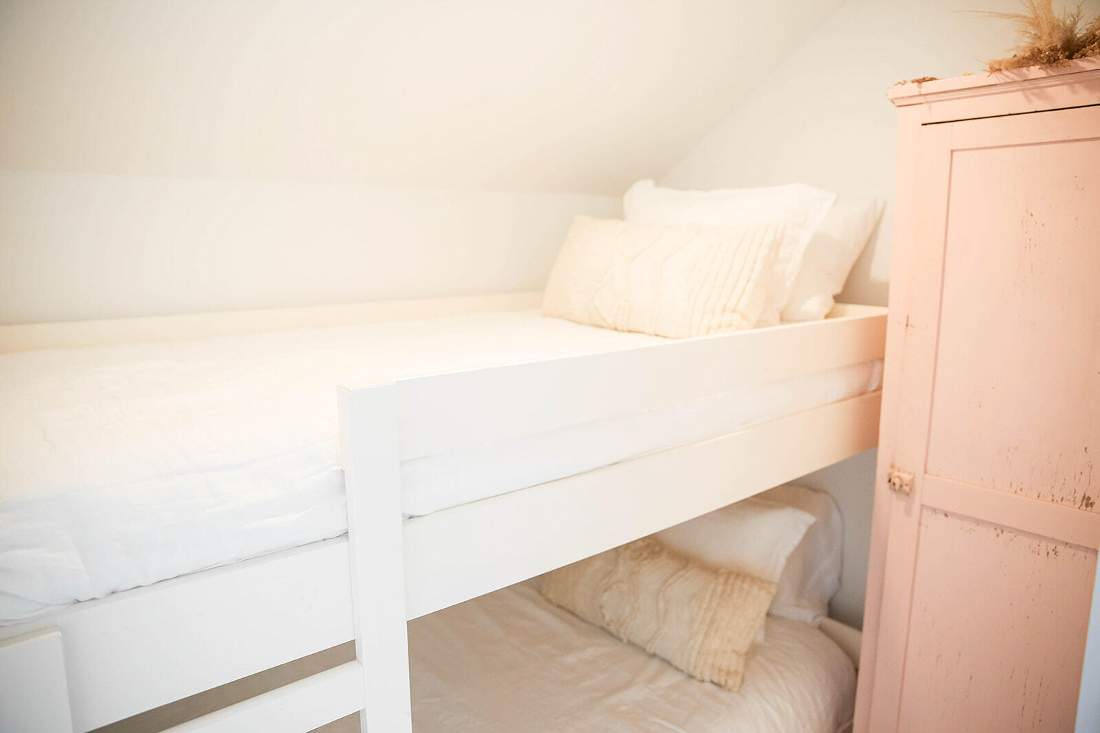 The detached carriage house offers about 1,000 sq ft of conditioned space with a private entrance, separate driveway, and two dedicated parking spots. It features a one-bed/one-bath layout plus an enclosed bunk room and a private balcony off the main living area. The lower level includes a washer/dryer, a large owner's storage/office nook, and a flexible space currently used as a children's playroom. A private patio with outdoor shower completes the space.