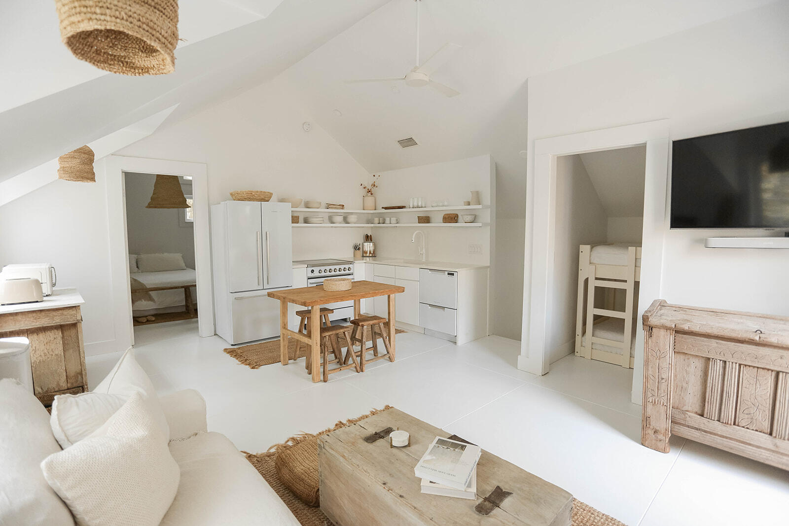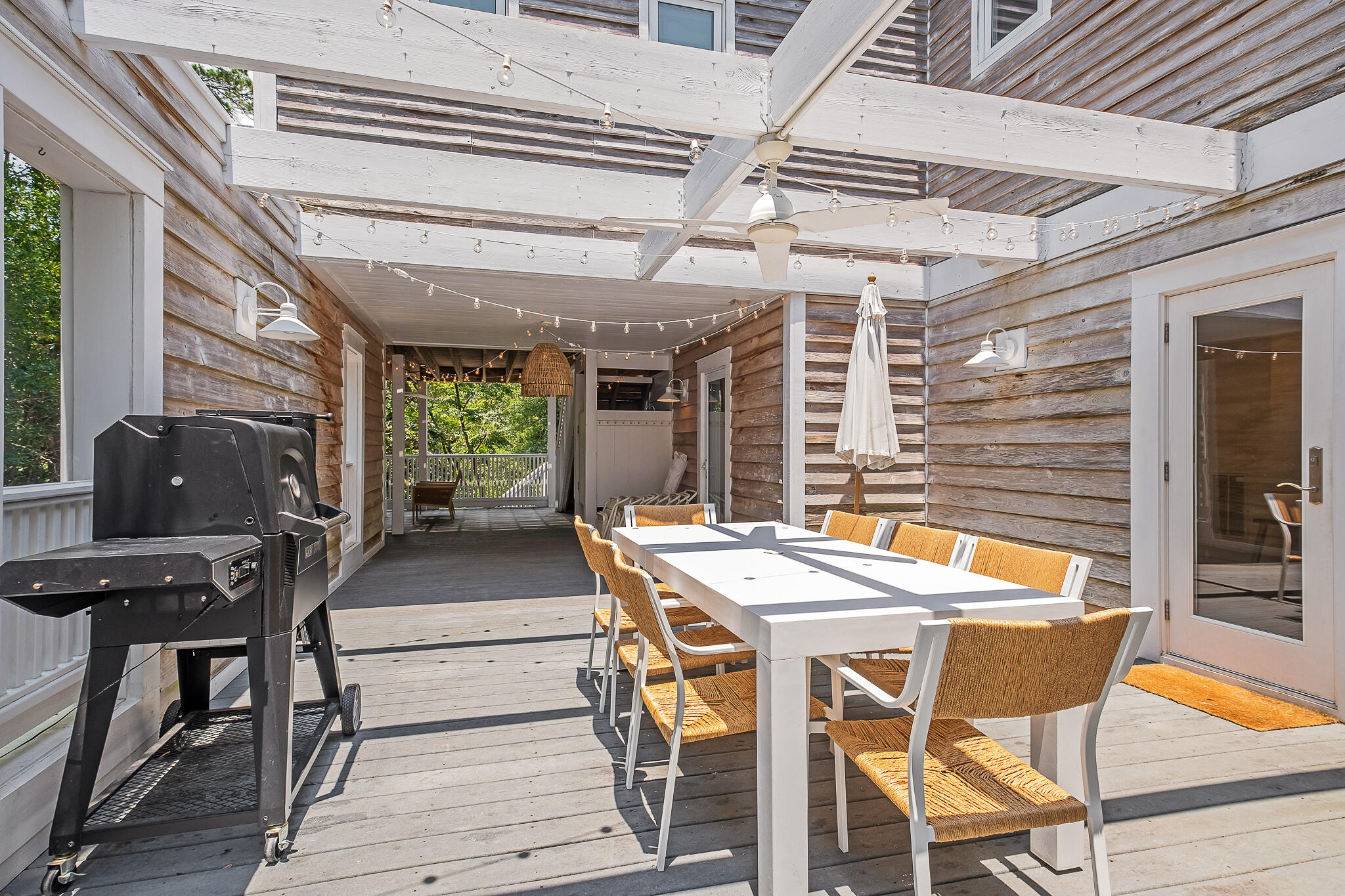 202 Canal Street is a thoughtfully curated, eclectic beach retreat with global style. Just three blocks from the beach and tucked along a romantic canal, the home is surrounded by century-old oaks and magnolias, creating a quiet, serene atmosphere, perfect for recharging or gathering with friends and family. Whether as a full-time residence or second home, it offers a rare balance of privacy and proximity. The shops, dining, and events of Seaside are only a short walk away, giving you the best of both worlds: close to the action, with peace and quiet when you want downtime. The main home has a soft, earthy aesthetic with natural textures, abundant light, and organic, hand-sourced décor that inspire calm and creativity. A yoga space with mats and basic equipment makes it easy to exercise and reset. The floor plan includes a first-floor primary suite, plus a second primary suite upstairs along with two additional bedrooms and a full bath.