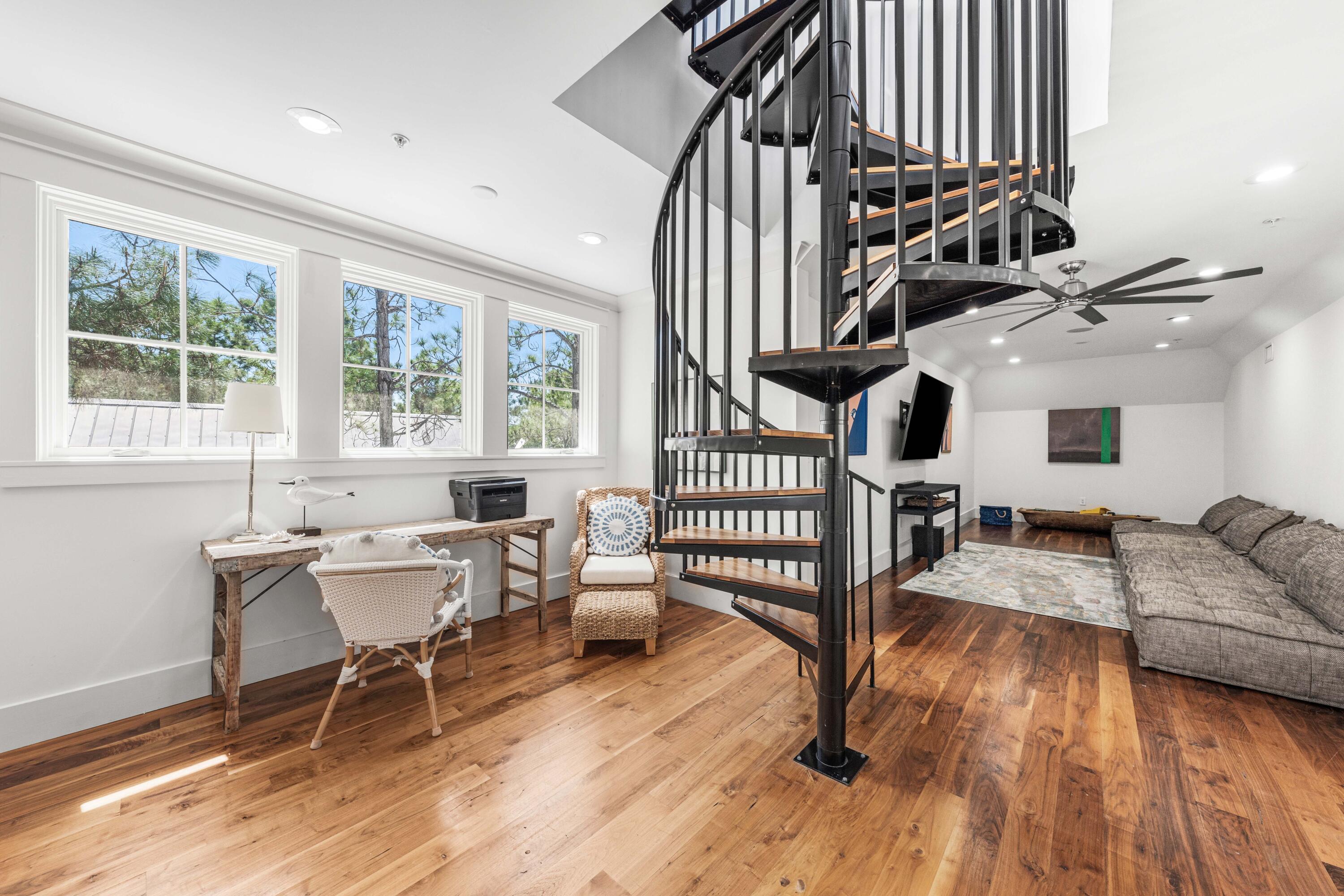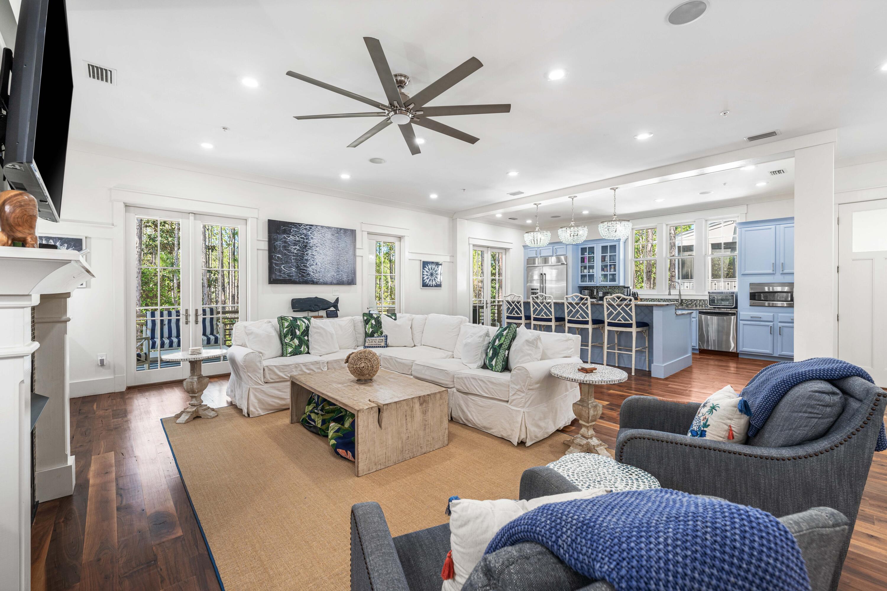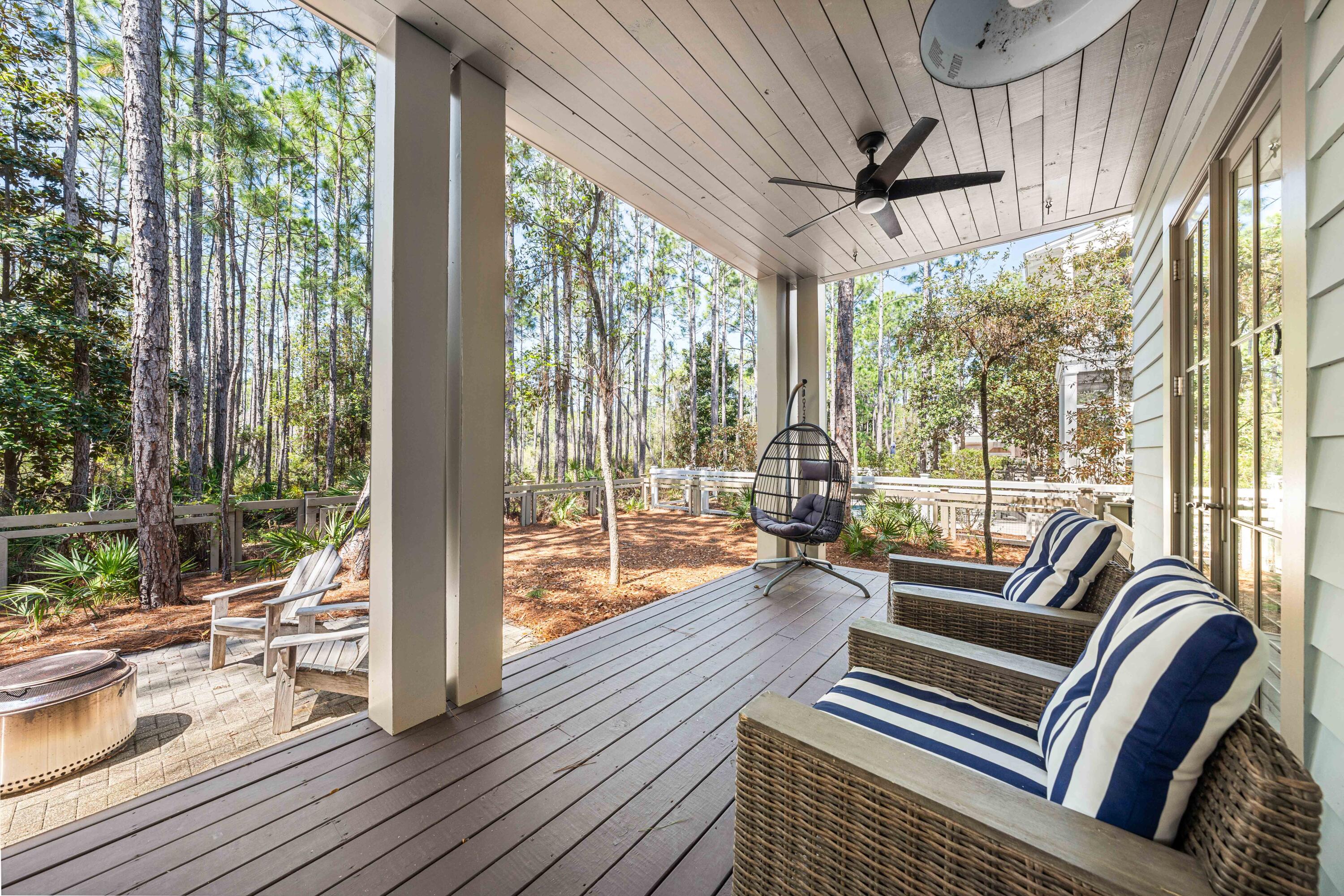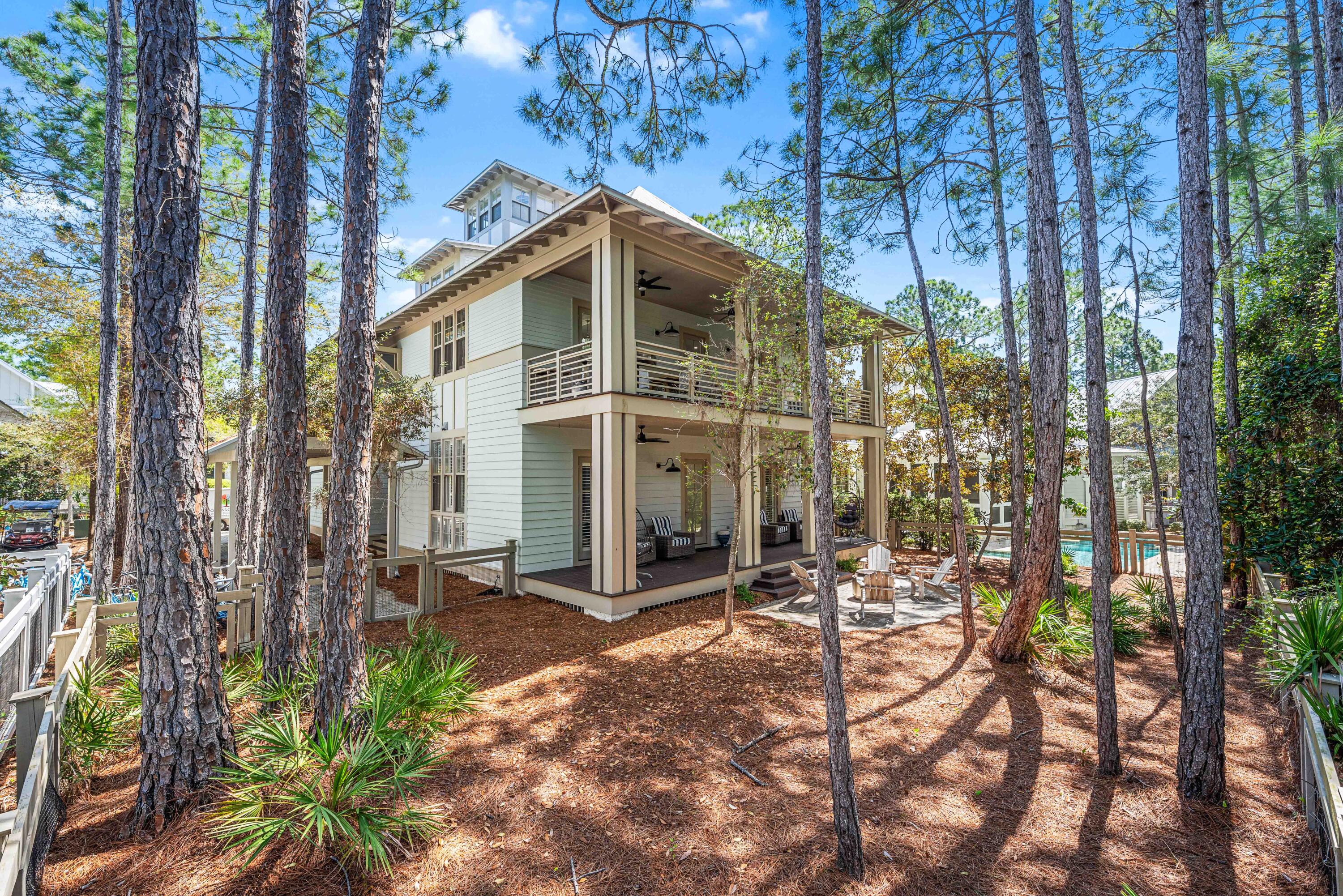 Nestled in the Forest District of WaterColor's Phase II, 114 Pine Needle is a stunning 6-bedroom, 6.5-bathroom cottage blending classic Florida charm with modern comfort. Bright white walls, cheerful furnishings, and coastal blue accents create a warm, inviting atmosphere. Five bedrooms feature en suite baths, with ample space for any group. The 2nd floor entertains with a huge open living area, kitchen, and dining that spills onto a 34' wide deck overlooking the private preserve. The 3rd & 4th floors offer a kids/sitting room and tower with mini kitchen--perfect for sunset views. Three sitting areas and five spacious porches ensure relaxation and connection for large families. Conveniently near Camp WaterColor and a short bike ride to the Gulf Front Beach Club with 3 pools along the Gulf Golf Cart included