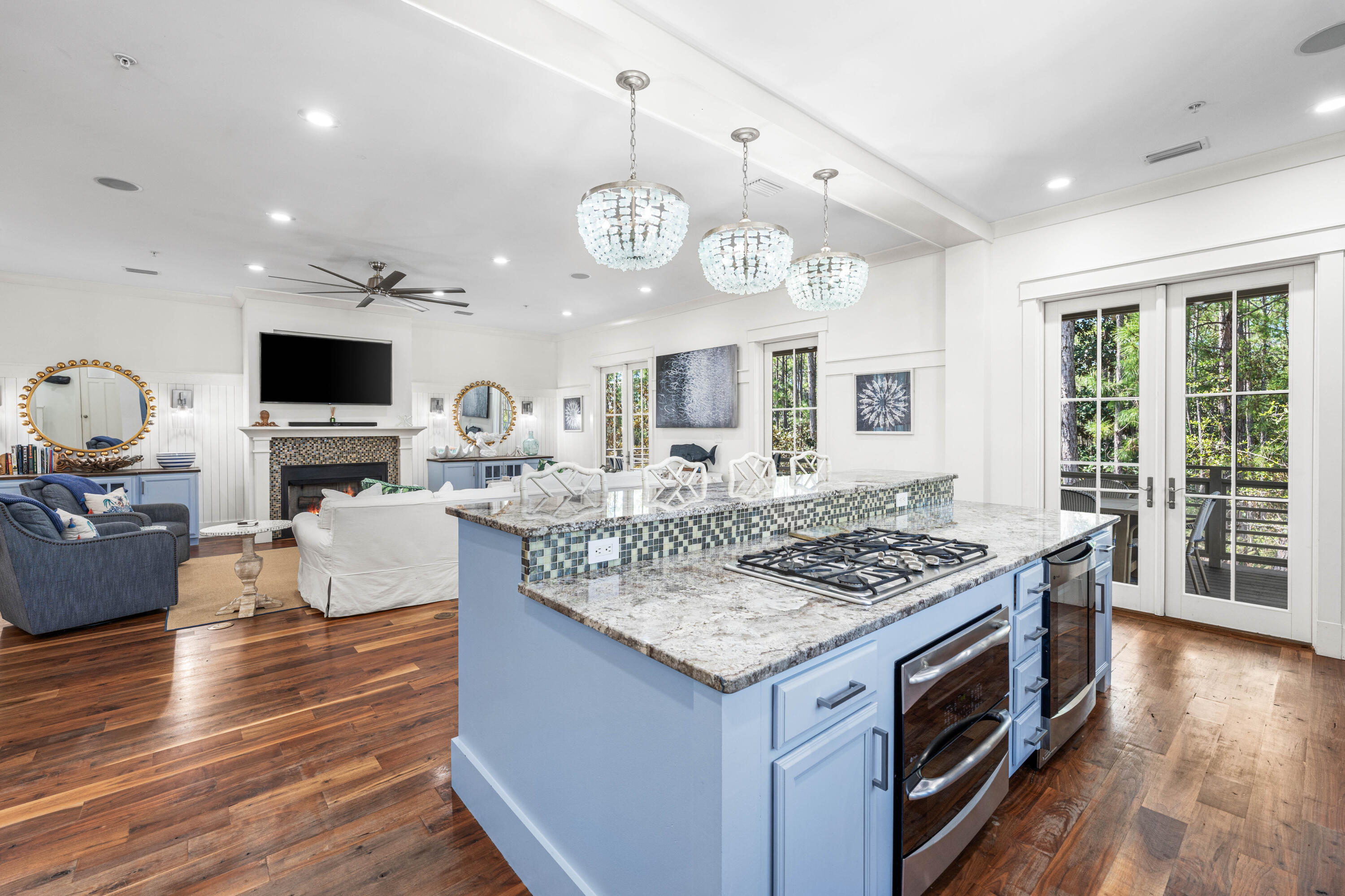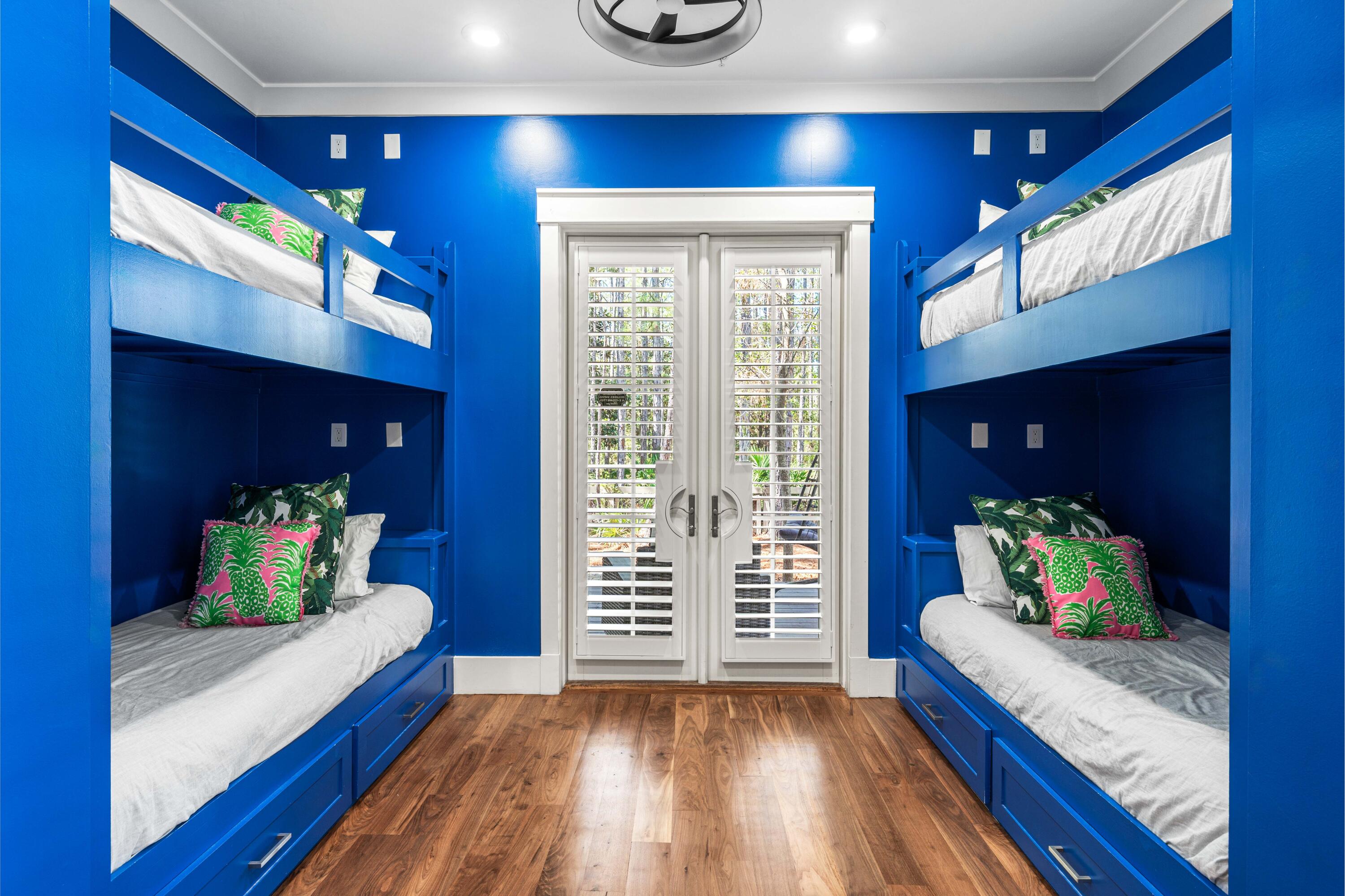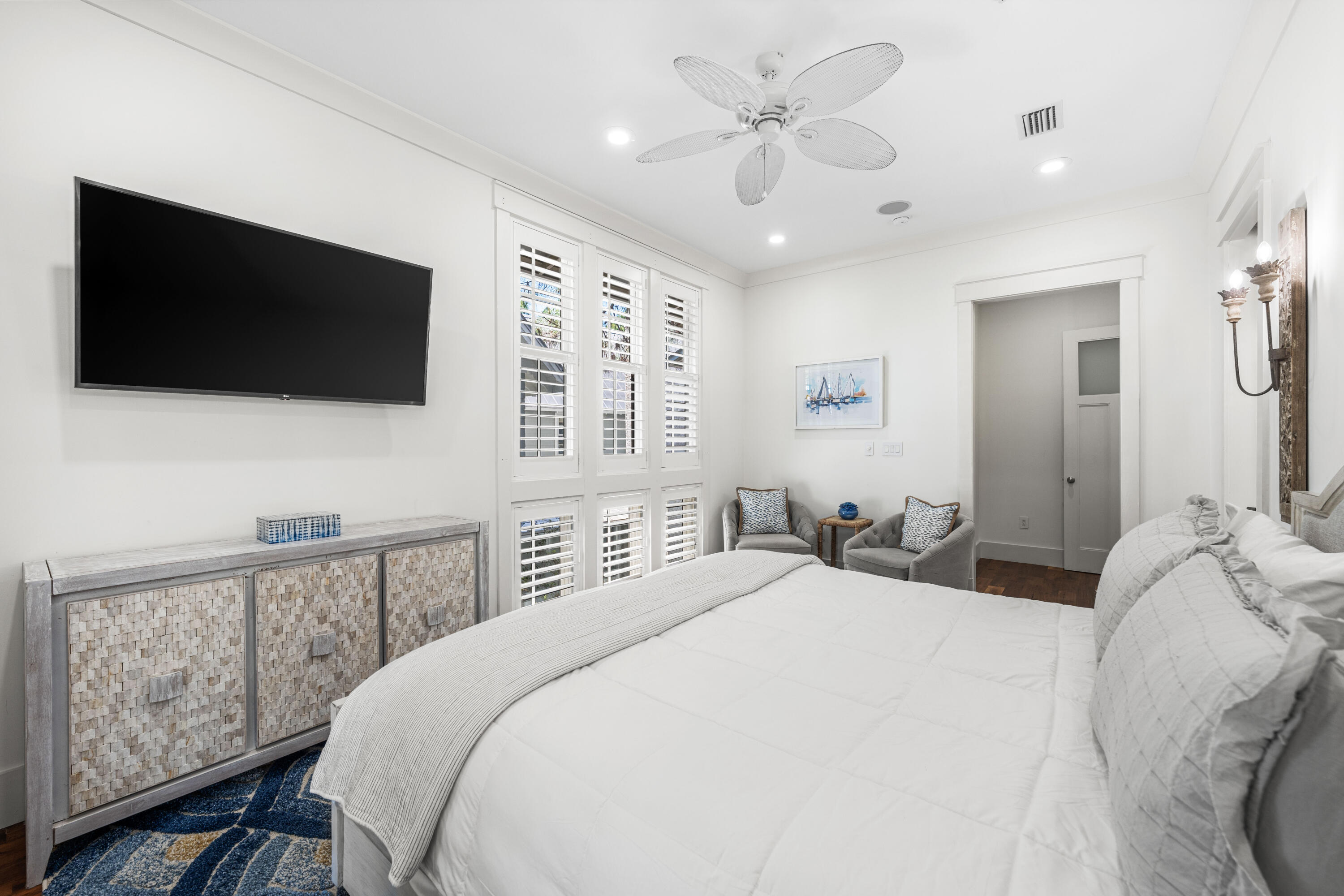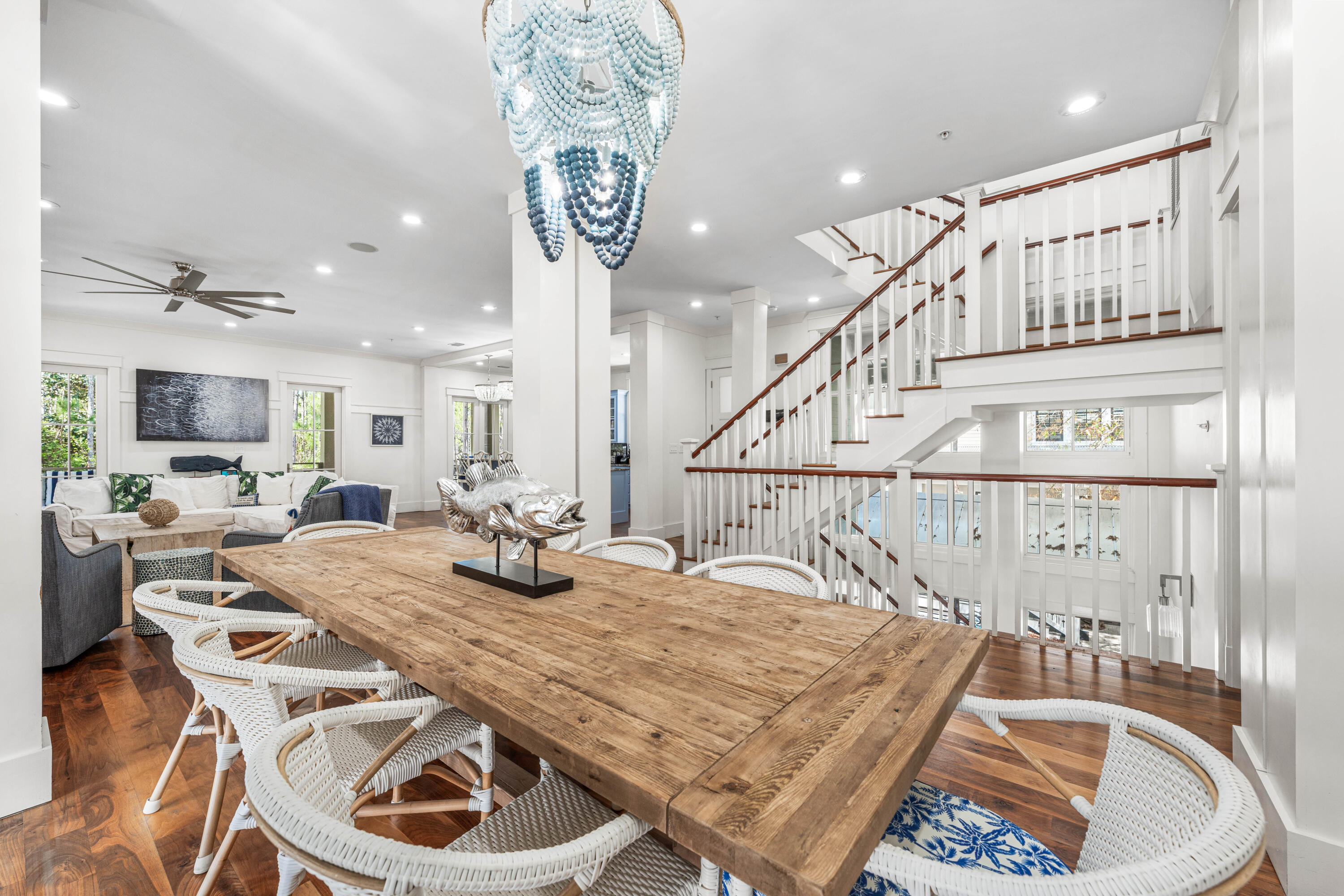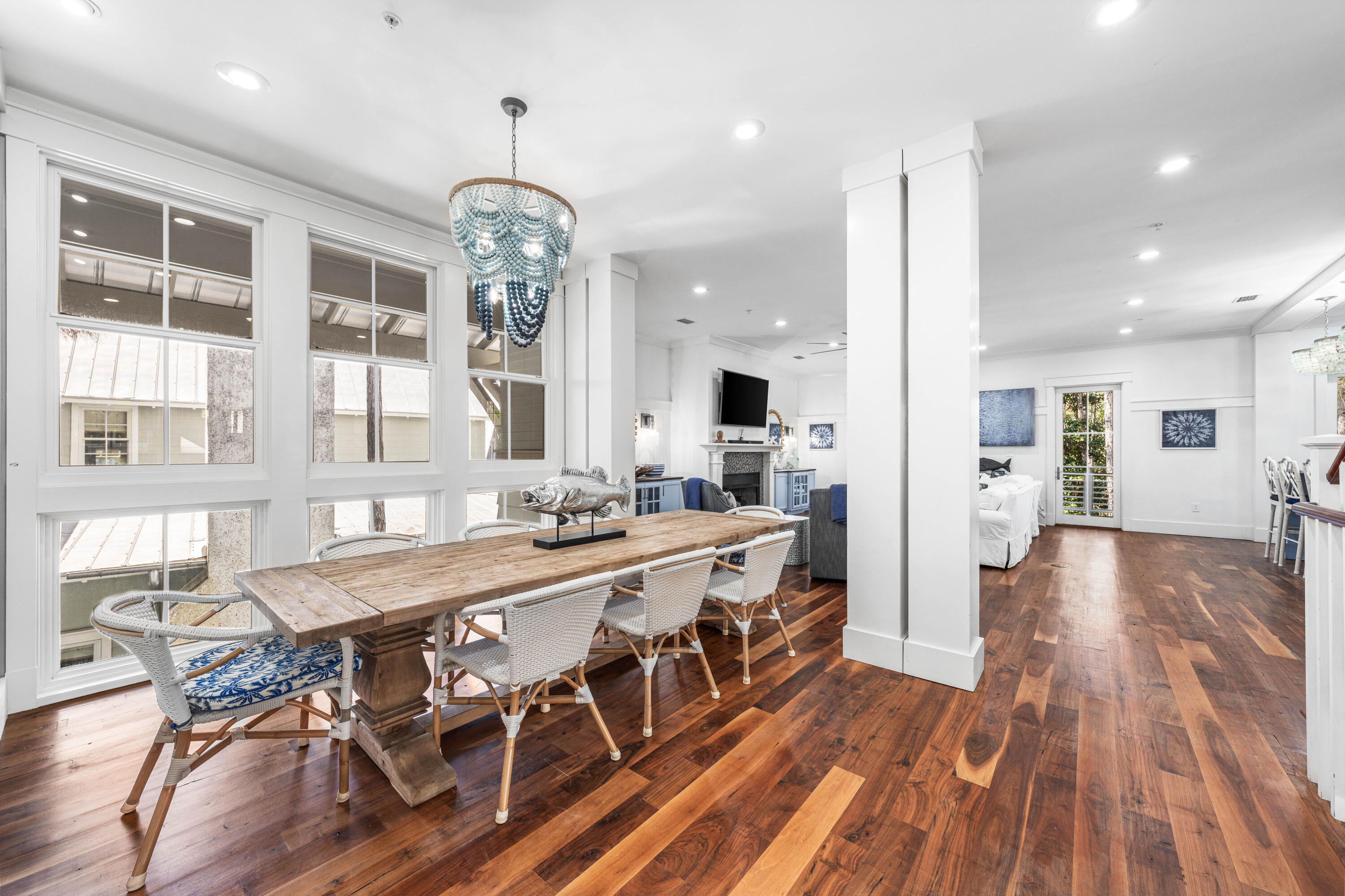 Nestled in the Forest District of WaterColor's Phase II, 114 Pine Needle is a stunning 6-bedroom, 6.5-bathroom cottage blending classic Florida charm with modern comfort. Bright white walls, cheerful furnishings, and coastal blue accents create a warm, inviting atmosphere. Five bedrooms feature en suite baths, with ample space for any group. The 2nd floor entertains with a huge open living area, kitchen, and dining that spills onto a 34' wide deck overlooking the private preserve. The 3rd & 4th floors offer a kids/sitting room and tower with mini kitchen--perfect for sunset views. Three sitting areas and five spacious porches ensure relaxation and connection for large families. Conveniently near Camp WaterColor and a short bike ride to the Gulf Front Beach Club with 3 pools along the Gulf Golf Cart included