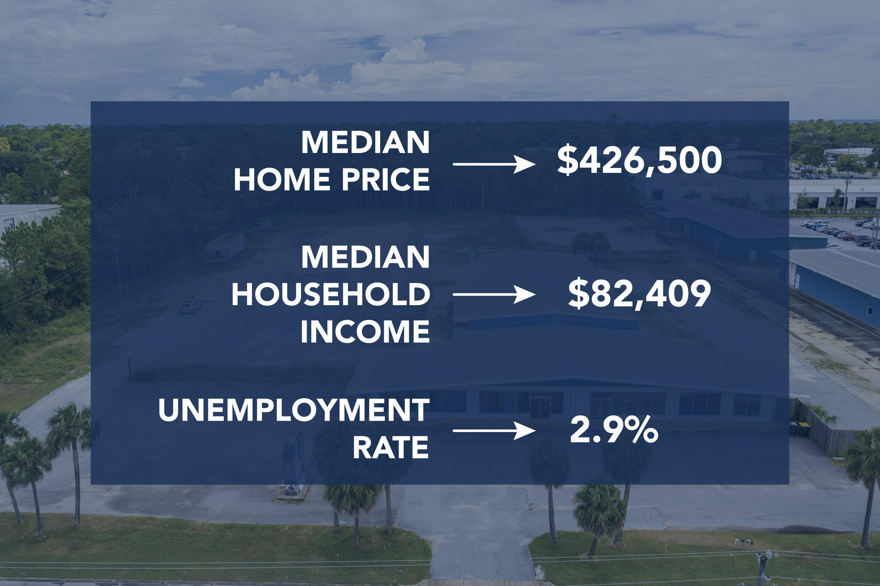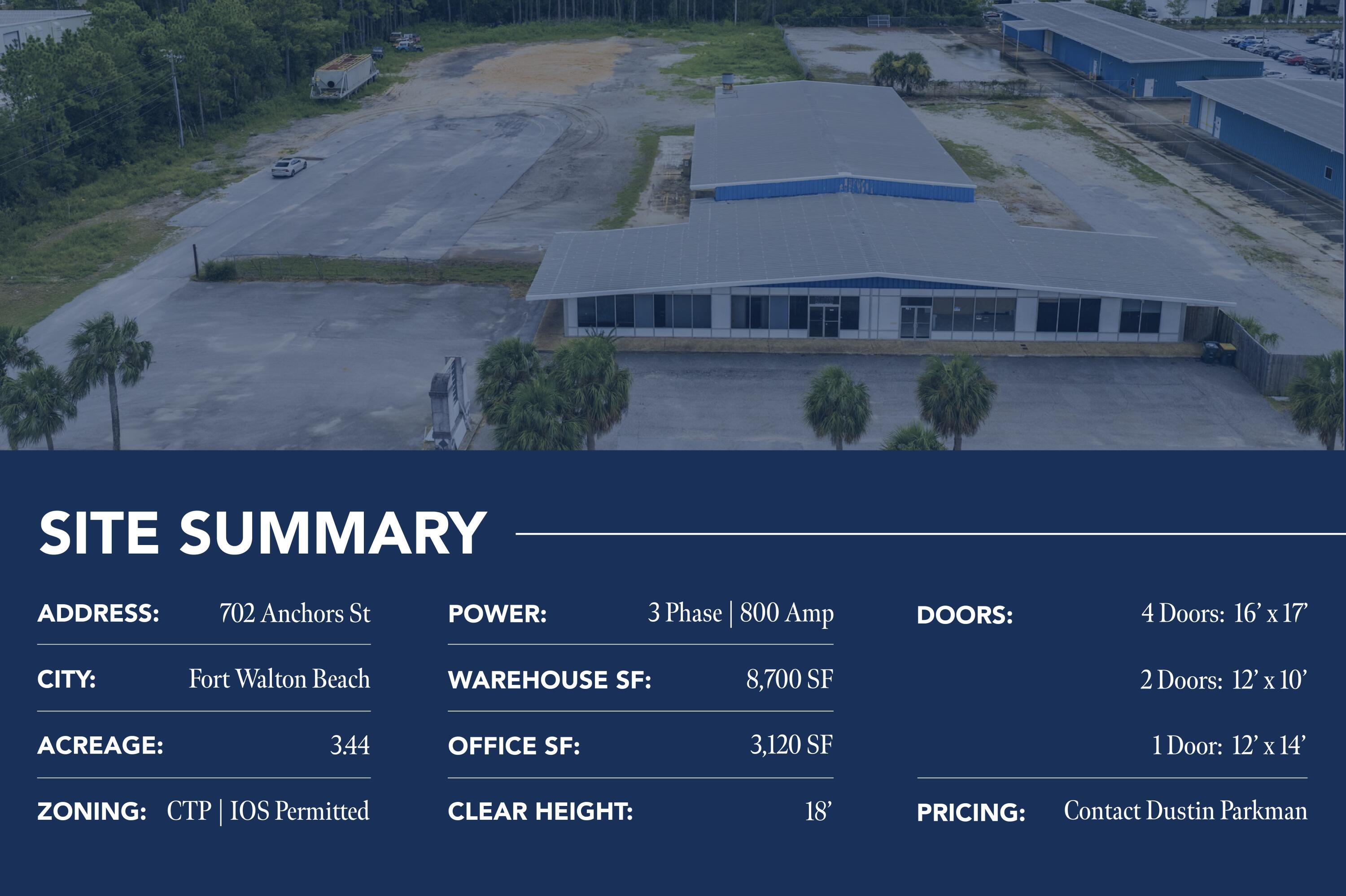 This 11,820 square foot flex building in Fort Walton Beach offers a highly functional mix of 8,700 square feet of warehouse space and 3,120 square feet of office and showroom space. Situated on 3.45 acres, the property provides a rare advantage in the market with a large outdoor yard and storage area, ideal for businesses requiring both indoor operational space and secure exterior use.Centrally located, the site offers convenient access to Pensacola (38 miles), Crestview (30 miles), and Panama City (52 miles), while sitting directly between Hurlburt Field and Eglin Air Force Base. The property also benefits from its position within the strong feeder market to Destin, 30A, and numerous surrounding coastal communities.