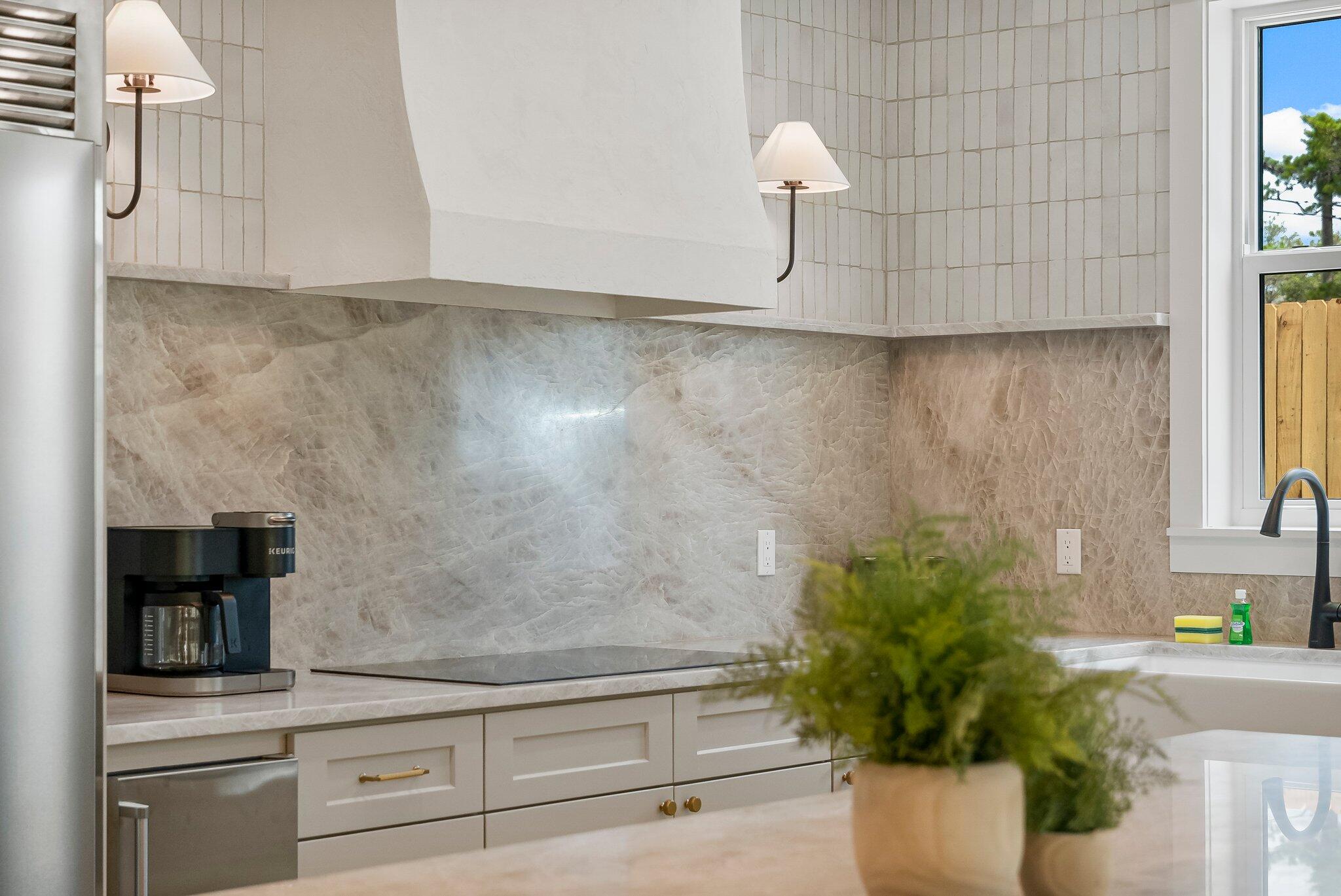 * Large designer chef's kitchen with Taj Mahal quartzite, oversized island, walk-in pantry, stunning tile & design