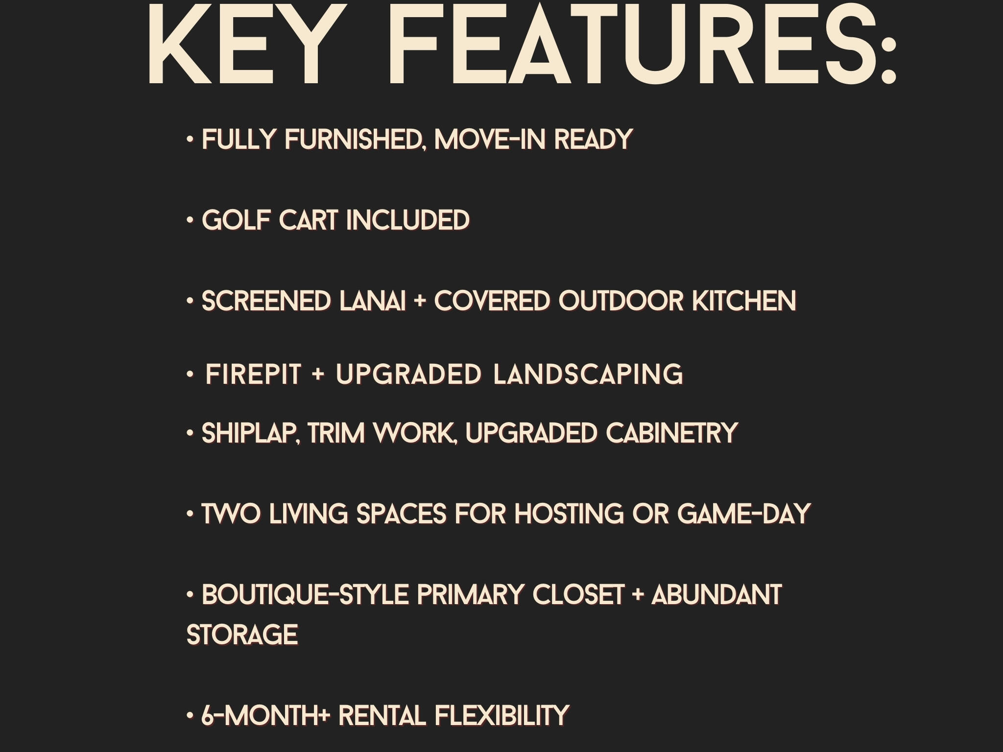 With the golf cart included and every detail turnkey and furnished, this home delivers immediate, elevated living in NatureWalk at Watersound Origins. Exceptional curb appeal features a gas lantern, custom shutters, a custom-painted front door, enhanced landscaping, a screened-in lanai, a covered outdoor kitchen, and a firepit for cool evenings. Inside, upgraded trim work, paneling, shiplap, enhanced cabinetry, a central fireplace, and abundant closet space create a refined yet comfortable setting. Enjoy instant access to Lake Powell, community pools, fitness, trails, golf, shopping, dining, and the option for 6-month+ rentals. The included golf cart allows instant access to everything that defines the NatureWalk at Watersound Origins lifestylecommunity pools, fitness center, Origins golf course, Lake Powell, and nearby shopping and restaurants. It creates an easy, car-free rhythm that works beautifully for families, guests, and seasonal owners.