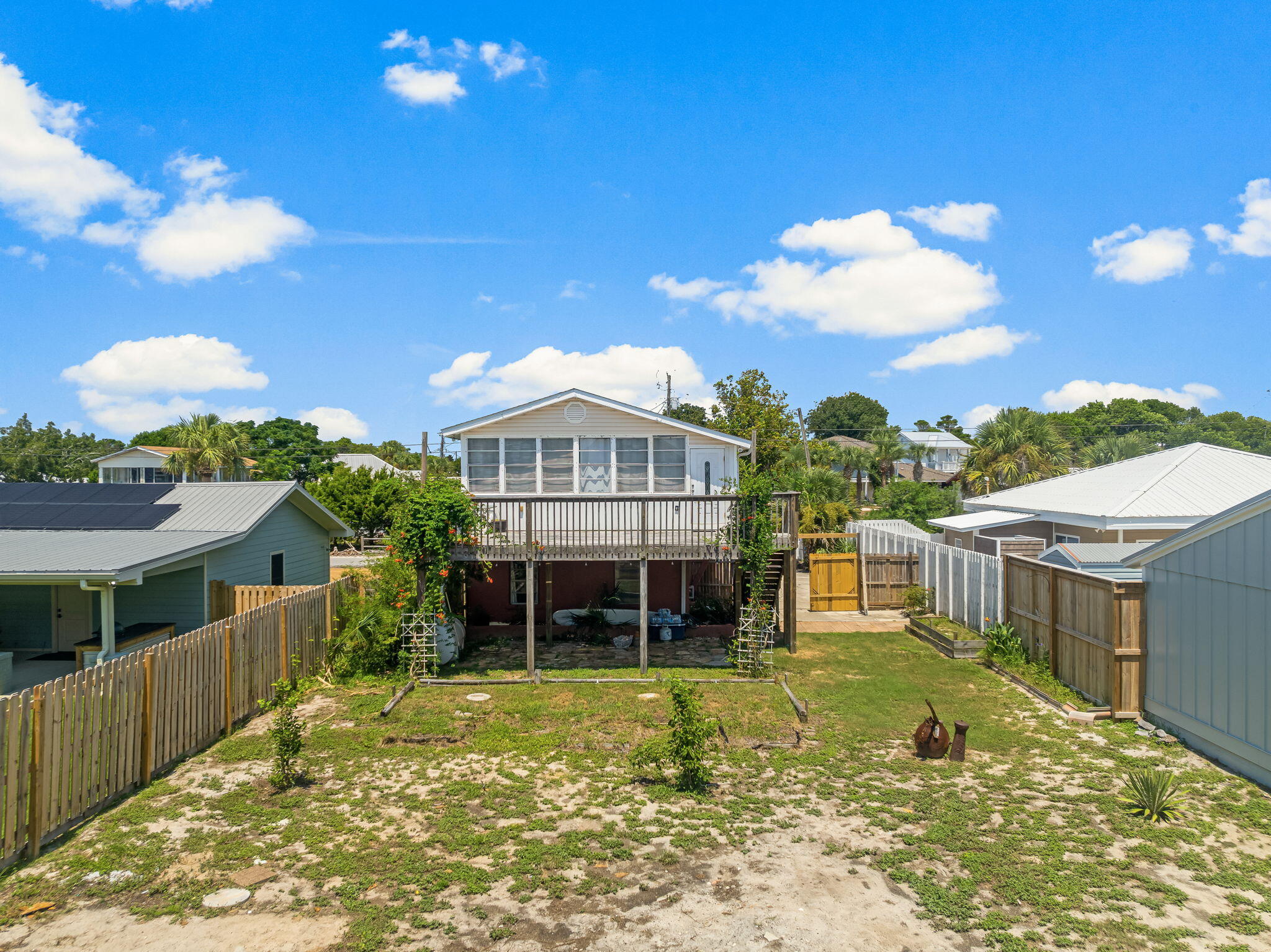 Discover a prime investment opportunity in Panama City Beach's coveted west end, just 0.2-miles from doorstep to Public Beach Access #92 and the Gulf's white sand beaches. Only 4 miles from upscale dining and shopping at 30Avenue or Rosemary Beach, and 7 miles from Pier Park and Frank Brown Park--home to events like Gulf Coast Jam--this location is unmatched for coastal living. This versatile duplex offers flexibility for buyers. The upstairs unit, with a kitchen, living area, dining space, one bedroom, and a full bathroom, can be reconfigured into a two-bedroom, one-bath layout. Enjoy a spacious 26' x 16' balcony with partial Gulf views and a sunroom, perfect for relaxing or soaking in sunsets. The downstairs unit has a ground level entry into the open living, dining and kitchen space. There are 2 bedrooms and a full bathroom downstairs. There is a single garage that is perfect for a golf cart and beach supplies. For savvy investors, this property is a rare find with multiple revenue streams. Continue its proven success with long-term or short-term rentals. There is ample space for a pool, carriage house, an addition and other enhancements. Unlike a single-family home, this duplex offers dual-income potential or the option to live in one unit while renting the other. This classic coastal gem blends timeless charm with significant investment potential in one of Florida's premier beach destinations.