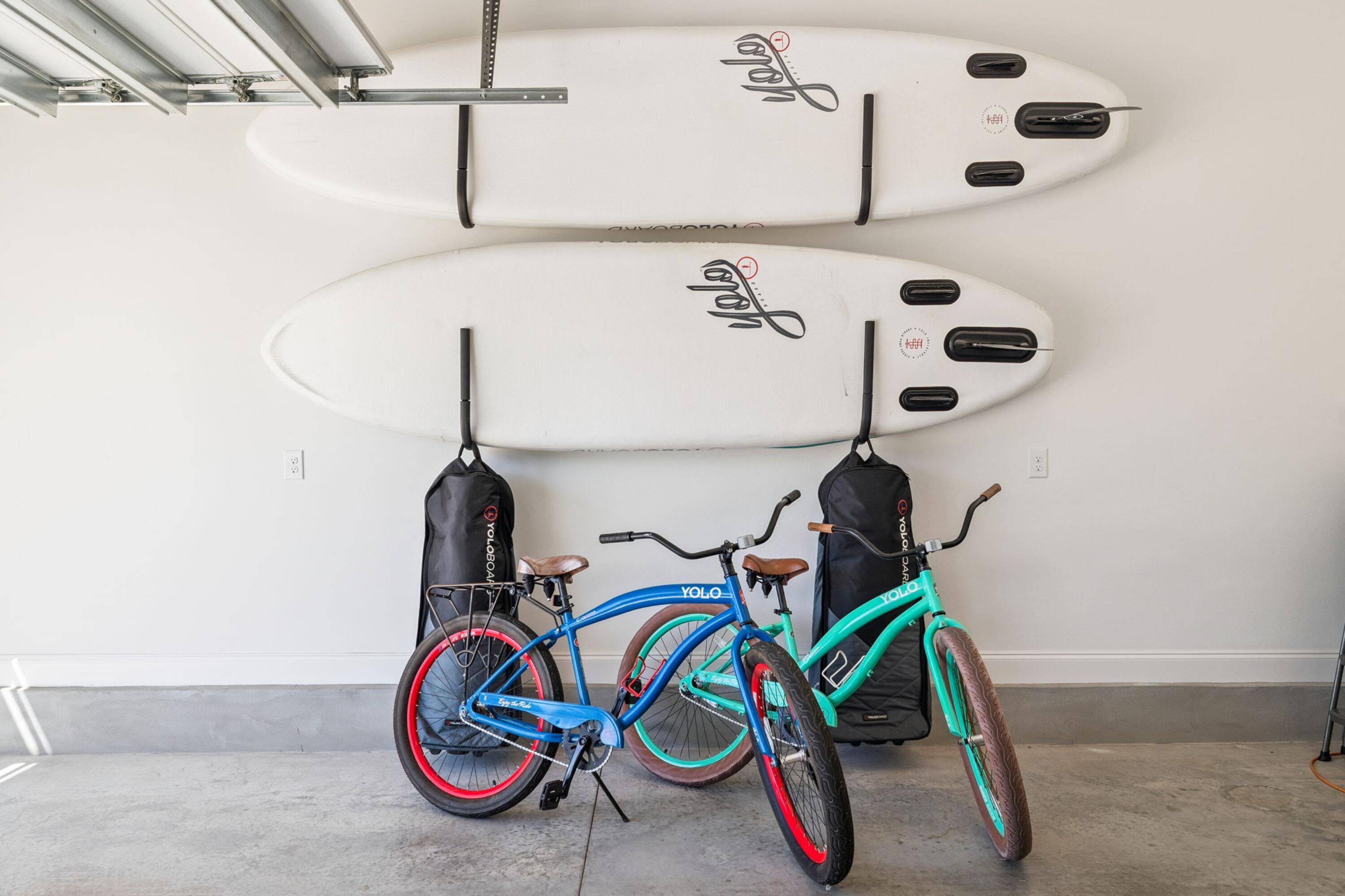 Additional highlights include upgraded, melamine wrapped wood closets throughout (no wire shelving), an automated irrigation system for effortless upkeep, a well-equipped Laundry Room with GE Profile Top-Load Washer and Dryer along with a set of upper cabinets for additional storage. You'll also discover a pair of YOLO Stand-Up Inflatable Paddle Boards and Beach Cruiser Bikes in the spacious two-car garage, which are yours to enjoy with the purchase of this home.
