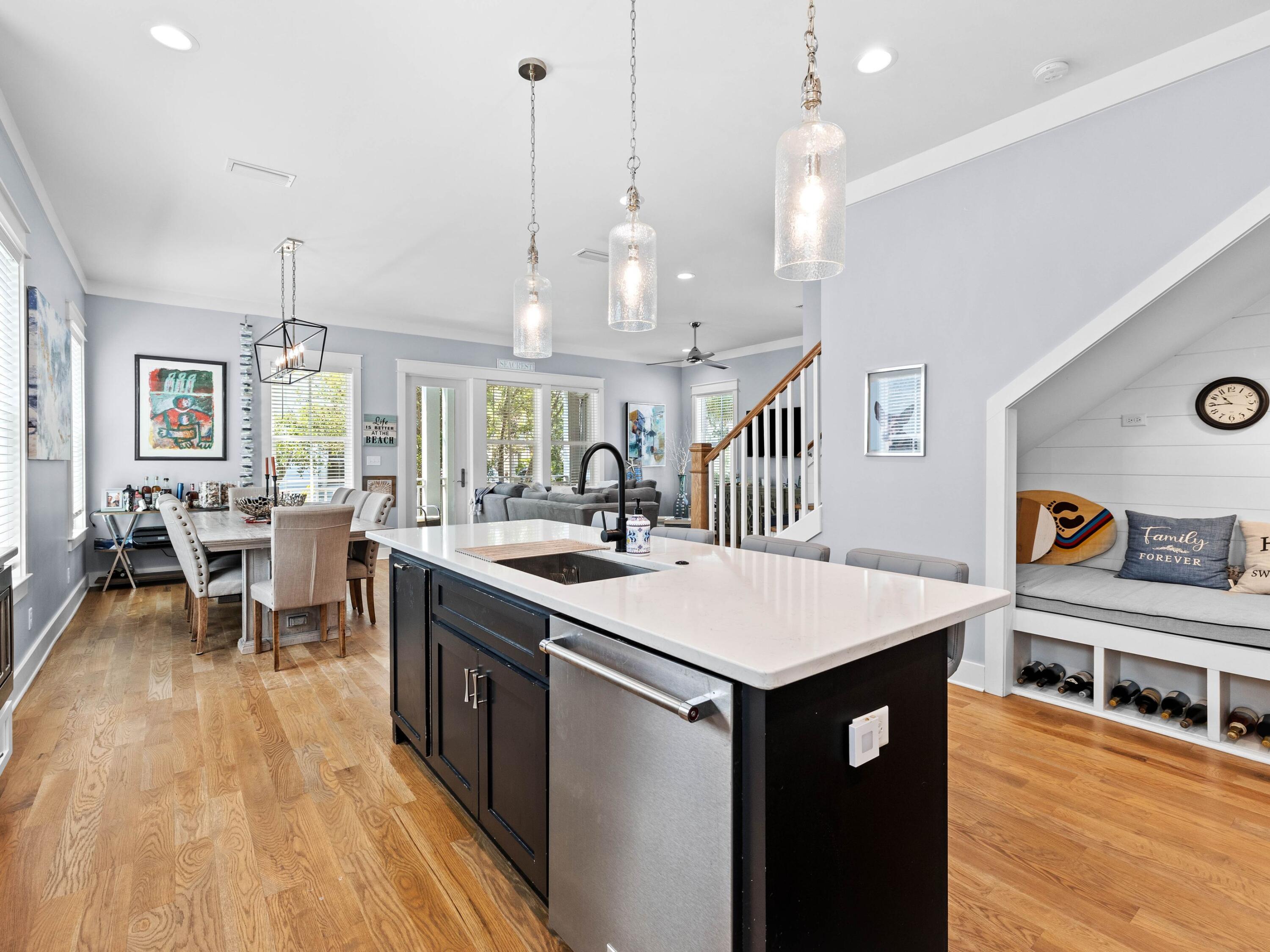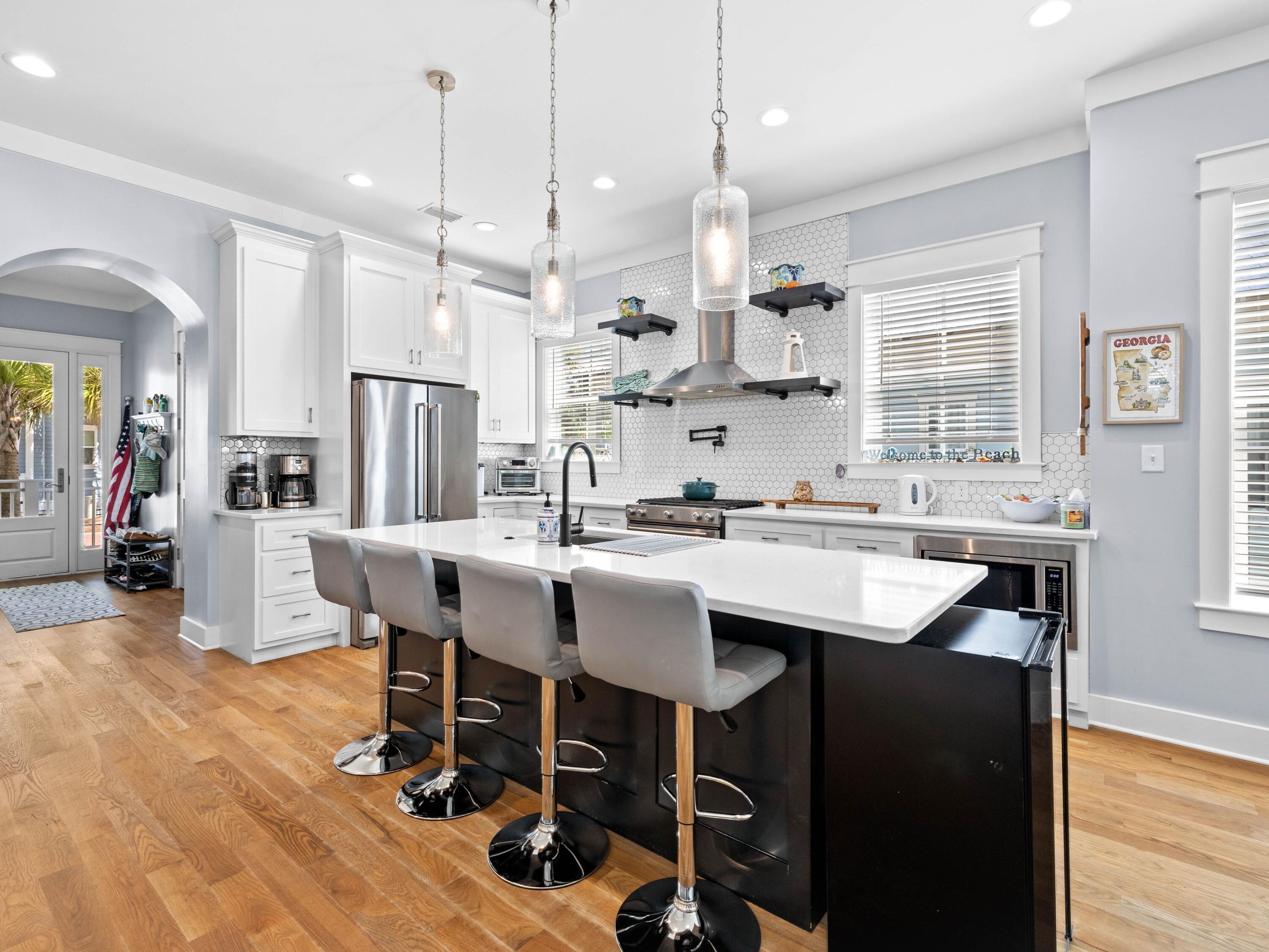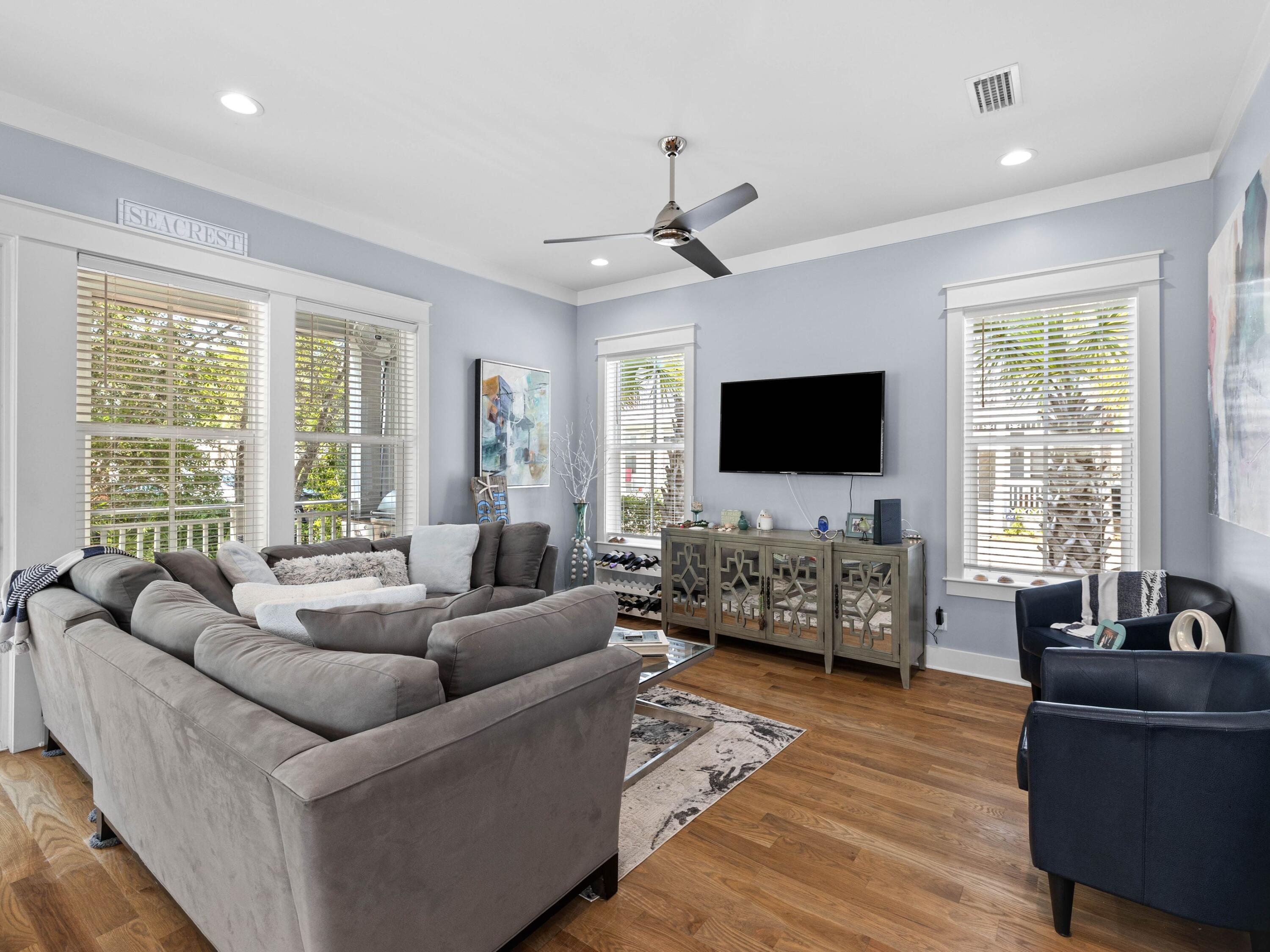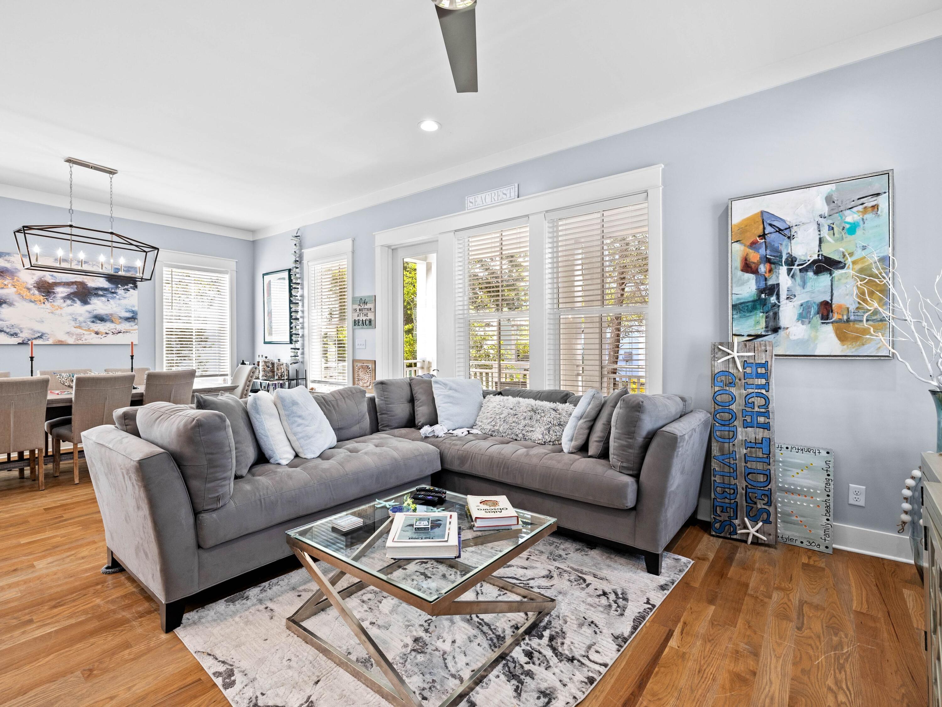 Welcome to your dream coastal retreat, nestled on a prime corner lot in the highly sought-after Seacrest Beach community. This stunning beach home, never rented and meticulously maintained by its original owners, offers the perfect blend of luxury, comfort and convenience. With four spacious porches, each equipped with misters and fans, this home is designed for outdoor living at its finest. This elegantly furnished property is ideal for a primary residence, vacation home or rental investment. Inside, you'll find exquisite fixtures and finishes, including polished hardwood floors and a gourmet kitchen with quartz countertops and high-end KitchenAid appliances. The open-concept living area is perfect for family gatherings, featuring an informal dining room that seats 10 and additional seating at the kitchen island, all beneath charming pendant lighting. The home boasts two master suitesone on each flooralong with a queen guest suite, a bunk room with built-in bunks and a second bunk room with a twin over queen. Every detail has been thoughtfully considered, from the generous laundry room to the ample outdoor storage space. The outdoor kitchen and expansive porches provide ample space for entertaining after a day spent at the largest community pool on 30A or the nearby deeded Seacrest Beach. With the convenience of tram service to and from the beach, 24-hour security, and easy access to Seacrest's shopping and dining, this property is truly a rare find. Additionally, the home's landscaping features six fruit trees, adding to the charm and appeal of this exceptional residence. This is a unique opportunity to own a piece of paradise in Seacrest Beach, where you can enjoy the perfect balance of tranquility, luxury, and proximity to all the best that 30A offers.