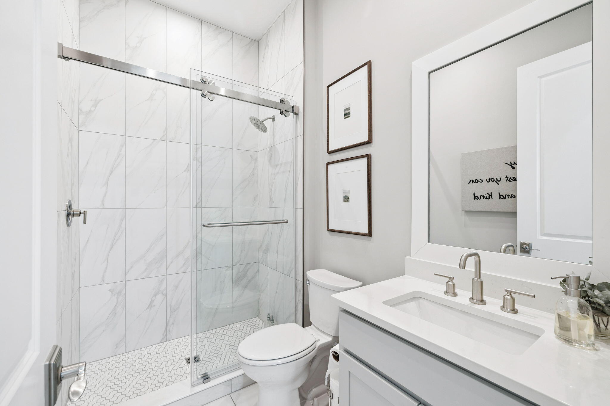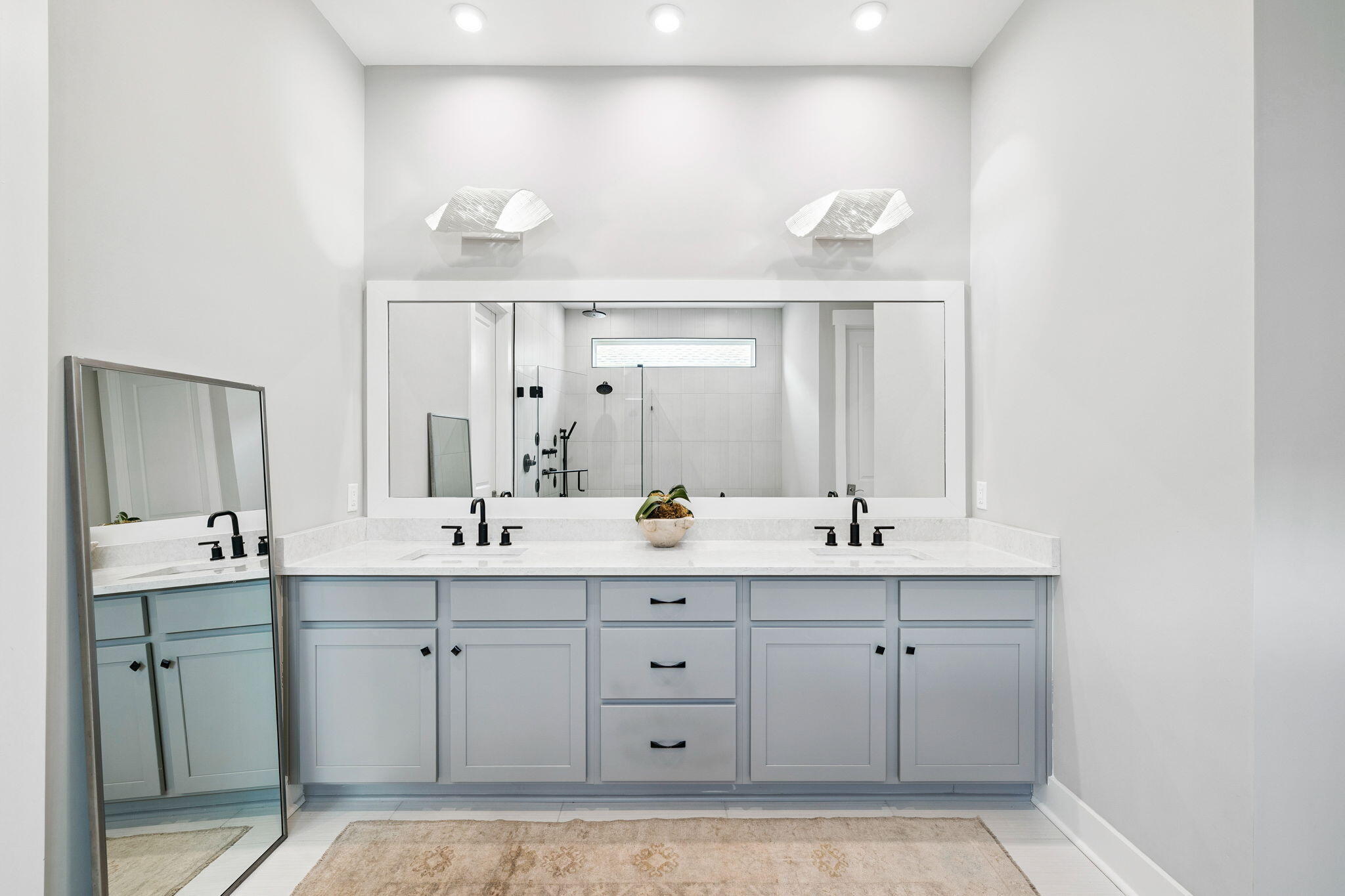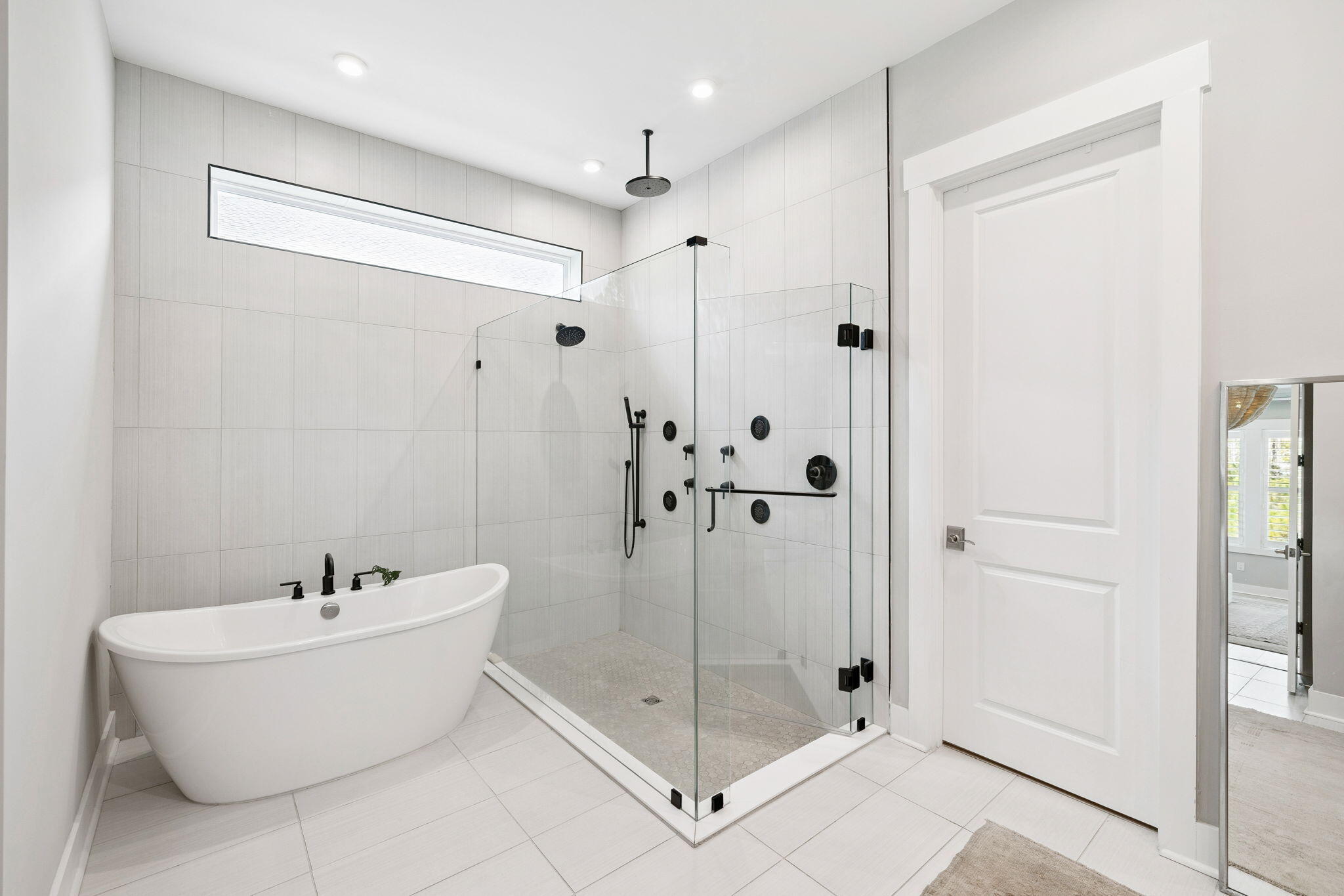 The primary suite on the main level is a true retreat, offering spa-like luxury with a massive walk-in shower, freestanding soaking tub, oversized double vanity, and a spectacular custom-designed walk-in closet. Upstairs, guests will enjoy a spacious secondary living area, a private en-suite bedroom, and two additional guest rooms that share another beautifully appointed bath.