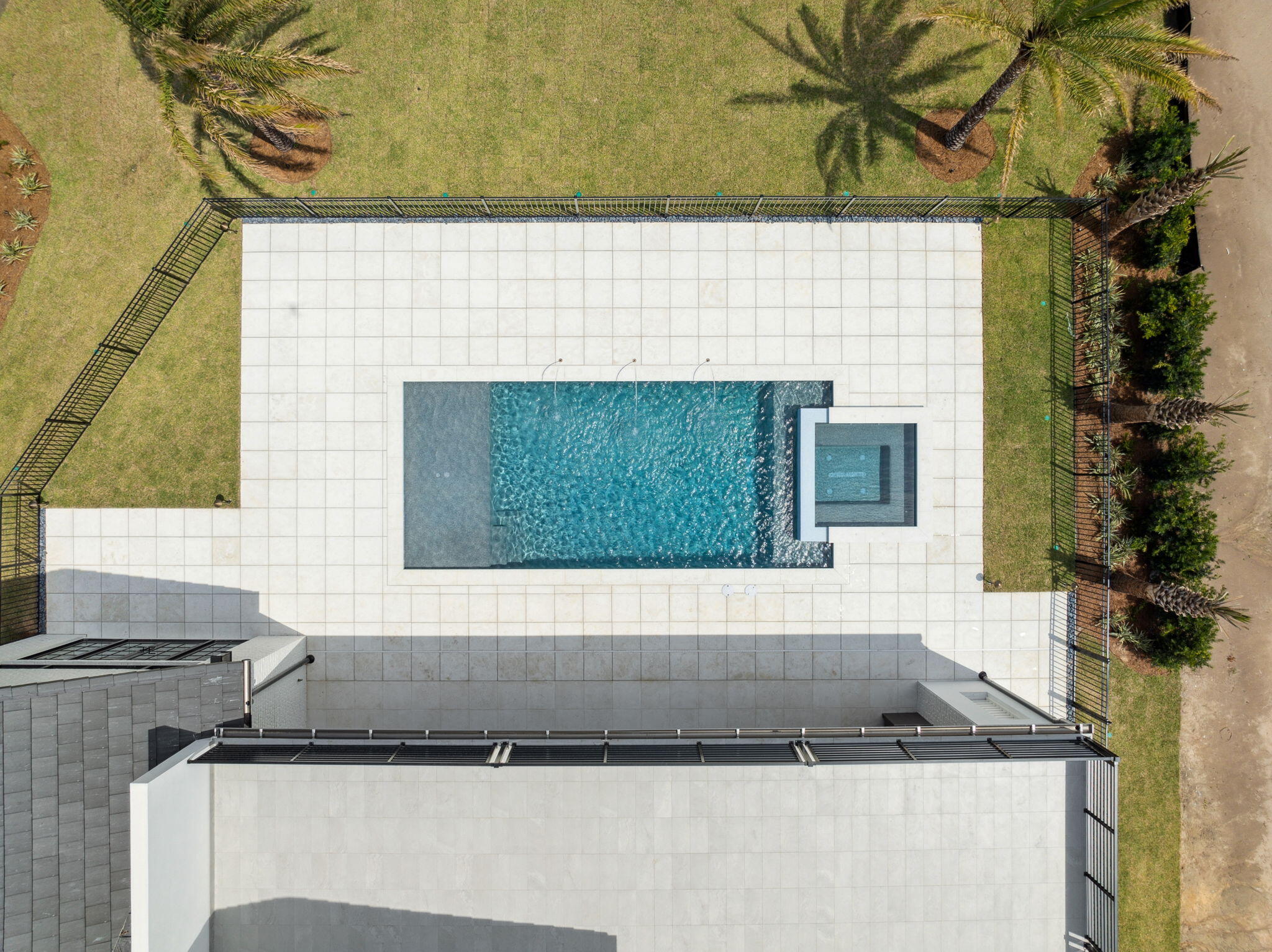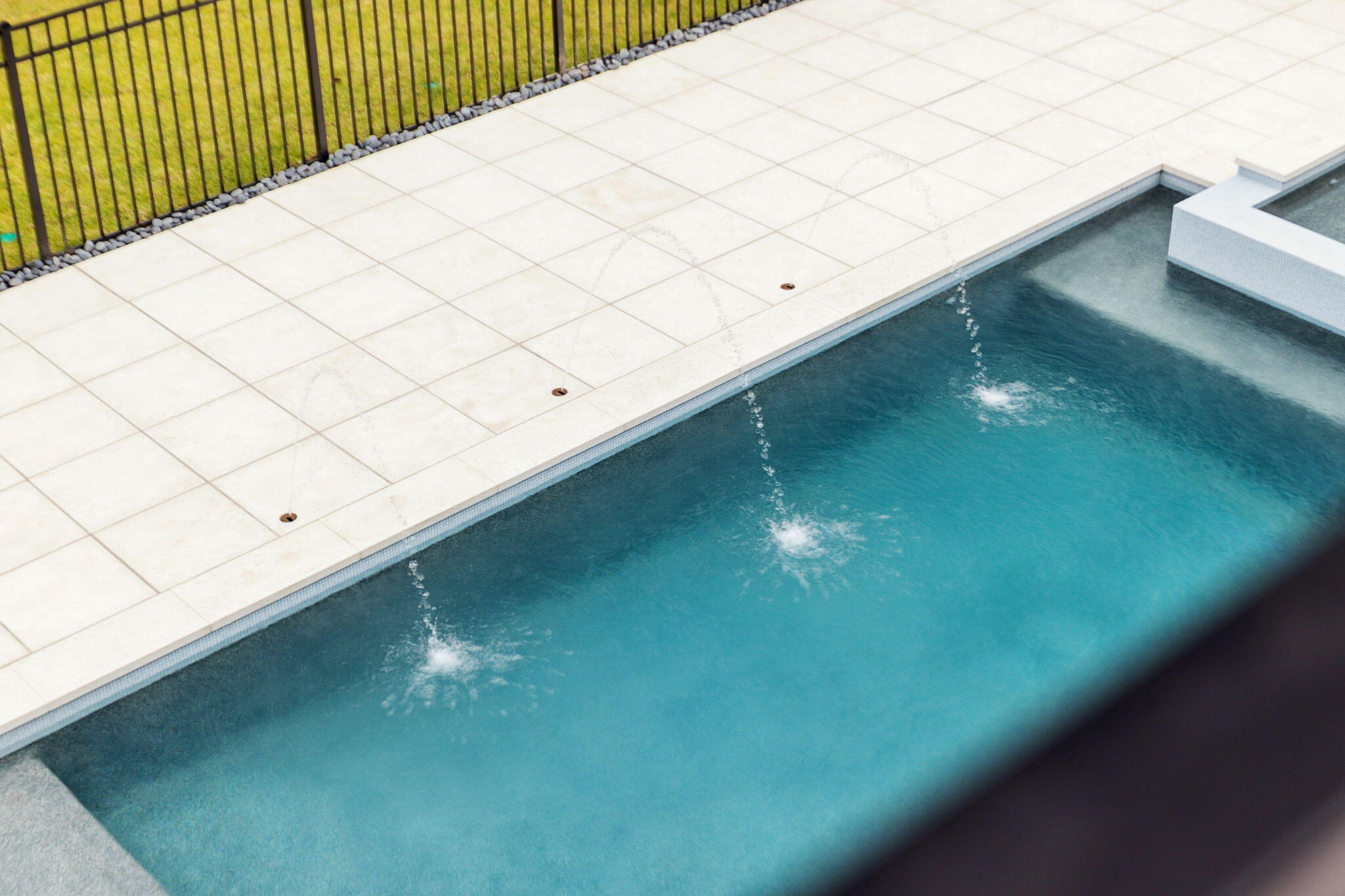 The backyard, thoughtfully positioned for privacy, features tranquil pond views and no home directly across the street. A custom mosaic tile pool and South Florida-inspired plaster finish reinforce the resort aesthetic. Upstairs, an oversized sun patio captures elevated views and coastal breezes perfect for morning coffee or sunset lounging.