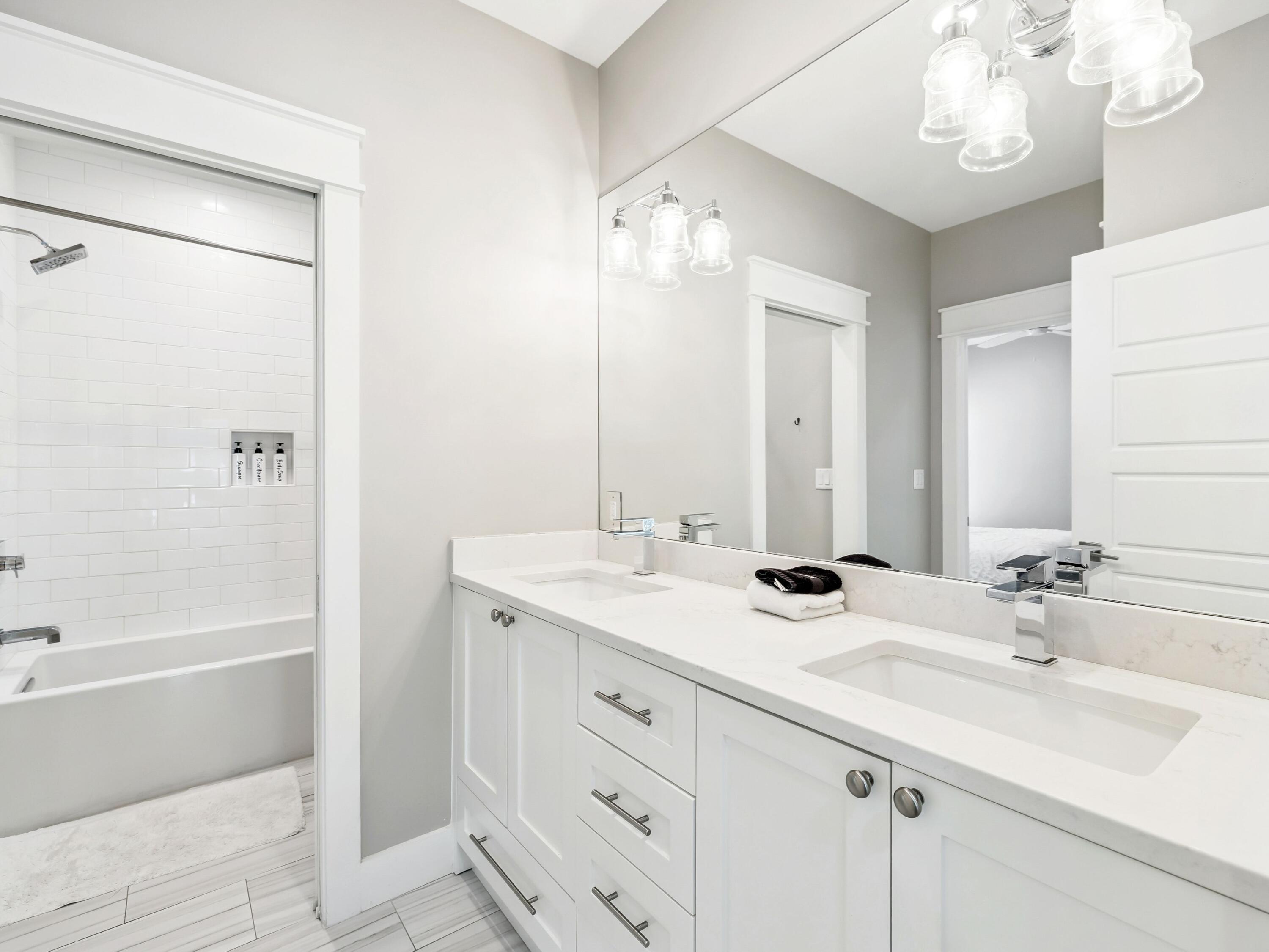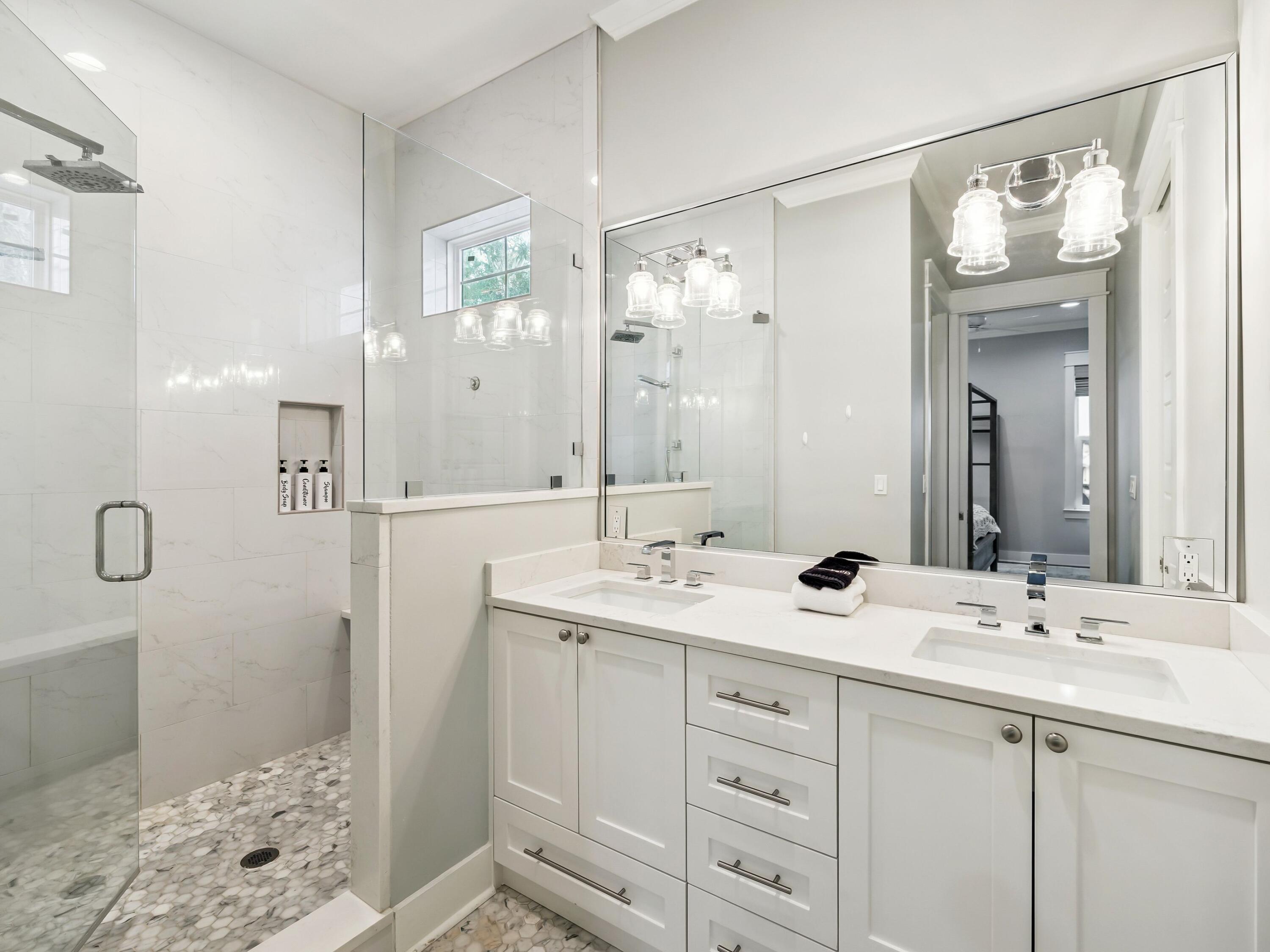 Each bedroom is thoughtfully designed for comfort, with spacious layouts and en suite baths featuring high-end tile and fixtures. The primary suite, located on the first floor, provides a serene retreat with a luxurious bathroom showcasing double vanities, a walk-in shower, and elegant finishes. Upstairs, additional guest suites offer privacy and flexibility, while the third-floor bonus room provides extra space for a bunk area, media room, or additional sleeping quarters.