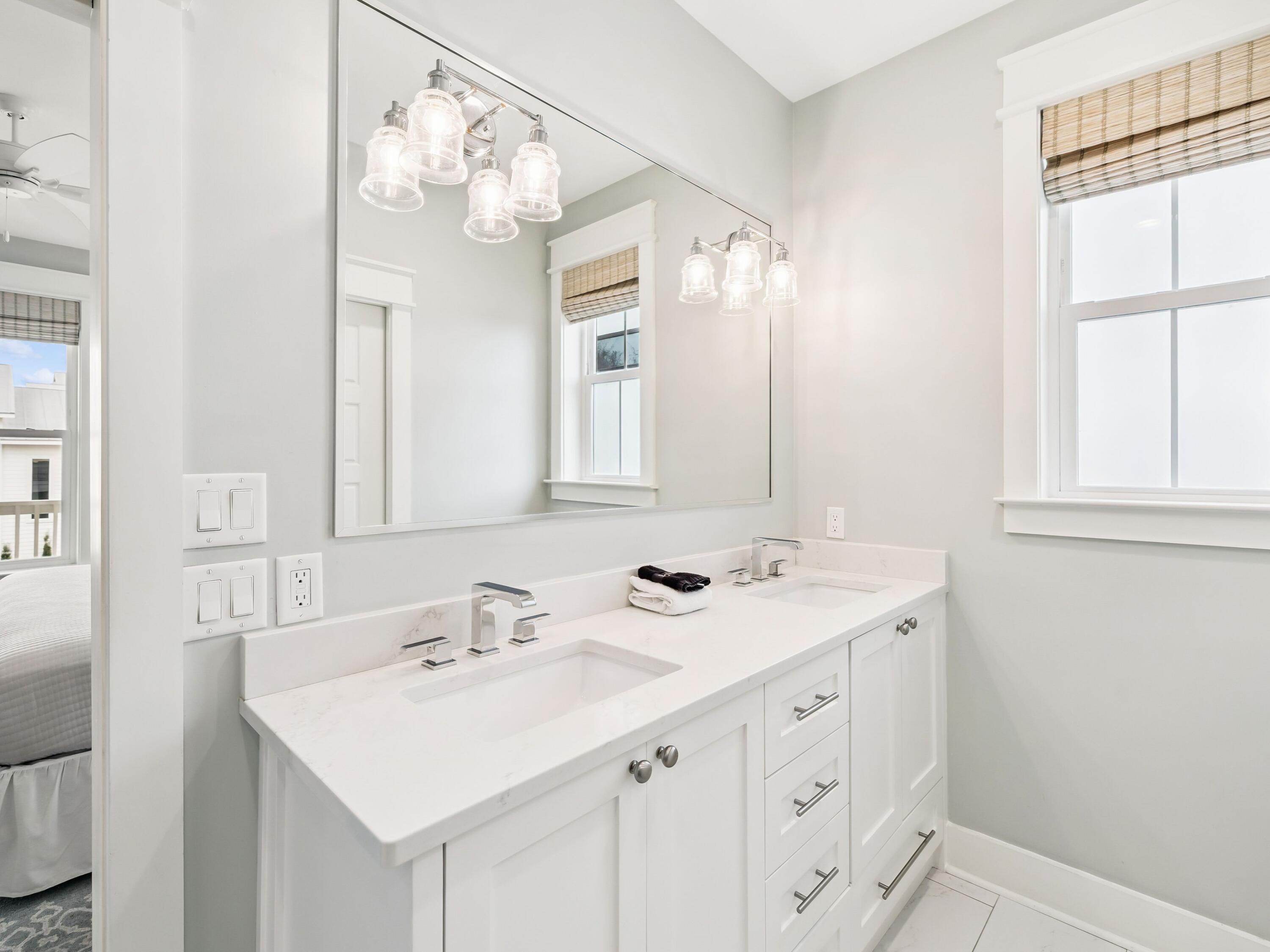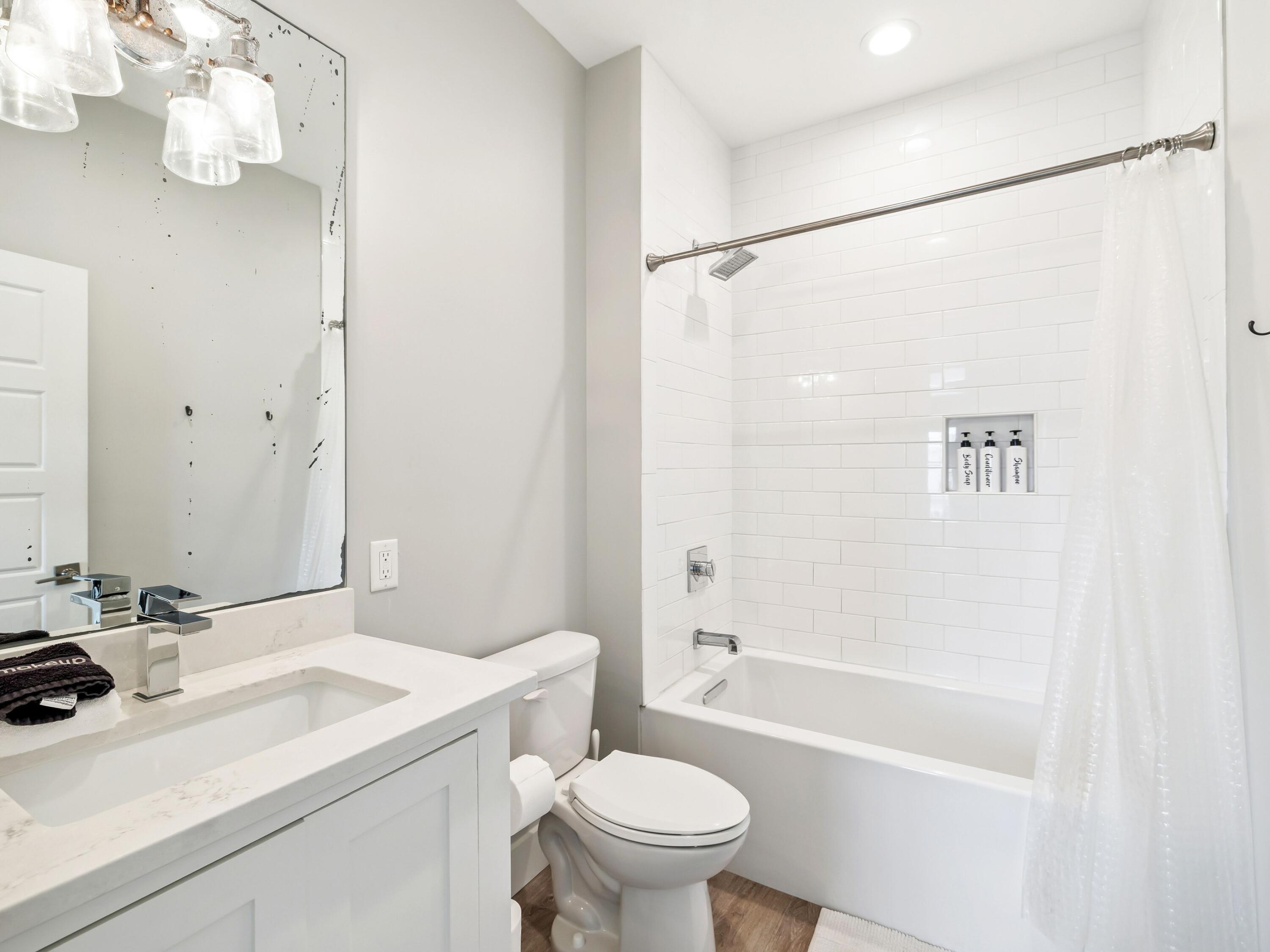 Welcome to this beautifully designed coastal retreat, ideally positioned in the heart of Inlet Beach just south of Highway 98. This three-story, five-bedroom, five-and-a-half-bath home offers the perfect balance of luxury and convenience, with multiple beach access points only steps away and Rosemary Beach, 30Avenue, dining, and boutique shops just minutes from your doorstep. Step inside to an inviting open-concept layout filled with natural light. The main living area features wide-plank luxury vinyl flooring, shiplap accents, and elegant crown molding, creating a refined yet relaxed coastal atmosphere. The chef's kitchen is anchored by an oversized quartz-topped island with seating for five, complemented by custom cabinetry, stainless steel KitchenAid appliances, and stylish lantern lighting. The living and dining spaces flow seamlessly together, making it ideal for entertaining family and friends.