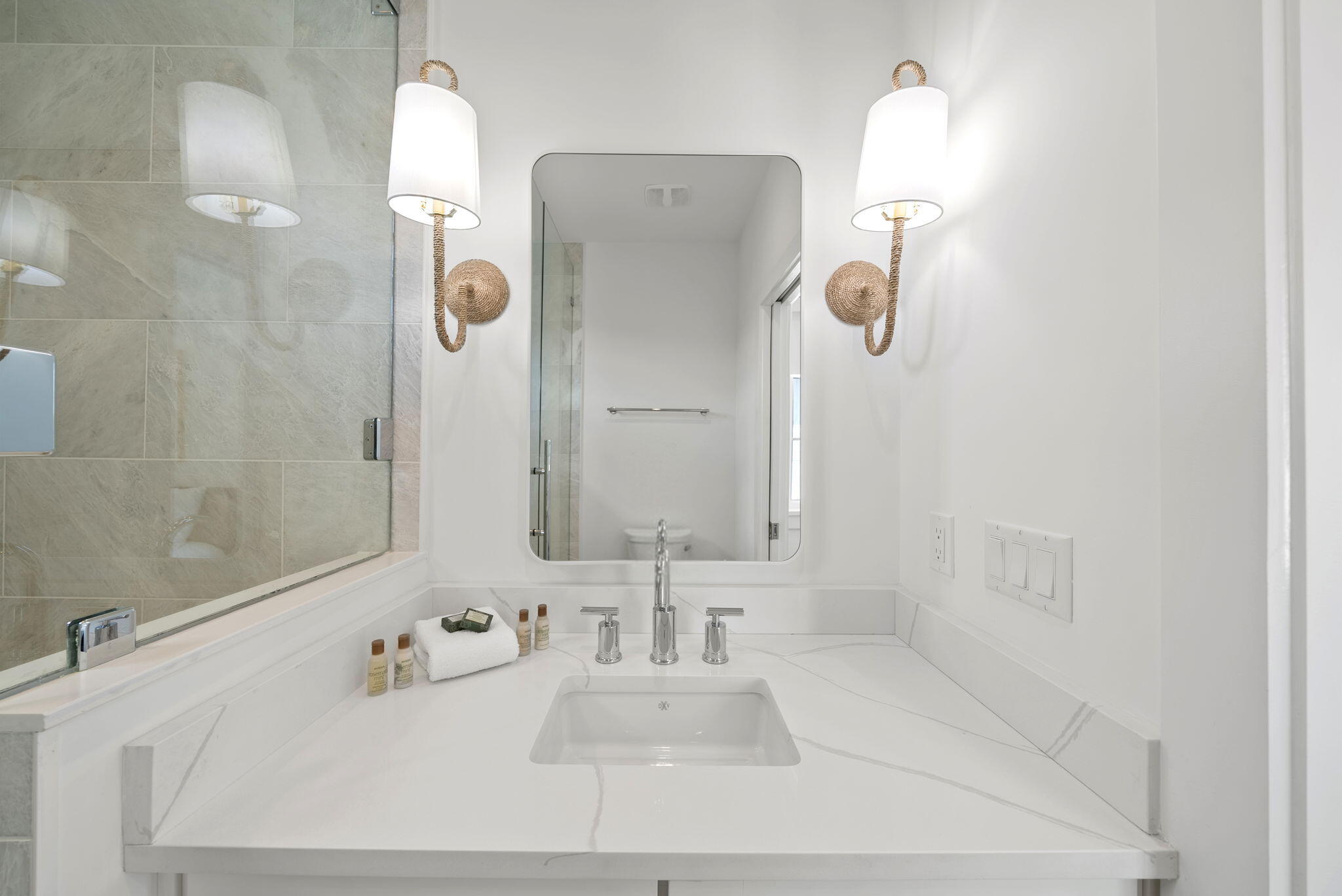 Guest suites and baths finished in high-end fixtures, quartz vanities, premium tile, and designer hardware