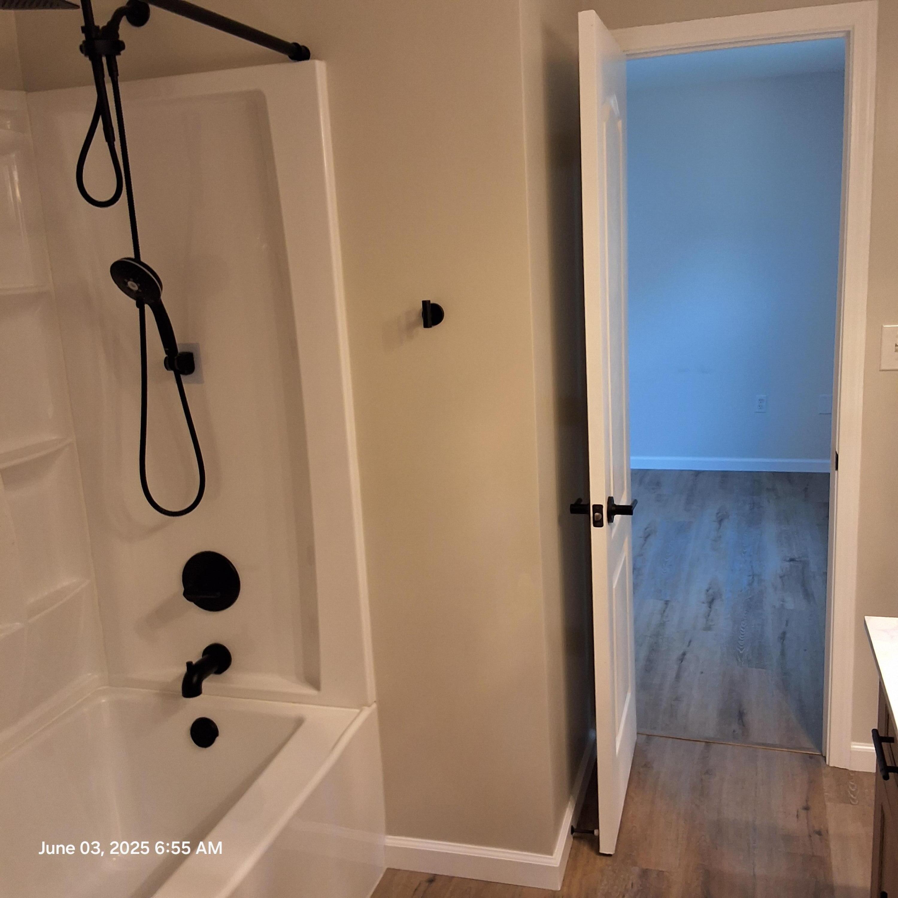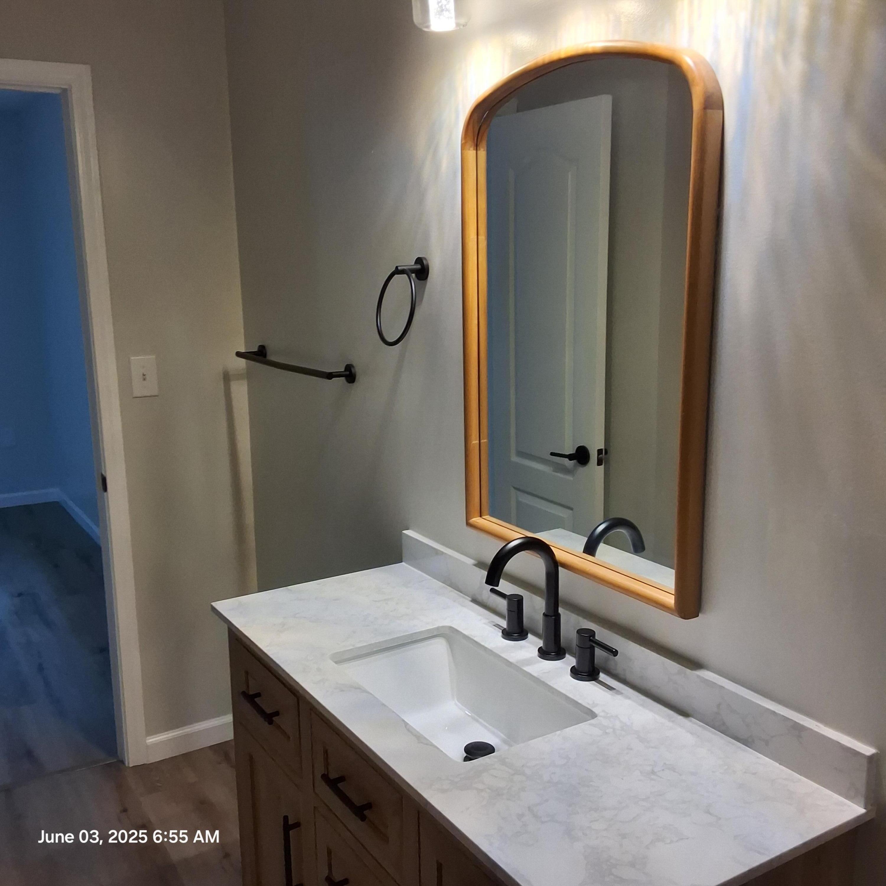 The kitchen is a showstopper, featuring custom solid wood shaker-style cabinets, granite countertops, stainless steel appliances, and a deep farmhouse sink perfect for both everyday meals and entertaining guests. The first-floor primary bedroom opens to a private patio, while the primary bathroom boasts a double vanity with double sinks and a quartz top.