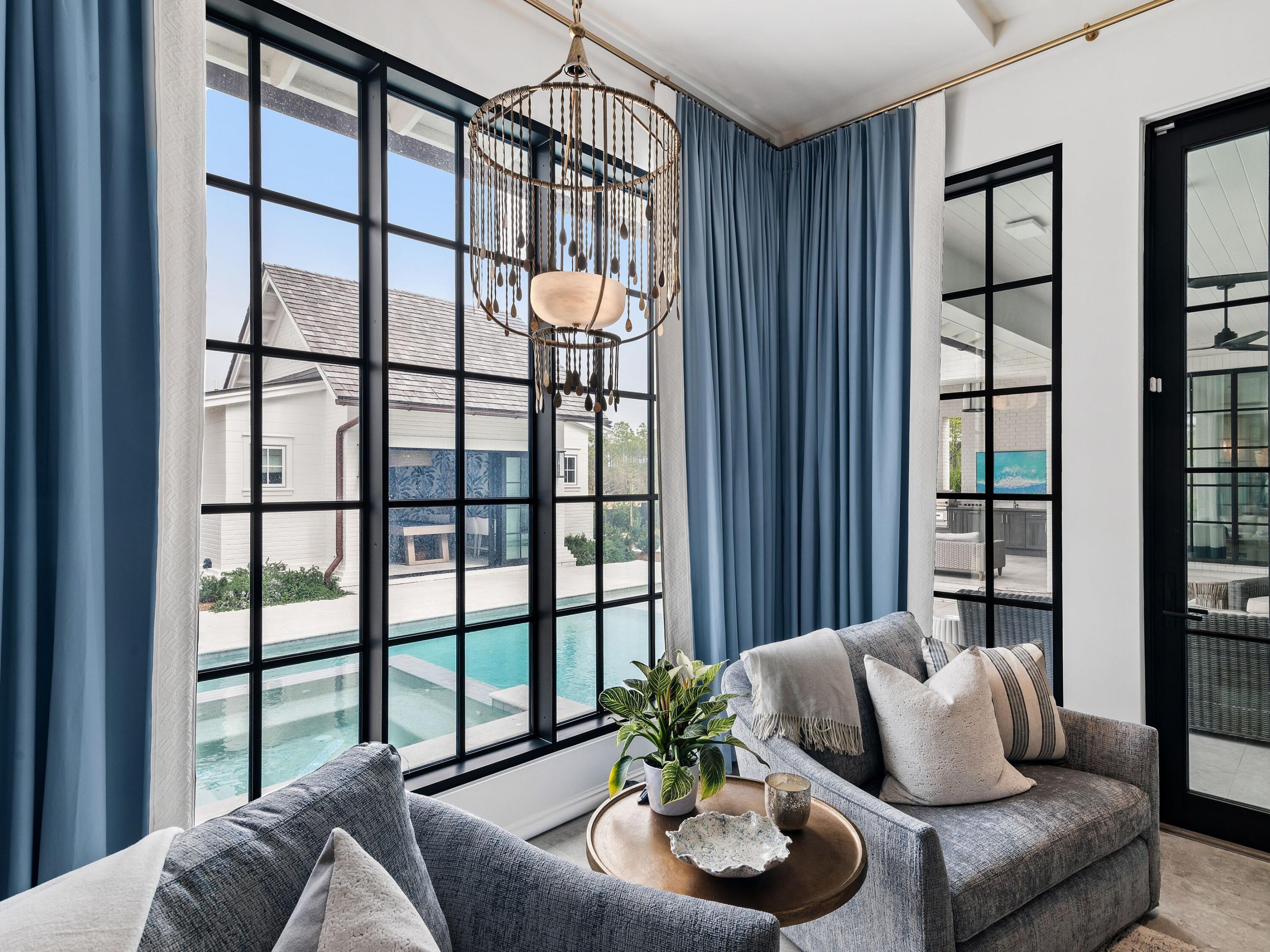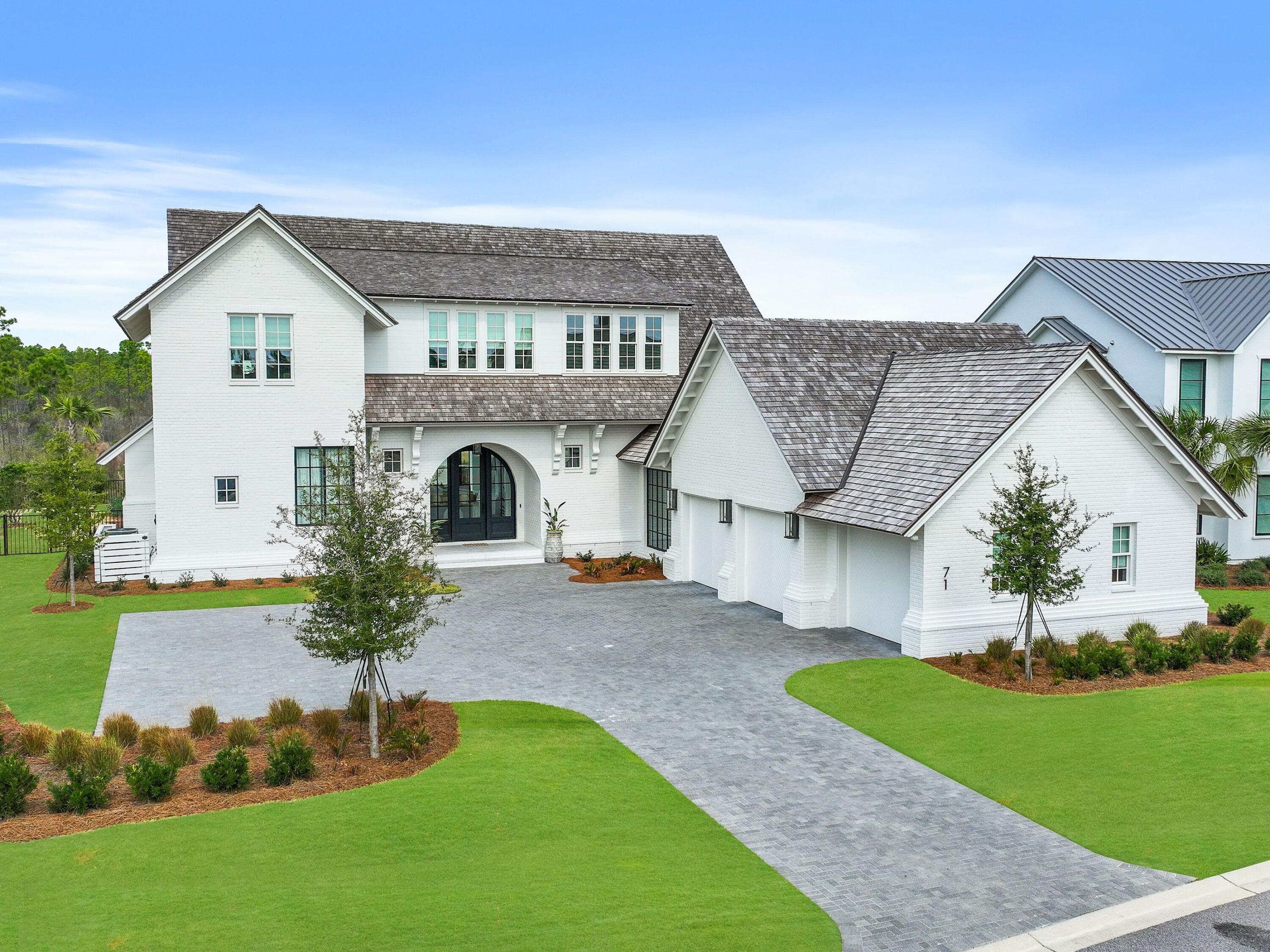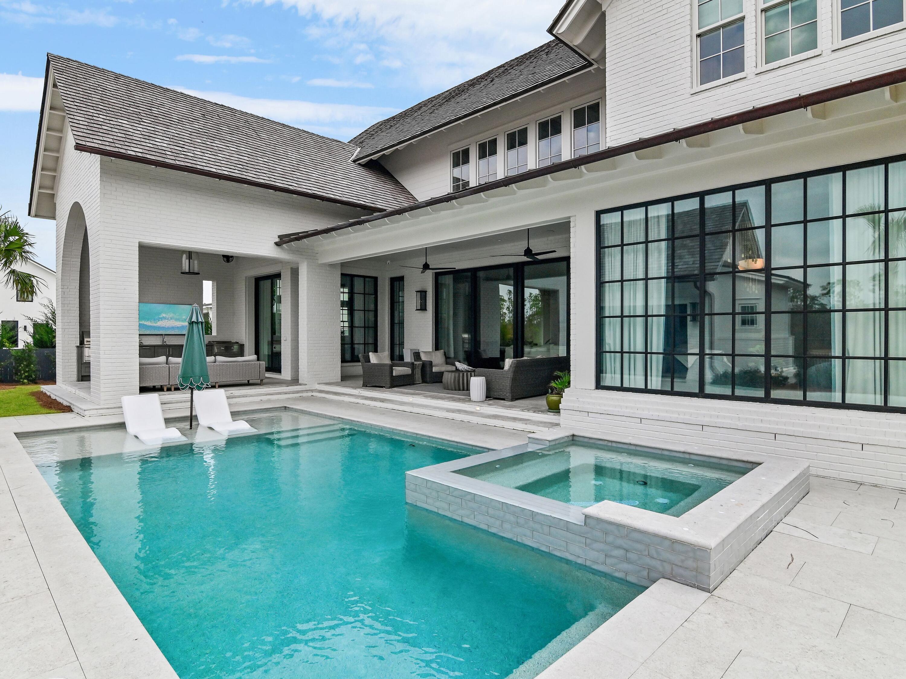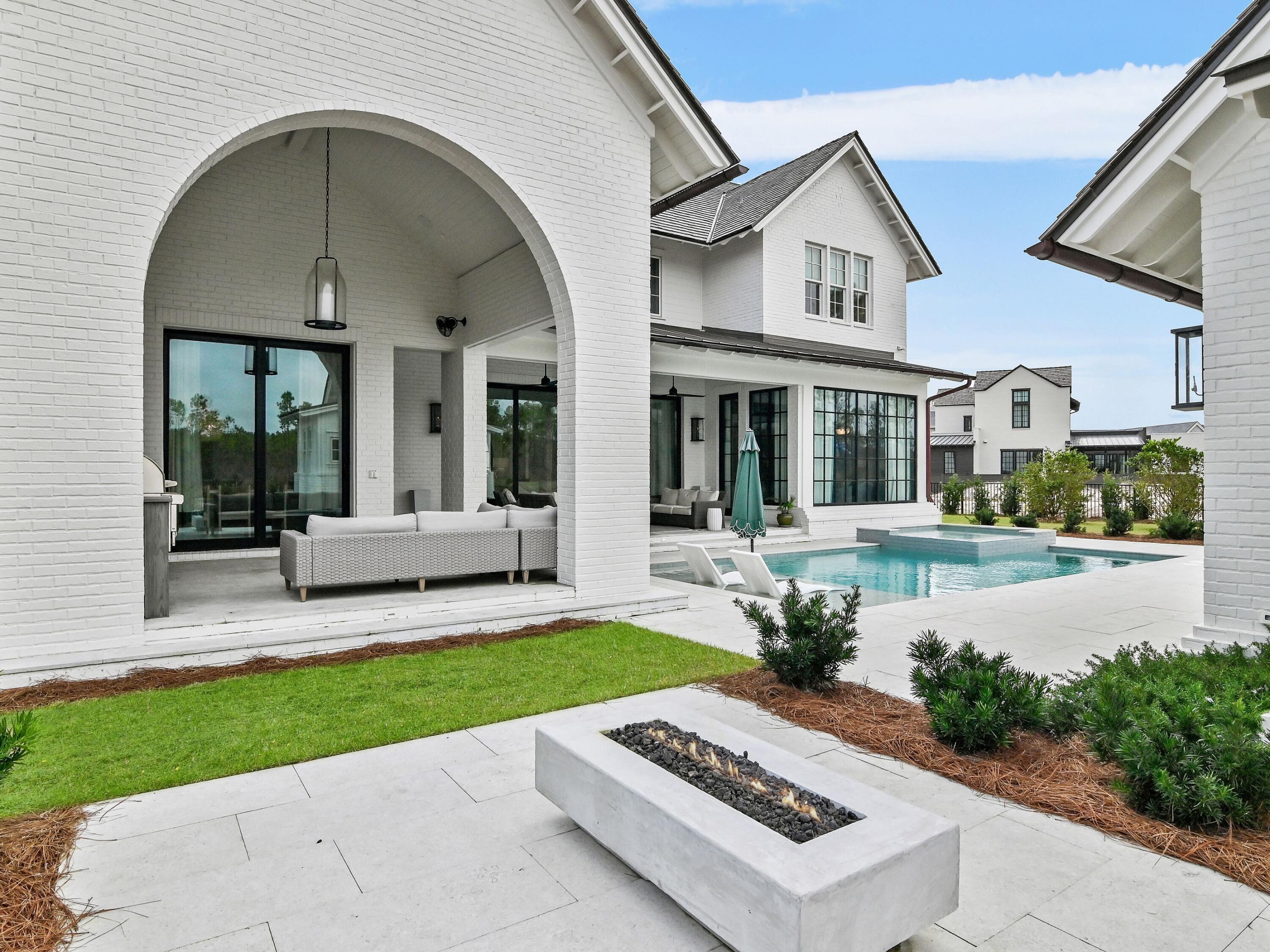 Thoughtfully designed by Greg Jazayeri, expertly built by Regal Stephens, and exquisitely finished and furnished by Tracery Interiors, this four-bedroom, five-and-a-half-bath custom home in Watersound Camp Creek embodies craftsmanship at its highest level. From the moment you enter, every detail reflects artistry and intention -- from the coral stone floors that flow seamlessly indoors and out to the natural marble and quartzite countertops and handcrafted Grimes cabinetry.The primary suite is located on the main level, creating an easy rhythm between private retreat and open gathering space. Expansive sliders blur the line between the living room and the outdoor entertaining area, where dual grills, a spa, and a cabana with pool table set the tone for relaxed sophistication. Distinctive architectural features include all-brick construction with custom Hardie accents, a wood shingle roof, eight Bevolo gas lanterns, and custom steel windows and doors that flood the home with natural light.