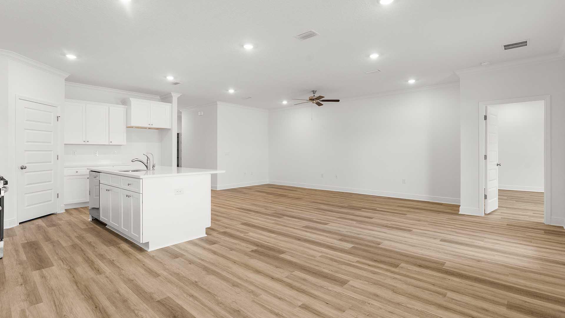 The primary bedroom is at the back of the home and has EVP flooring, a ceiling fan and an ensuite bathroom. The primary bathroom is designed with two spacious closets, a large shower and a dual sink vanity. With quartz countertops and lower cabinetry for storage. There are three guest bedrooms with two bedrooms located off the entry hall with a full bath in between and a fourth bedroom that could serve as an office space or den next to the laundry room. The laundry room offers space for a full-size washer and dryer.