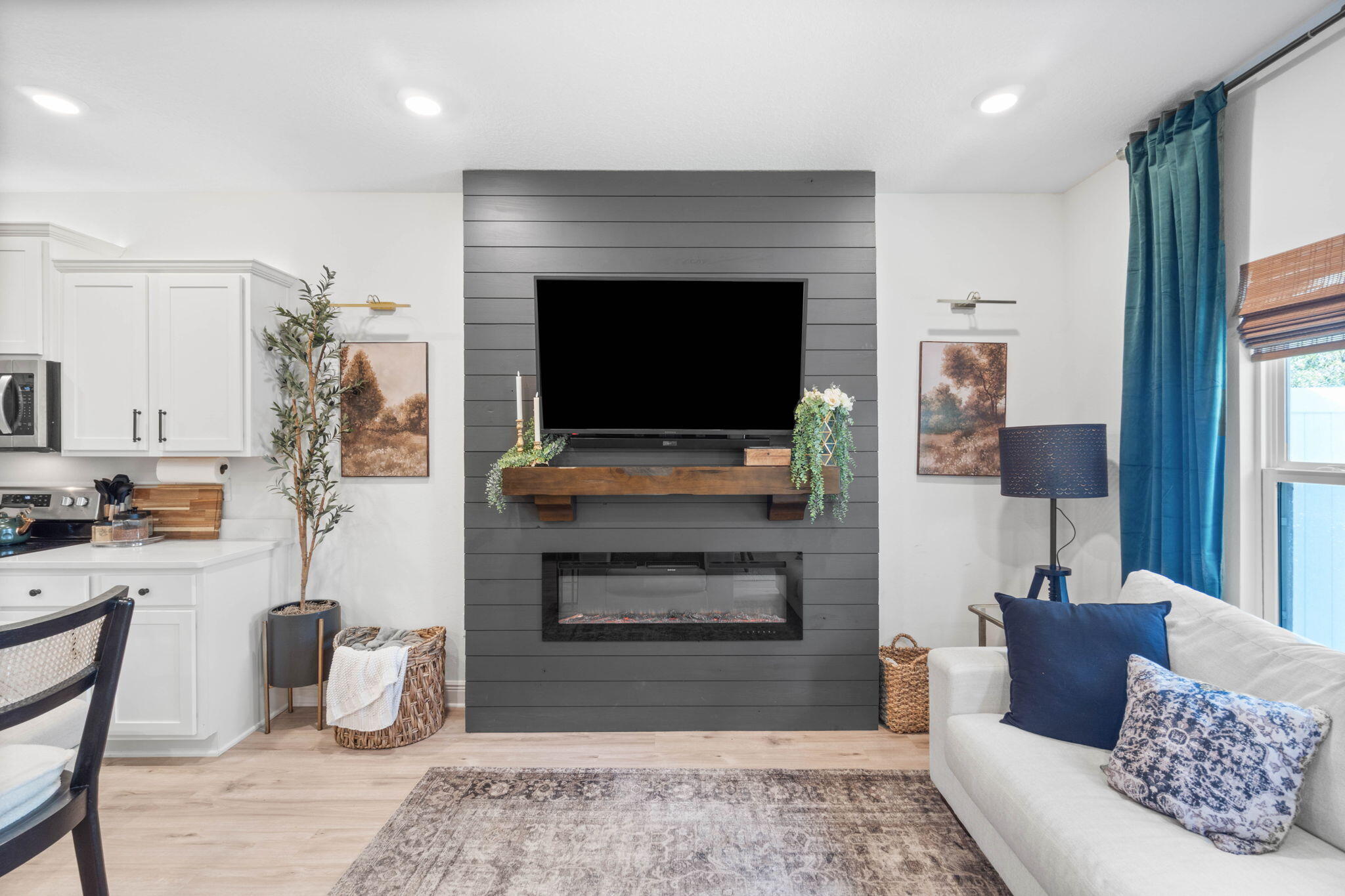 - A custom fireplace feature wall with shiplap paneling, hearth, electric fireplace, and universal TV mount