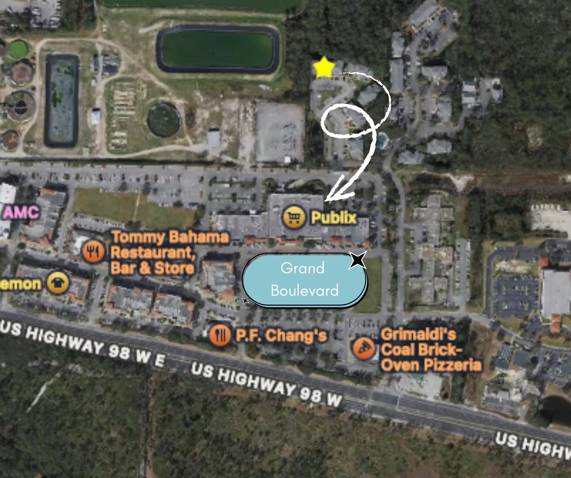 From 98 turn North on Sandestin lane by Publix Grand Boulevard. Follow back and take a left at the fork in the road when entering Pointe of View complex- it is the north building.